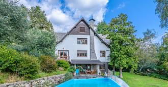 Cette résidence raffinée de style Tudor anglais traditionnel comprend une magnifique villa principale, un bâtiment séparé pour la sécurité et le personnel, ainsi qu'un vaste espace pour garage/entrepôt (anciennement une écurie) d'environ 400 m².