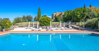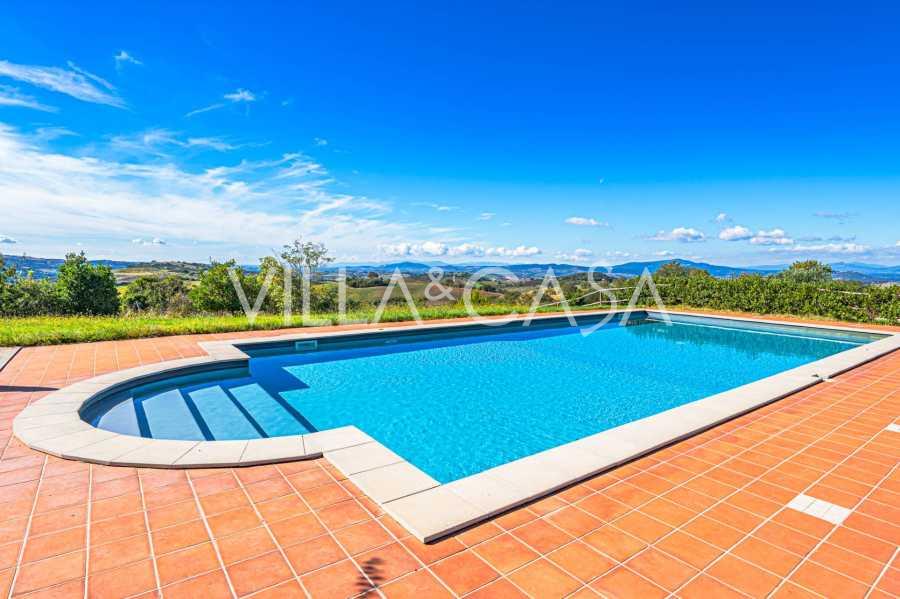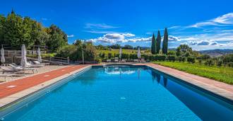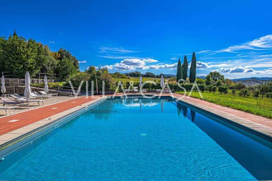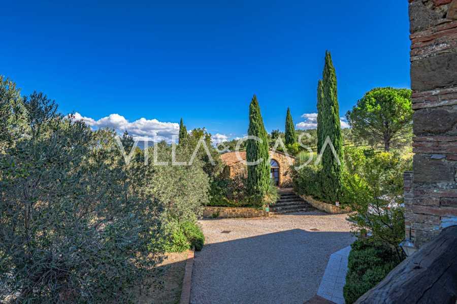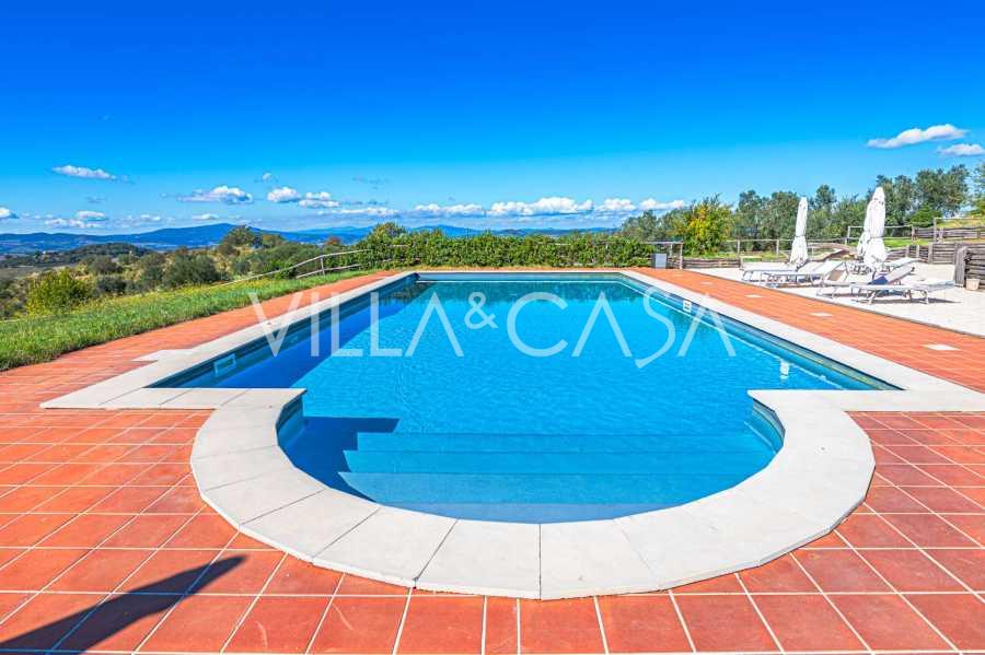 Le magnifique parc entourant la villa est conçu pour profiter pleinement de la nature : terrasses, haies fleuries, parfums de lavande et de romarin, ainsi que des panoramas impressionnants sur les collines toscanes. La piscine panoramique de 14x7 mètres avec un solarium en terre cuite et une terrasse pavée est idéale pour des réceptions somptueuses ou pour se détendre dans une atmosphère de tranquillité totale.