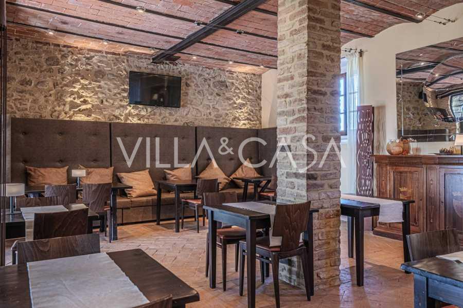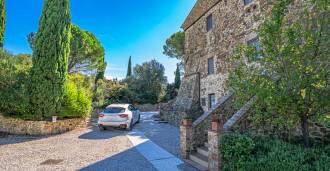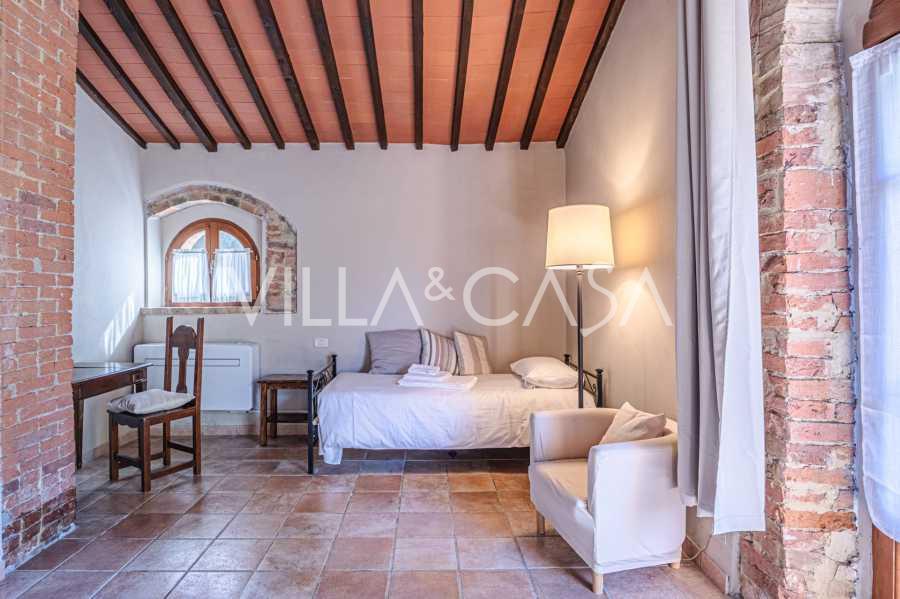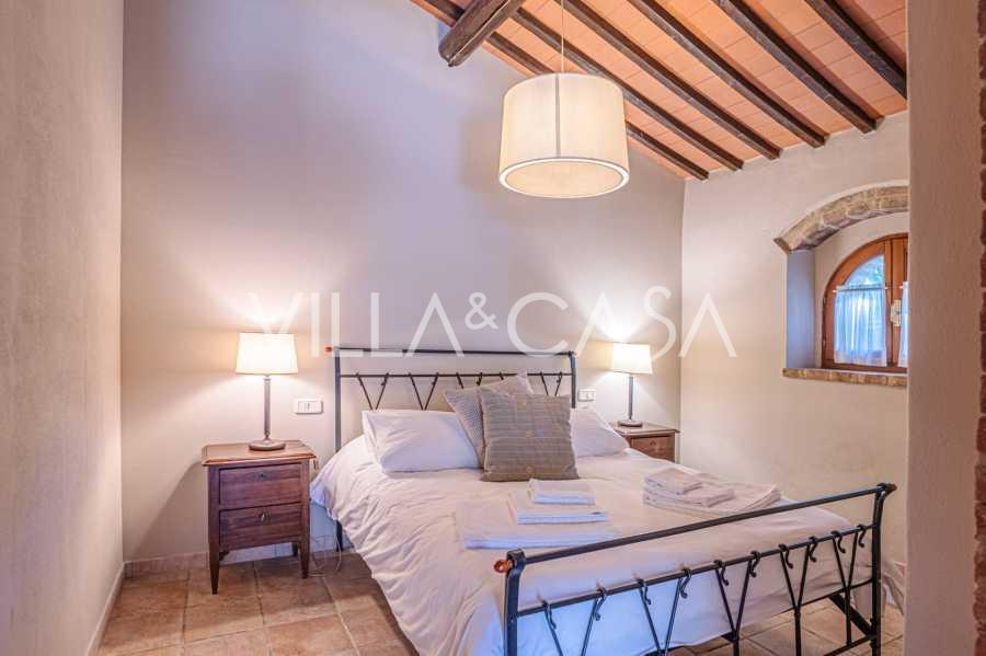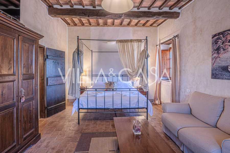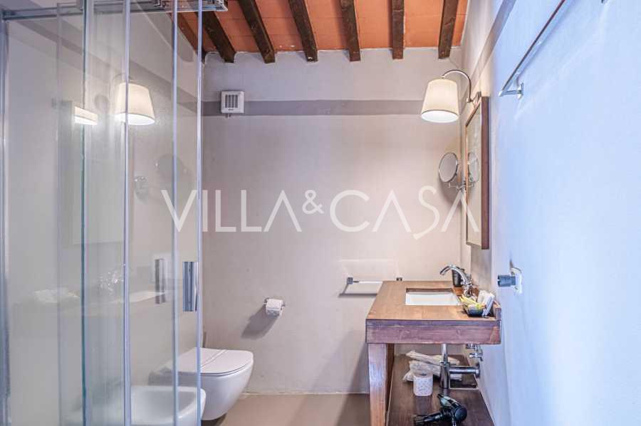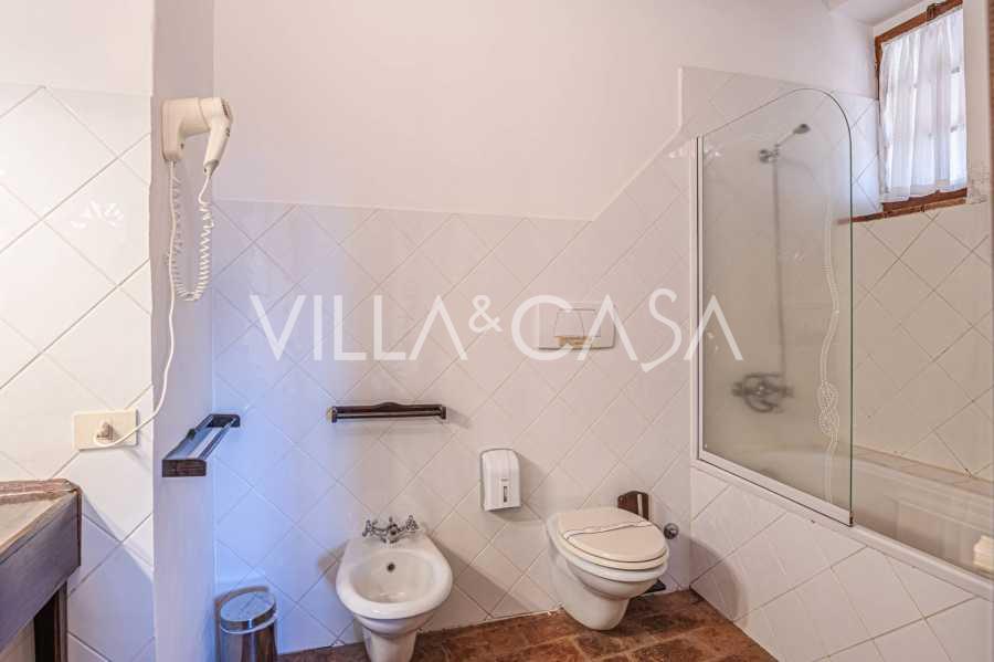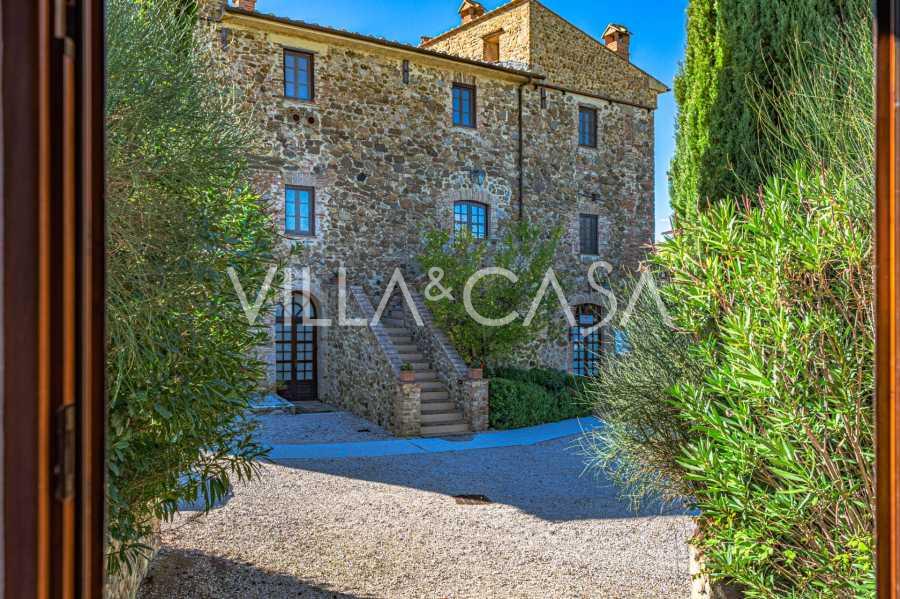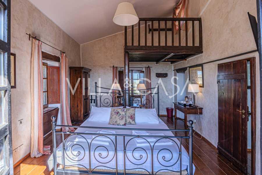 Le bâtiment principal, une majestueuse villa en pierre du XVIIe siècle, conserve le charme de son époque : sols en terre cuite, arcs en briques, poutres massives au plafond et éléments décoratifs raffinés. Chaque détail témoigne de l'authenticité et du goût raffiné. Les systèmes modernes, tels que le chauffage par pompe à chaleur, les salles de bains rénovées et les matériaux de finition de haute qualité, assurent un confort absolu en toute saison.