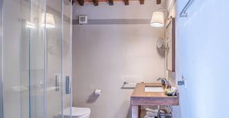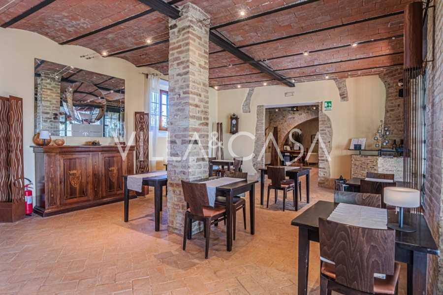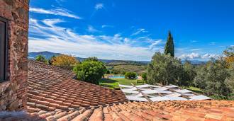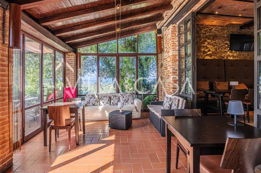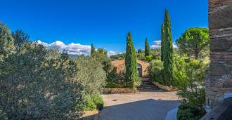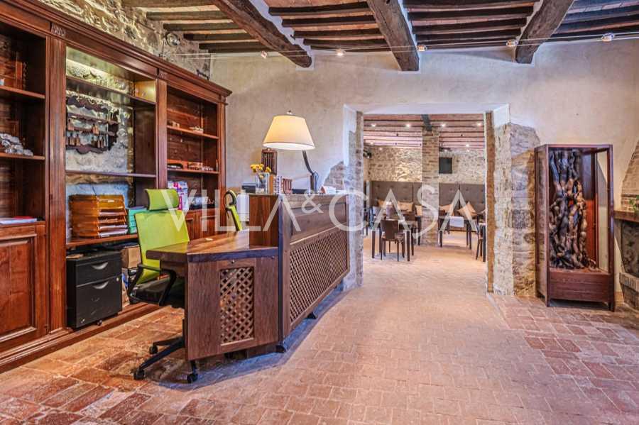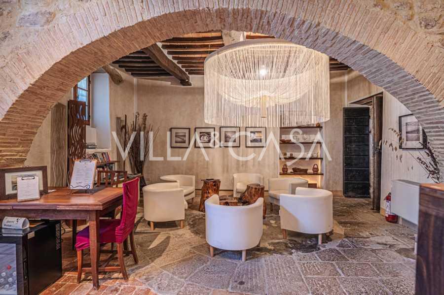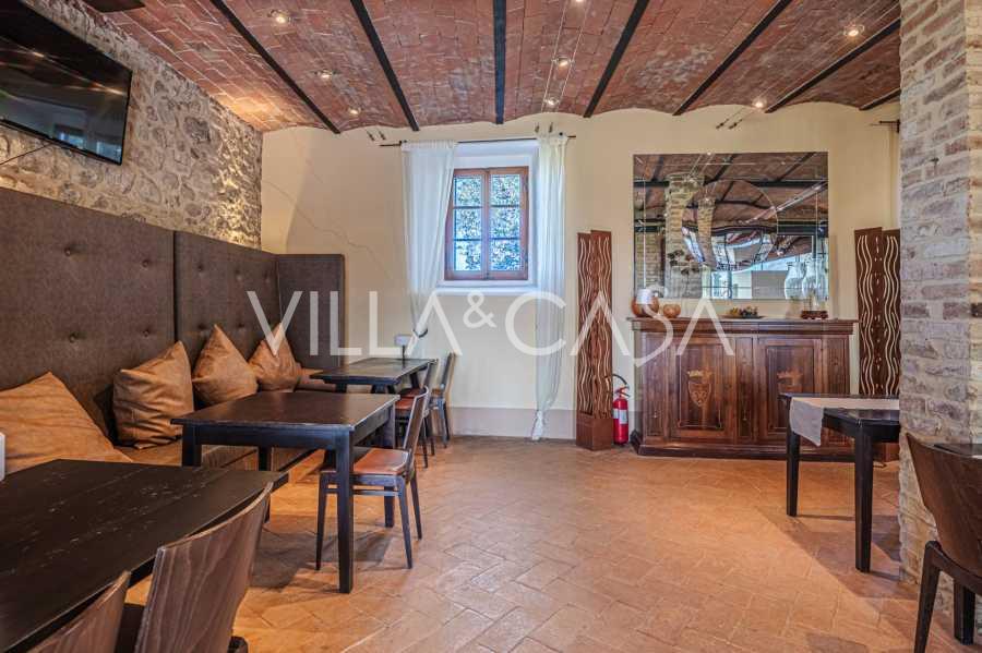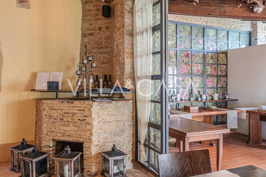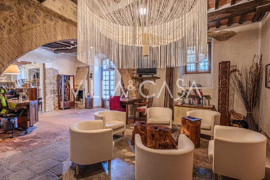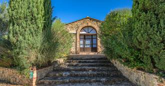 Le bâtiment principal, une majestueuse villa en pierre du XVIIe siècle, conserve le charme de son époque : sols en terre cuite, arcs en briques, poutres massives au plafond et éléments décoratifs raffinés. Chaque détail témoigne de l'authenticité et du goût raffiné. Les systèmes modernes, tels que le chauffage par pompe à chaleur, les salles de bains rénovées et les matériaux de finition de haute qualité, assurent un confort absolu en toute saison.