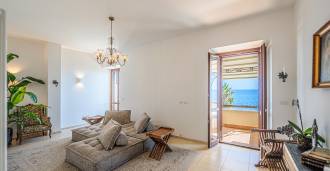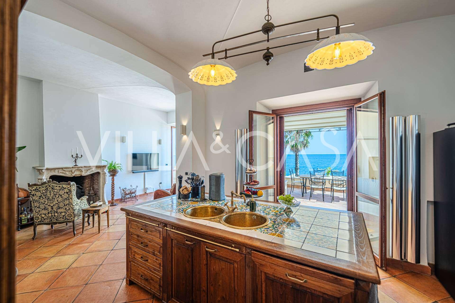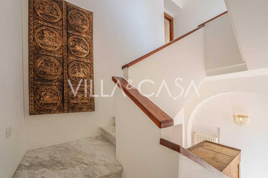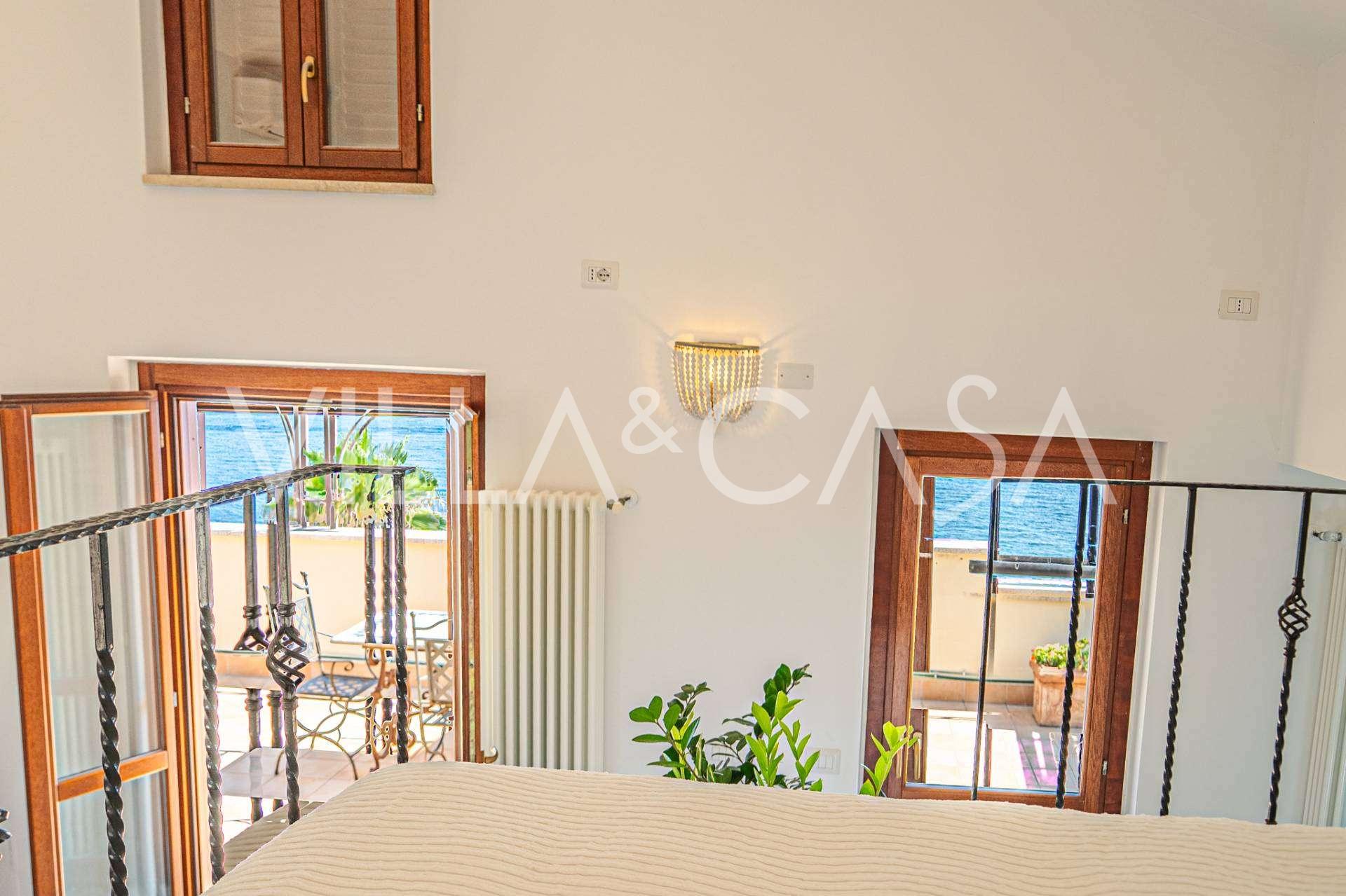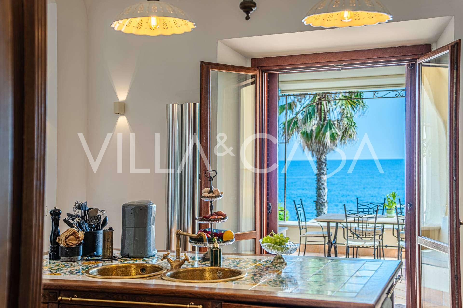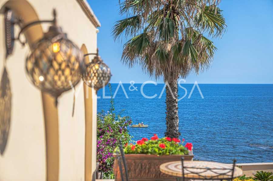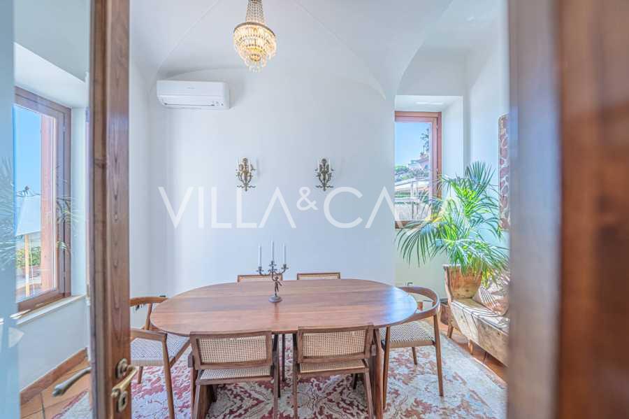 Les fenêtres offrent une vue panoramique à 180 degrés sur la mer, l'horizon bleu remplit chaque espace intérieur et s'étend jusqu'aux larges terrasses panoramiques. Les espaces intérieurs, avec des plafonds de plus de trois mètres de hauteur, des sols en terre cuite de l'époque, un escalier en marbre et une cheminée, créent une atmosphère d'élégance raffinée et intemporelle.
