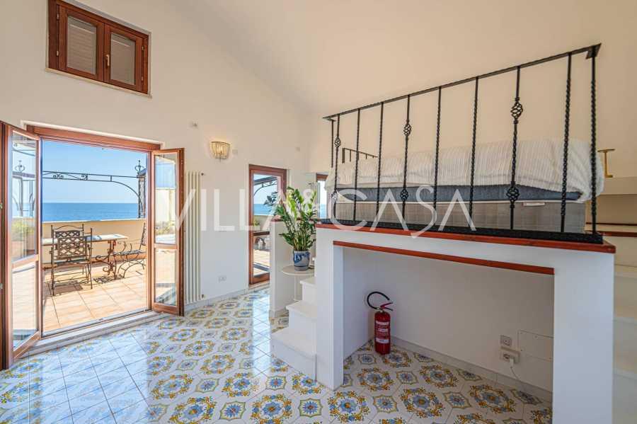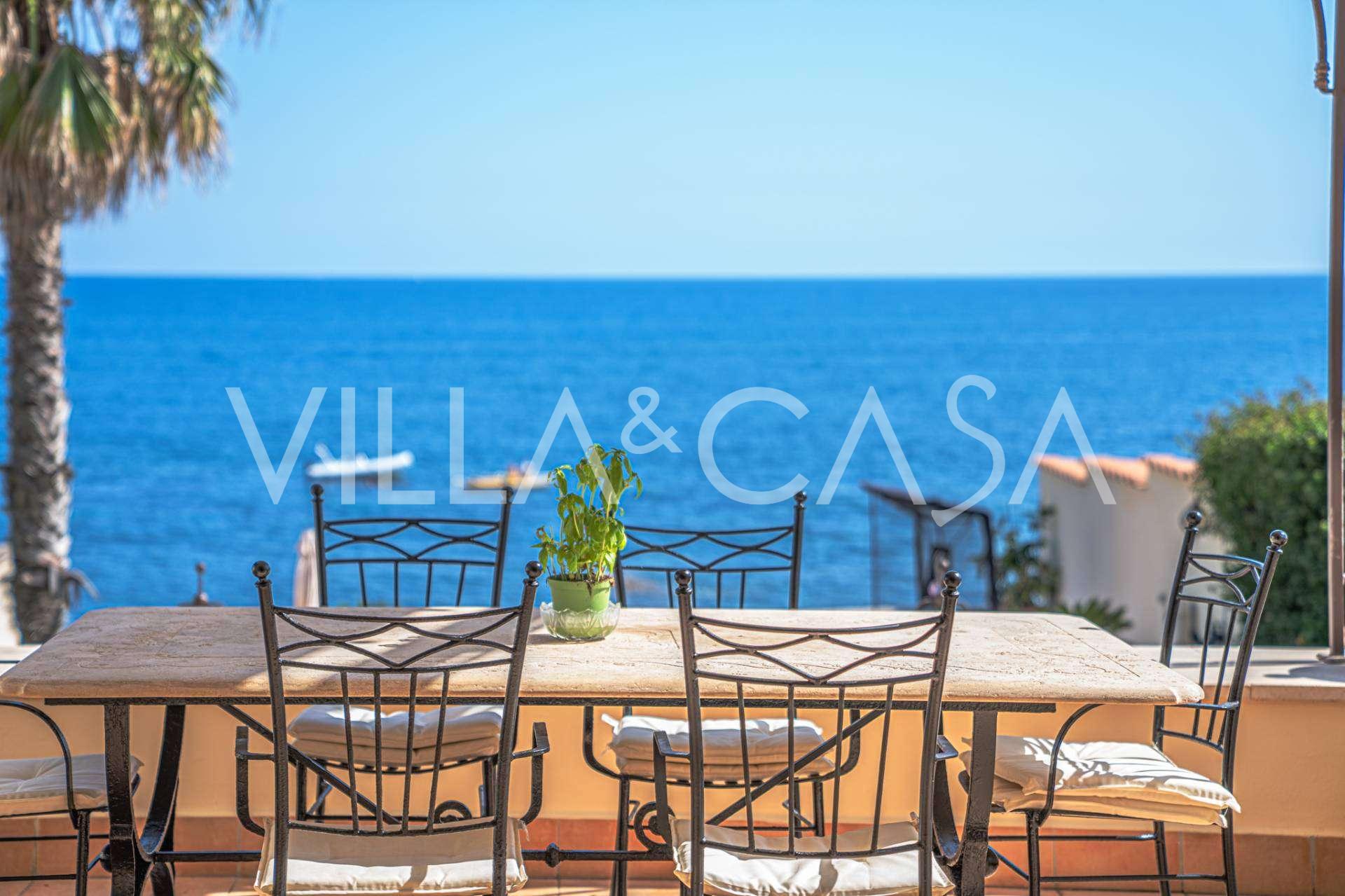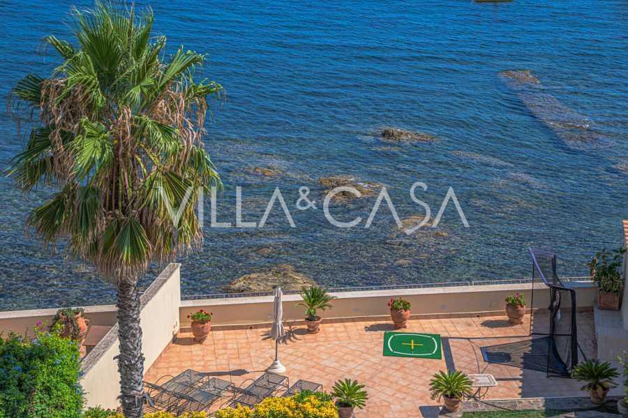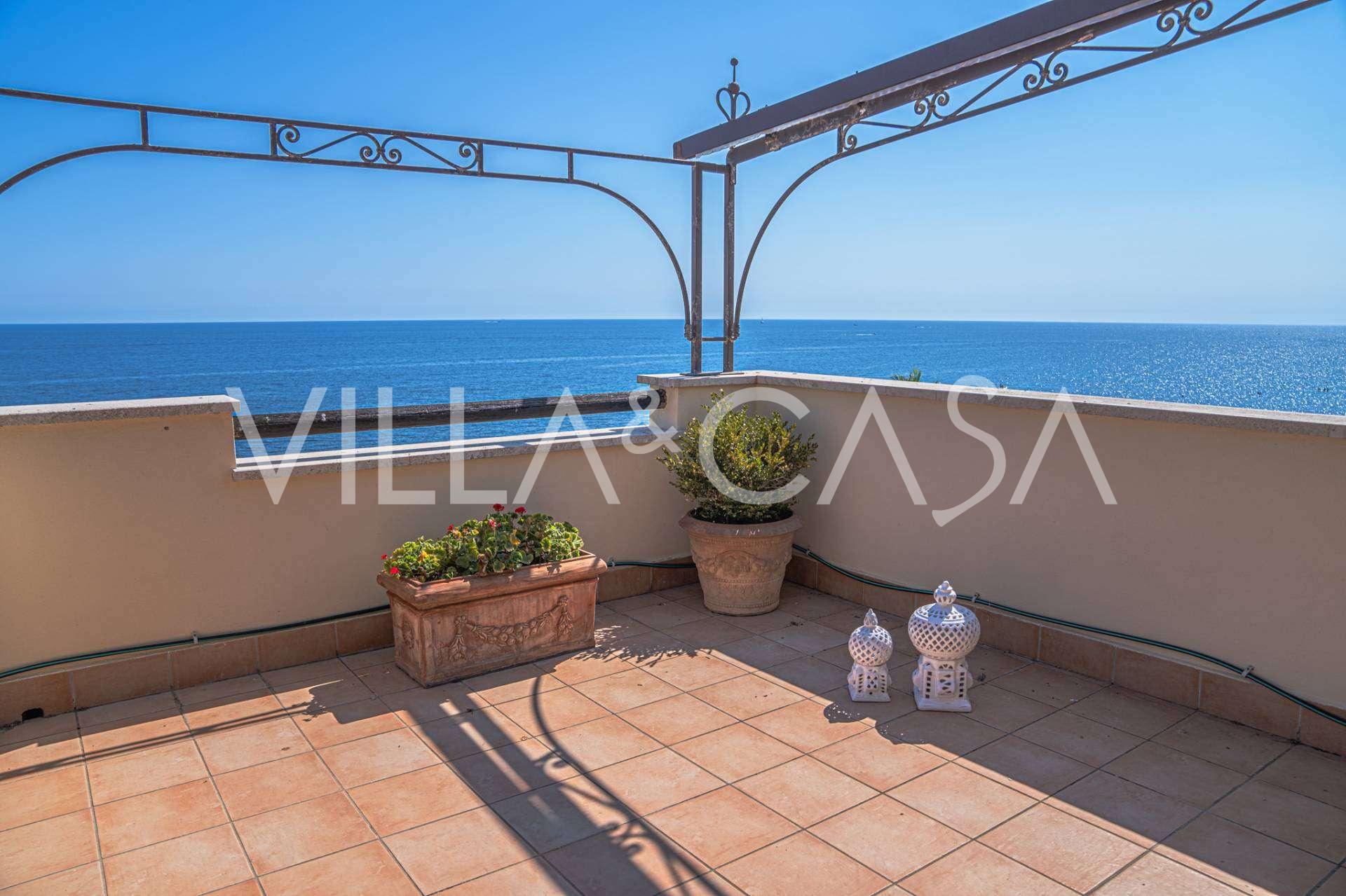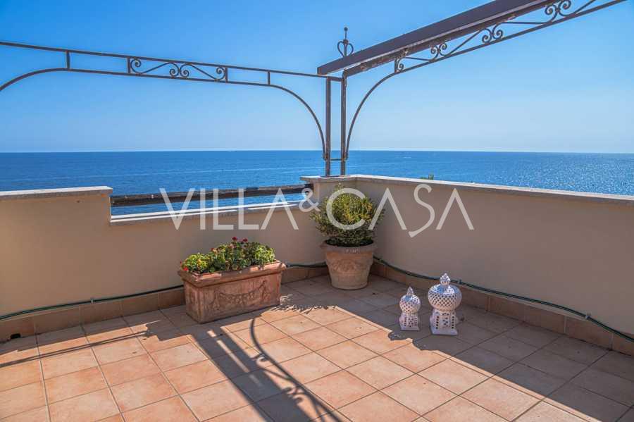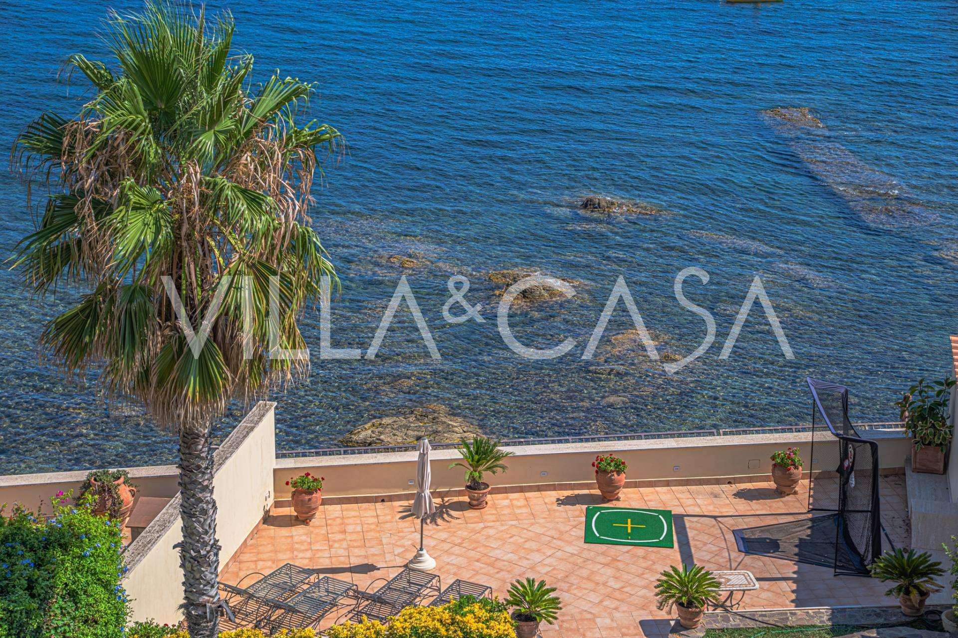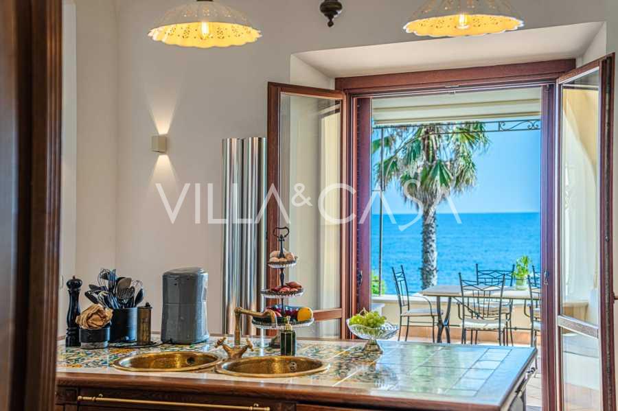 Les fenêtres offrent une vue panoramique à 180 degrés sur la mer, l'horizon bleu remplit chaque espace intérieur et s'étend jusqu'aux larges terrasses panoramiques. Les espaces intérieurs, avec des plafonds de plus de trois mètres de hauteur, des sols en terre cuite de l'époque, un escalier en marbre et une cheminée, créent une atmosphère d'élégance raffinée et intemporelle.