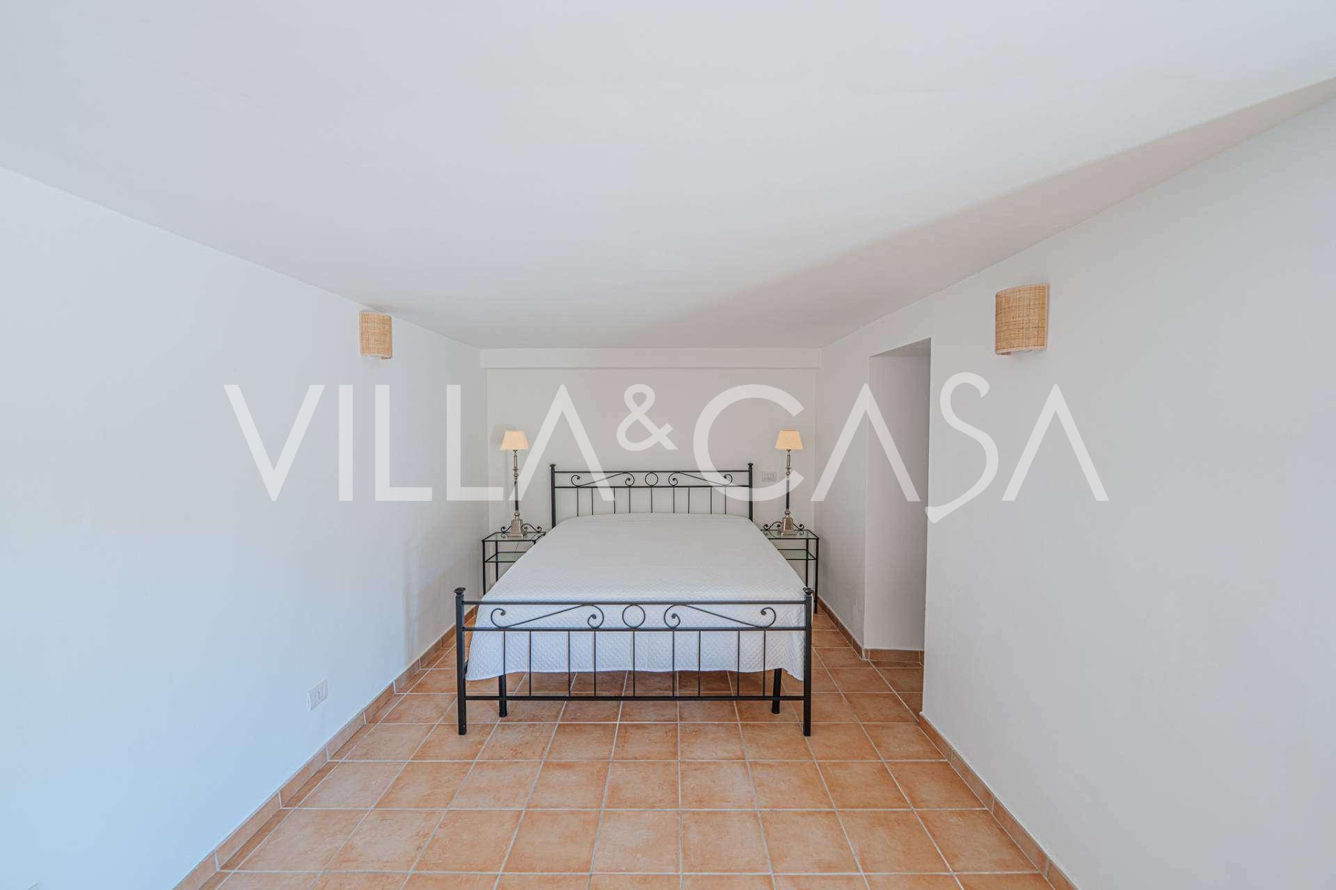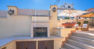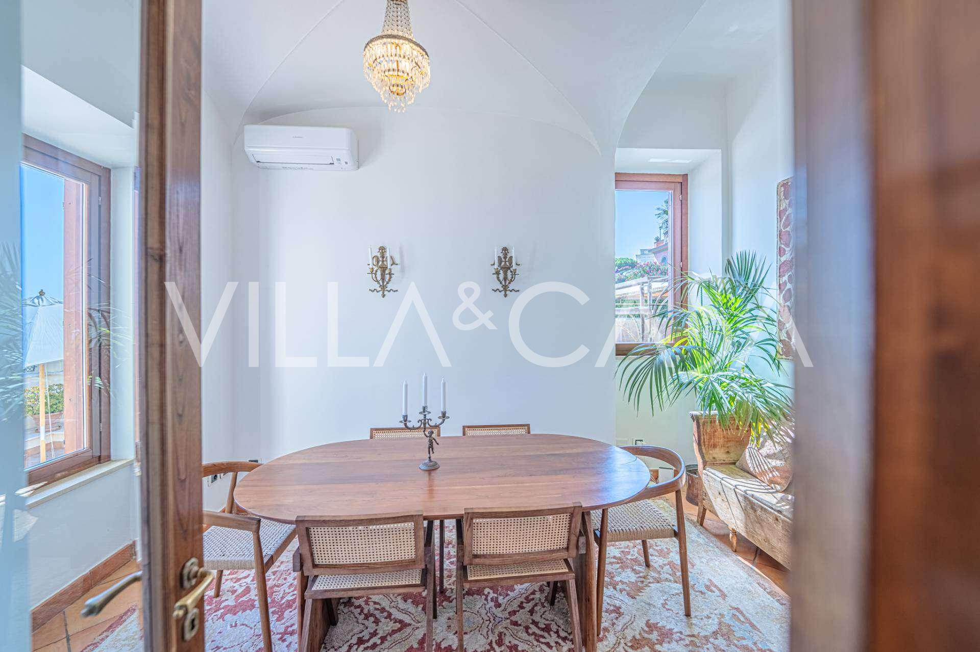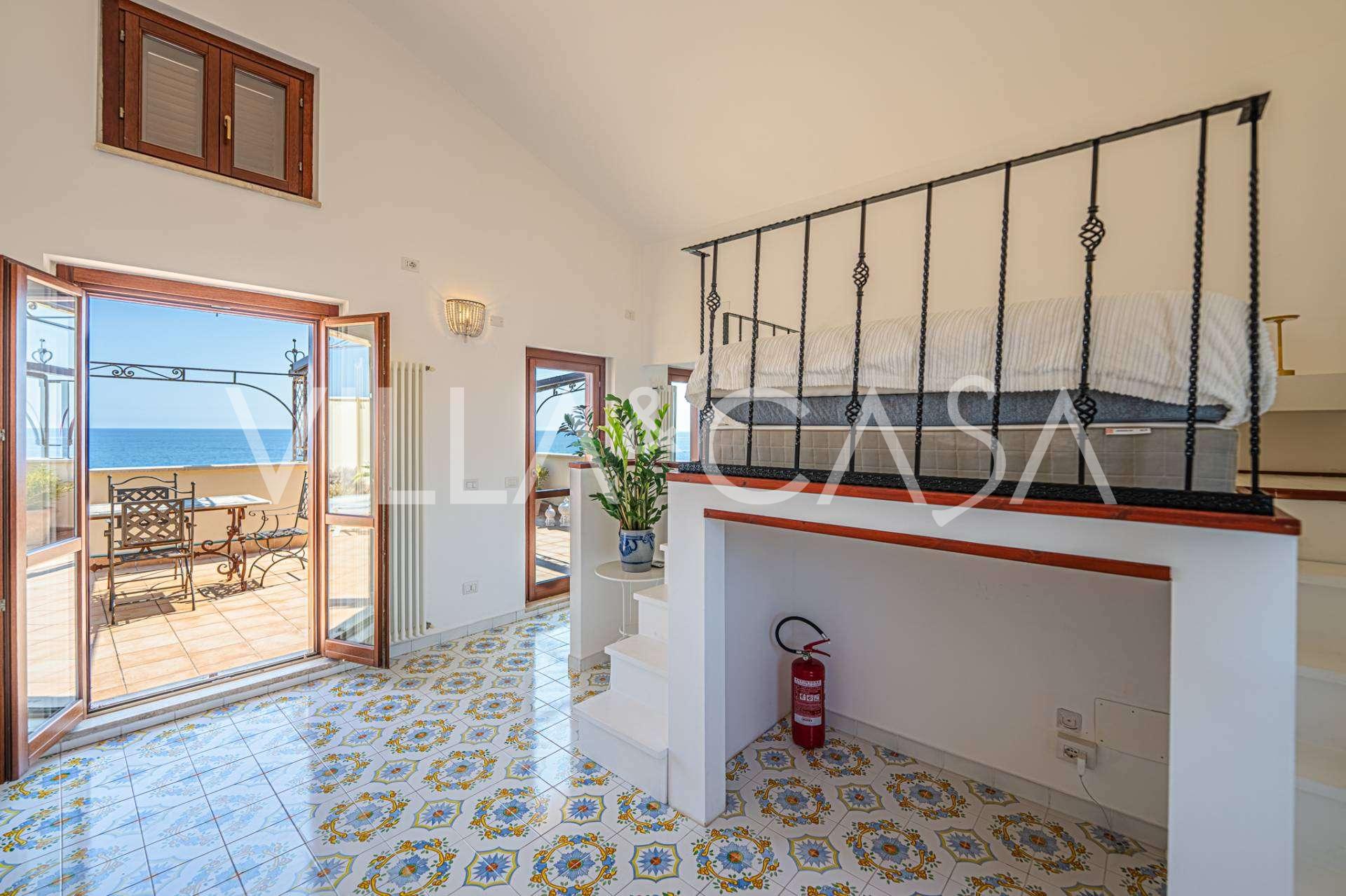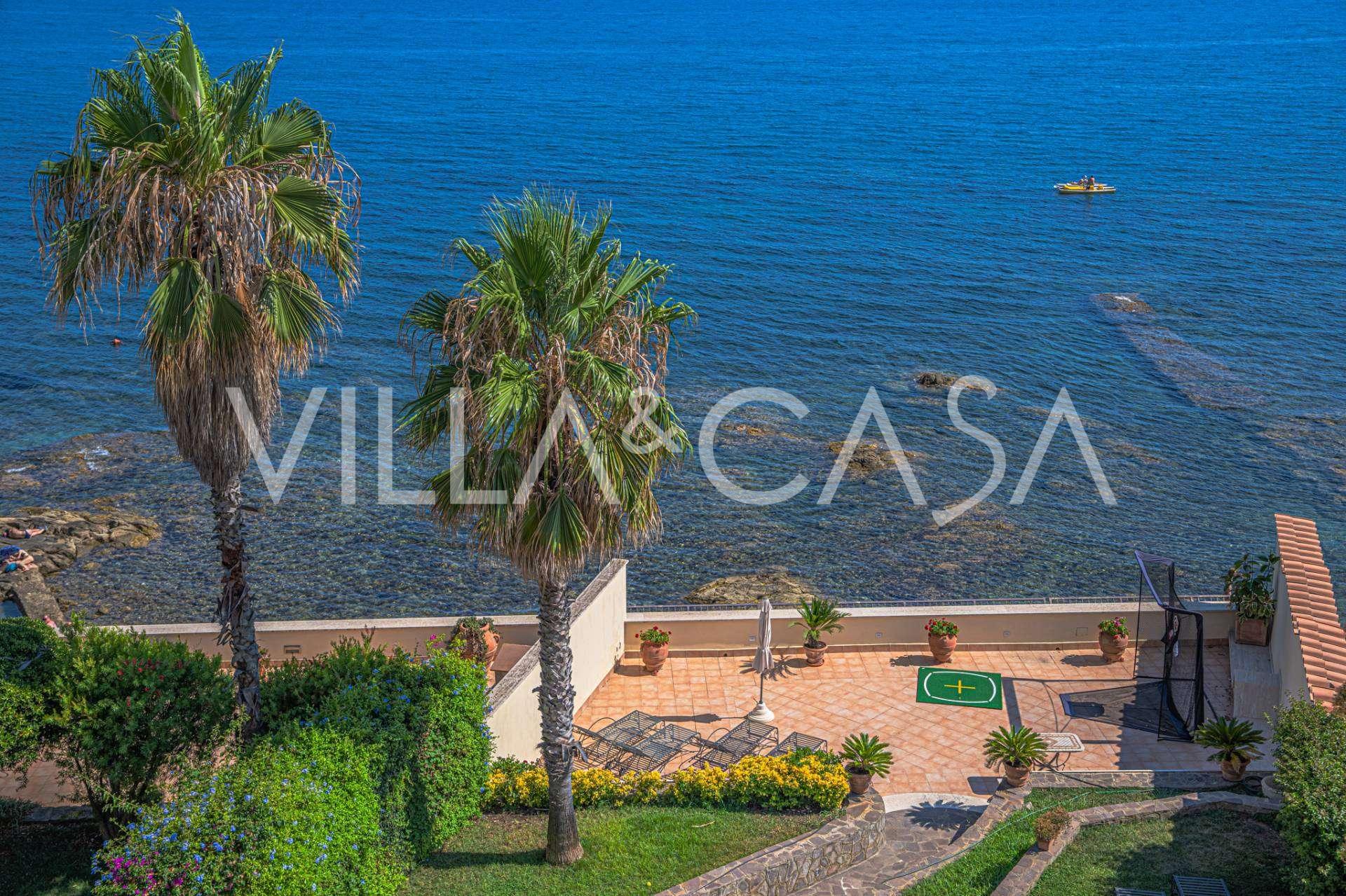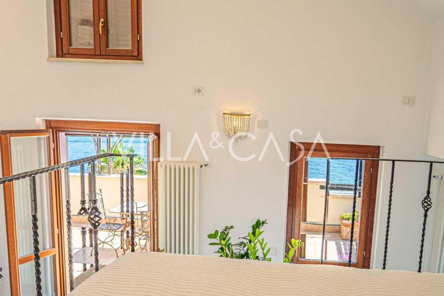 Les fenêtres offrent une vue panoramique à 180 degrés sur la mer, l'horizon bleu remplit chaque espace intérieur et s'étend jusqu'aux larges terrasses panoramiques. Les espaces intérieurs, avec des plafonds de plus de trois mètres de hauteur, des sols en terre cuite de l'époque, un escalier en marbre et une cheminée, créent une atmosphère d'élégance raffinée et intemporelle.