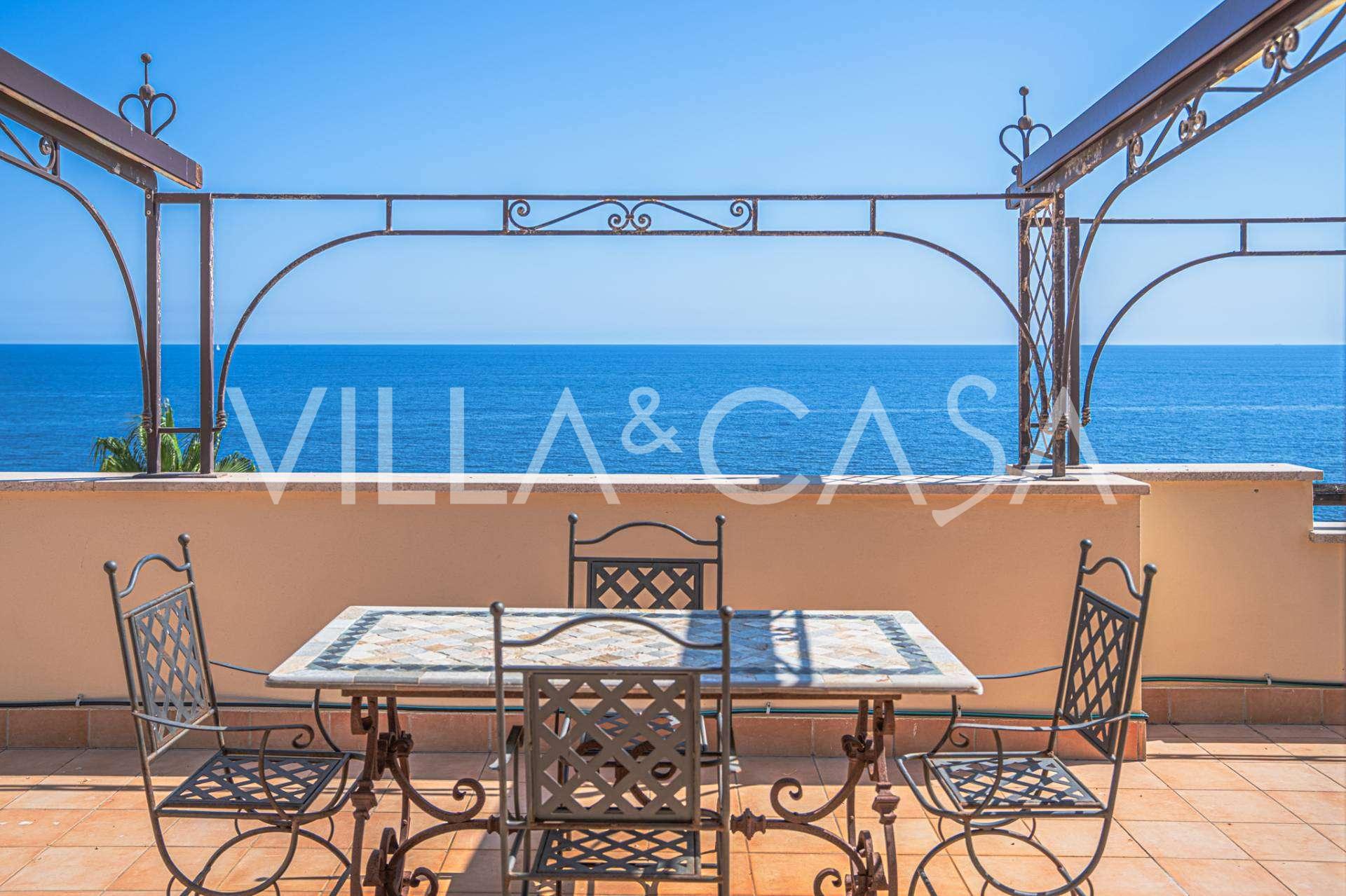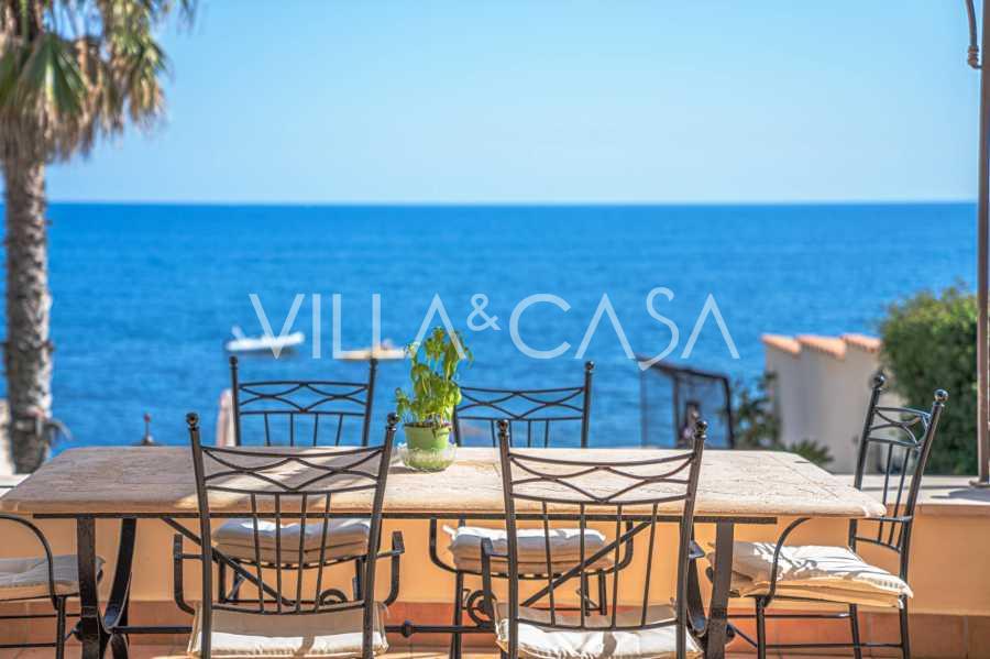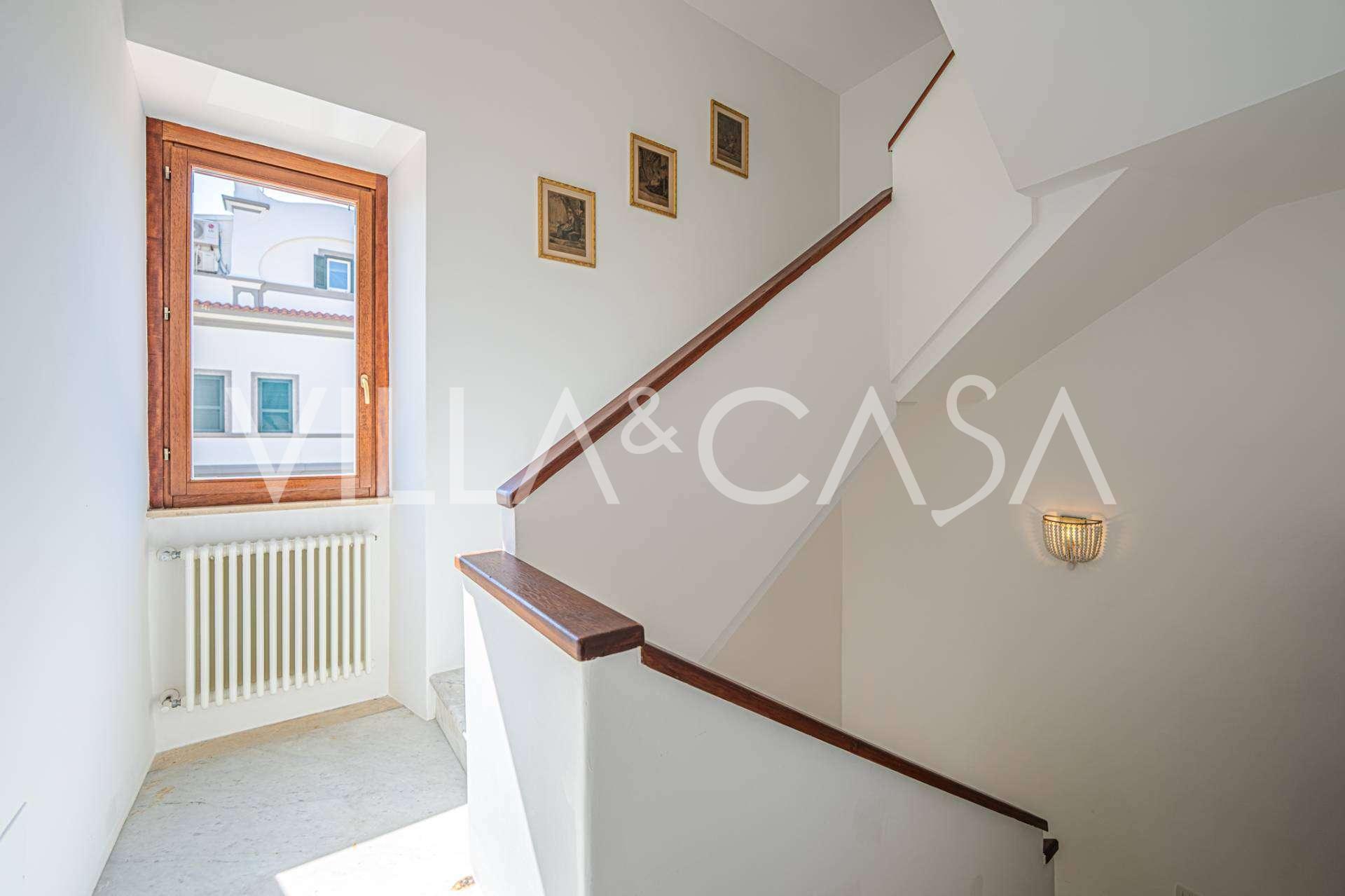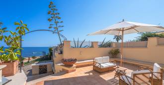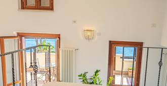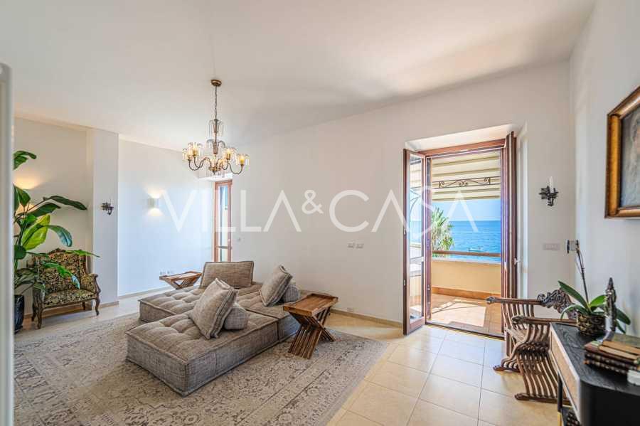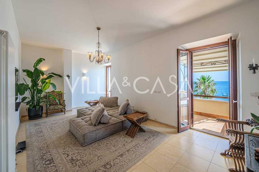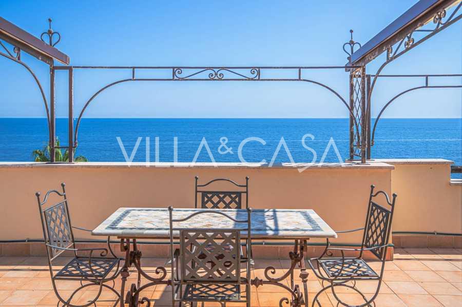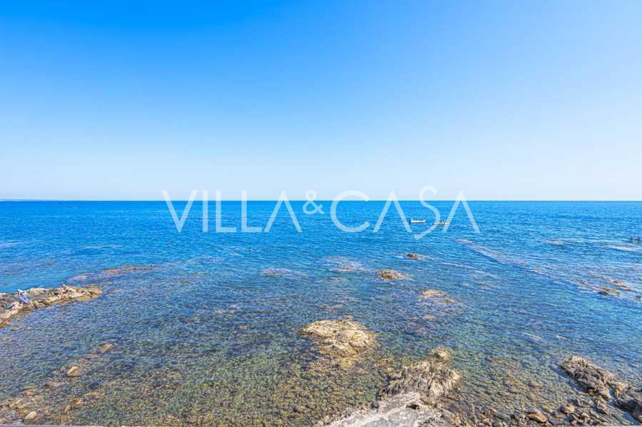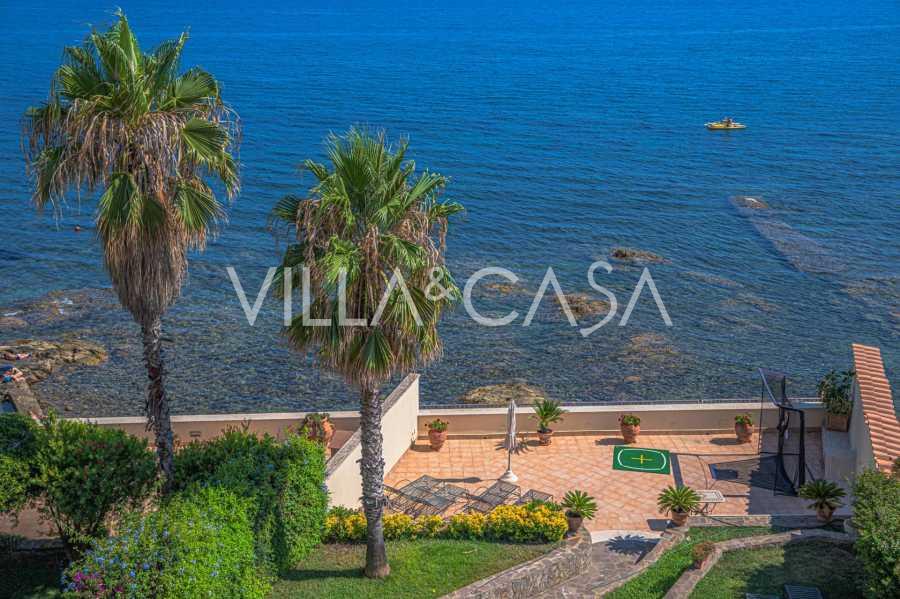Les fenêtres offrent une vue panoramique à 180 degrés sur la mer, l'horizon bleu remplit chaque espace intérieur et s'étend jusqu'aux larges terrasses panoramiques. Les espaces intérieurs, avec des plafonds de plus de trois mètres de hauteur, des sols en terre cuite de l'époque, un escalier en marbre et une cheminée, créent une atmosphère d'élégance raffinée et intemporelle.