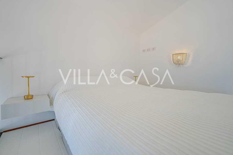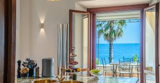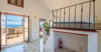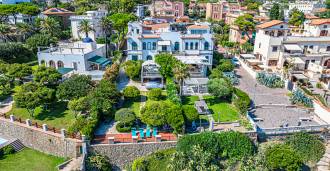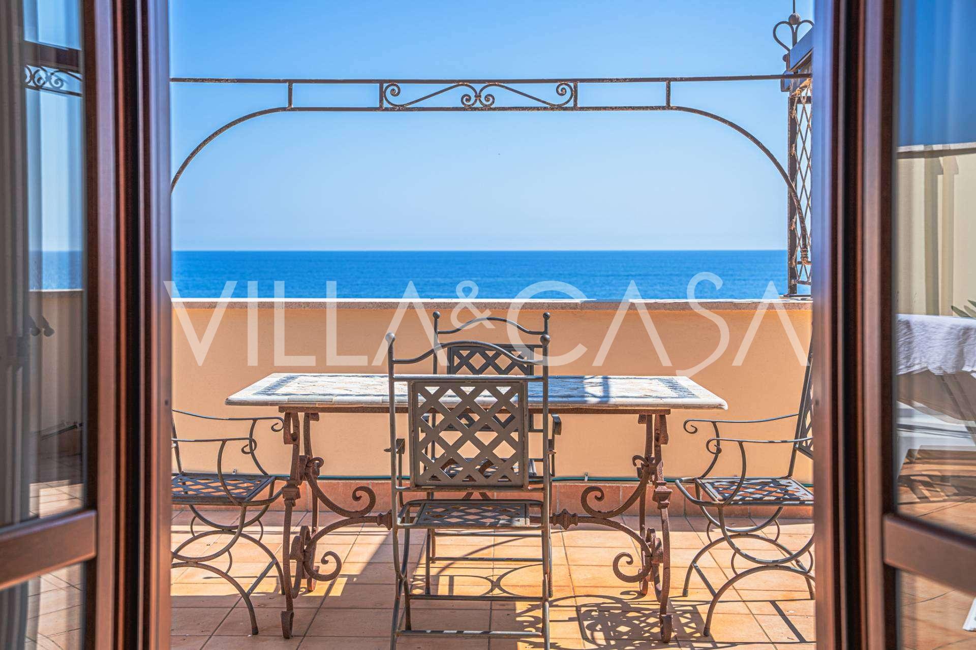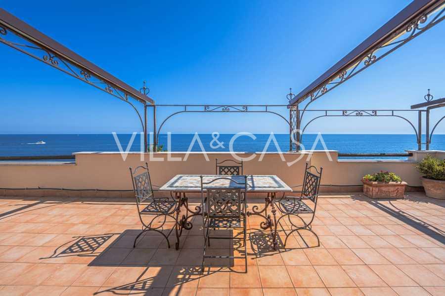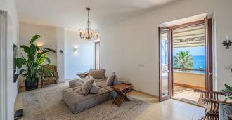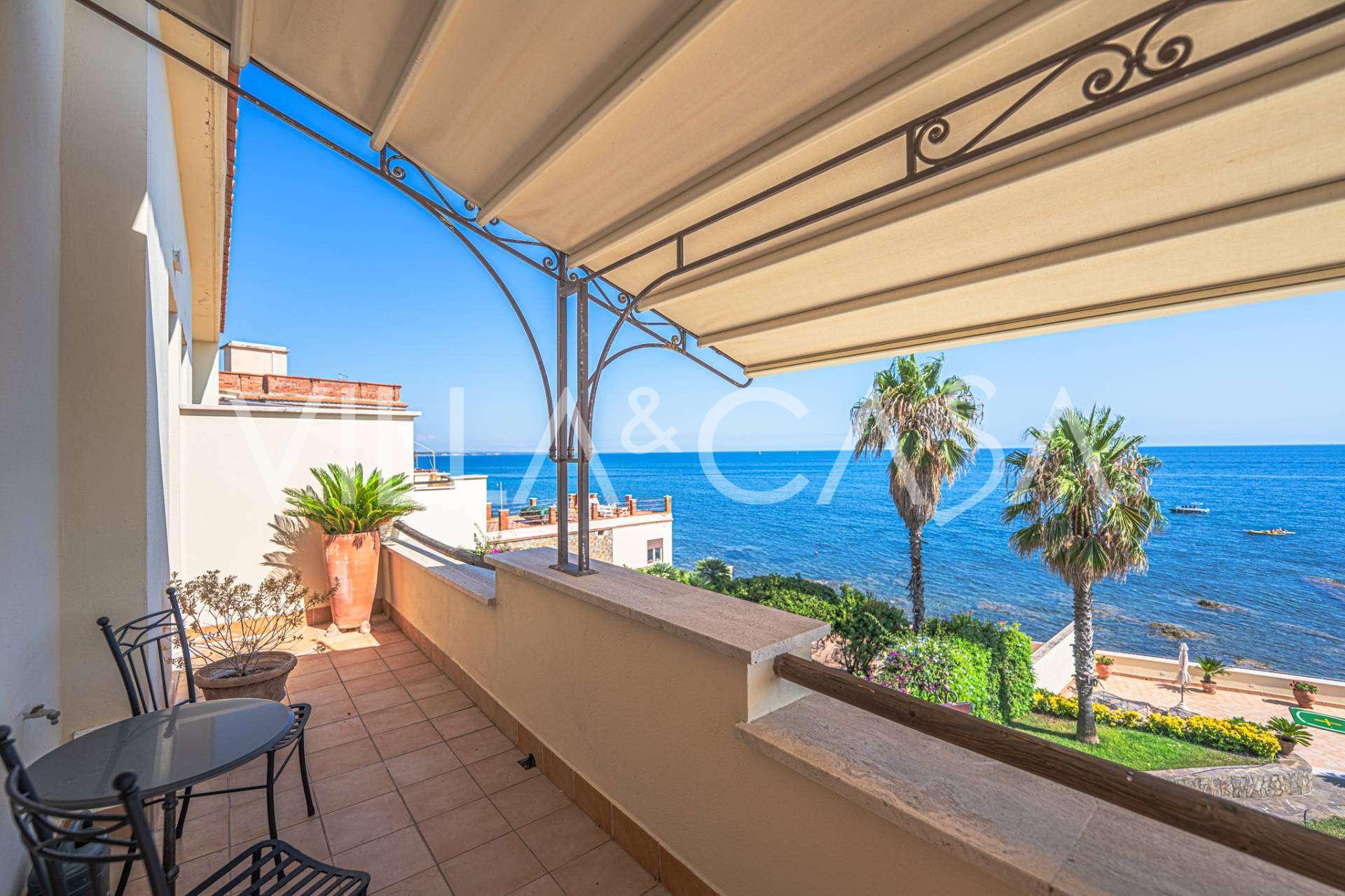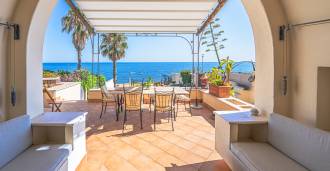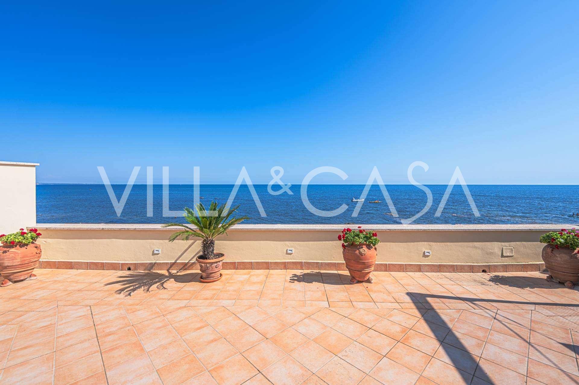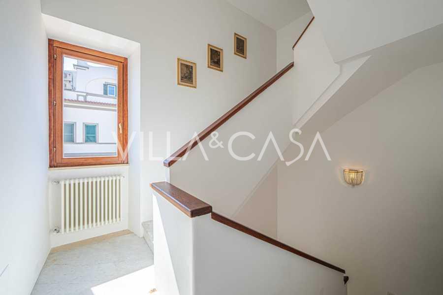 Les fenêtres offrent une vue panoramique à 180 degrés sur la mer, l'horizon bleu remplit chaque espace intérieur et s'étend jusqu'aux larges terrasses panoramiques. Les espaces intérieurs, avec des plafonds de plus de trois mètres de hauteur, des sols en terre cuite de l'époque, un escalier en marbre et une cheminée, créent une atmosphère d'élégance raffinée et intemporelle.