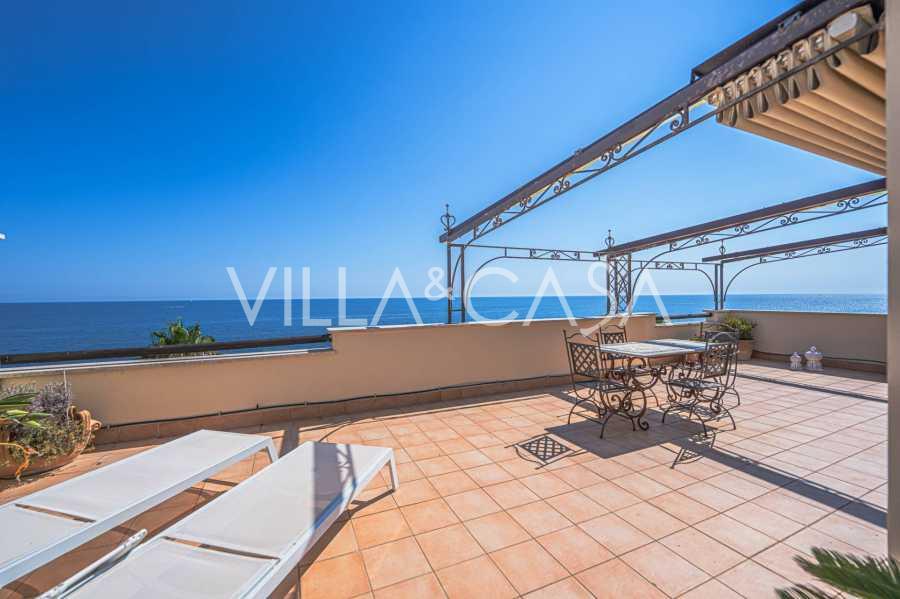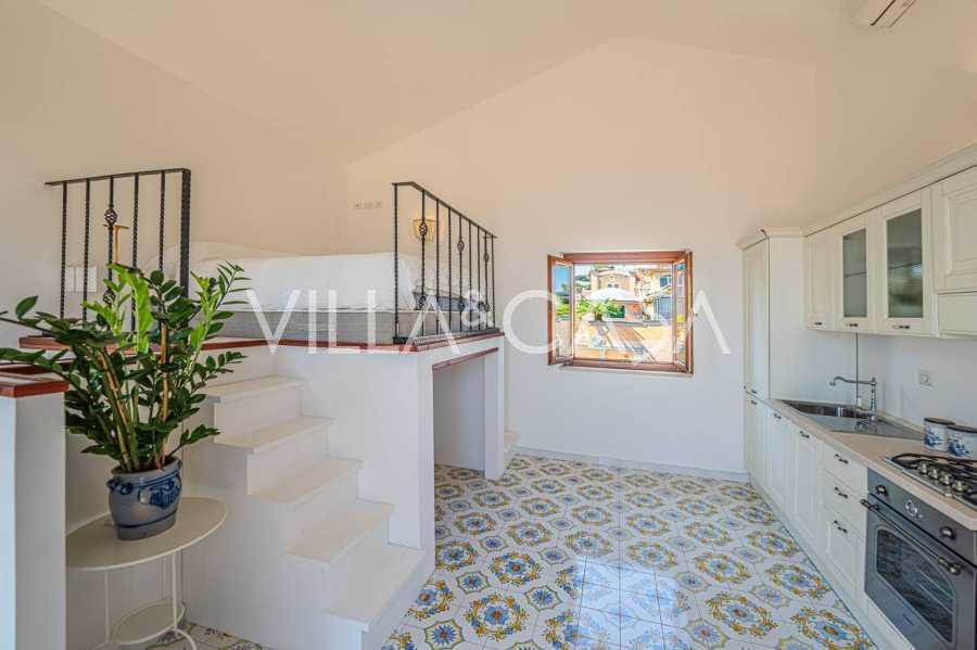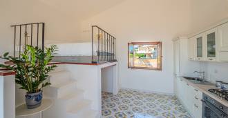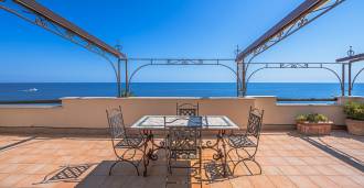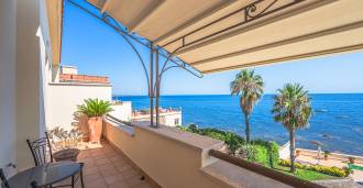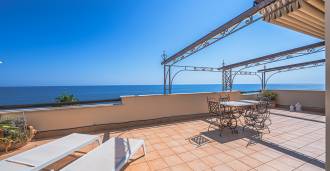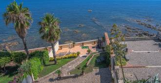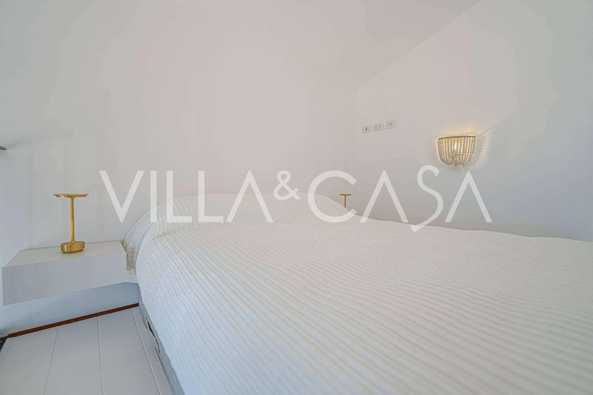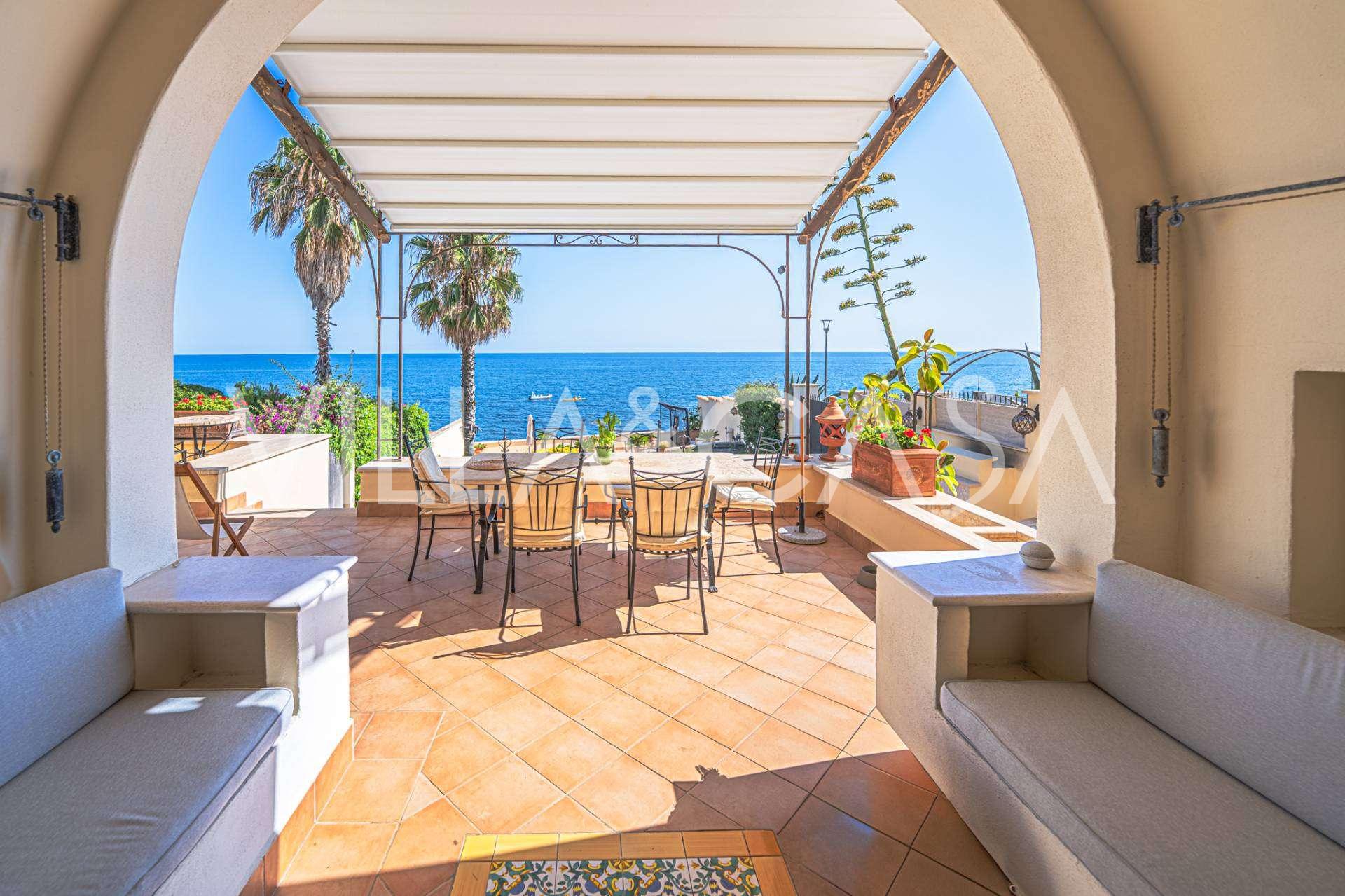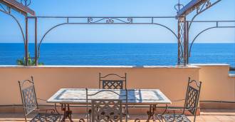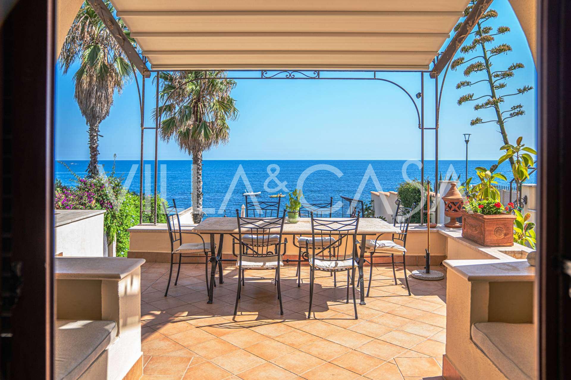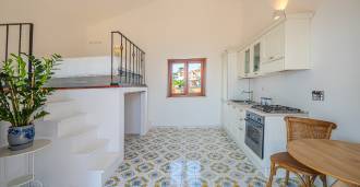Les fenêtres offrent une vue panoramique à 180 degrés sur la mer, l'horizon bleu remplit chaque espace intérieur et s'étend jusqu'aux larges terrasses panoramiques. Les espaces intérieurs, avec des plafonds de plus de trois mètres de hauteur, des sols en terre cuite de l'époque, un escalier en marbre et une cheminée, créent une atmosphère d'élégance raffinée et intemporelle.