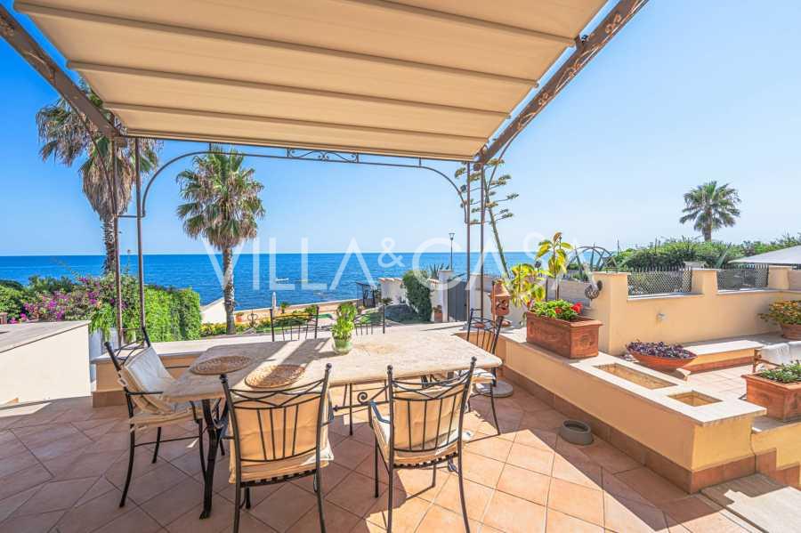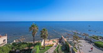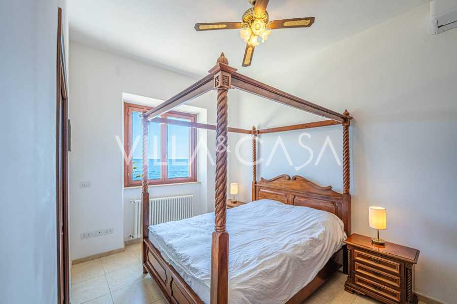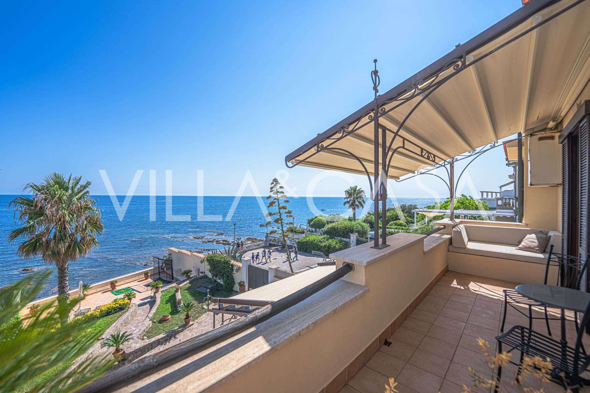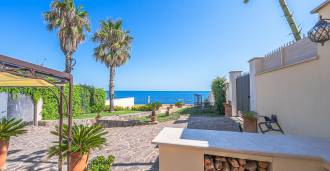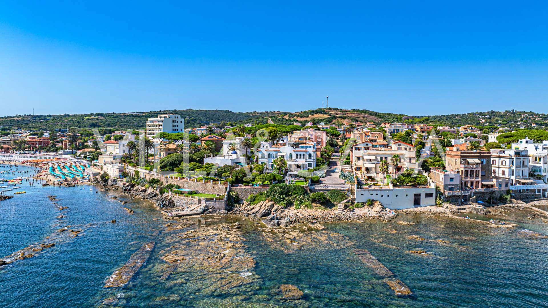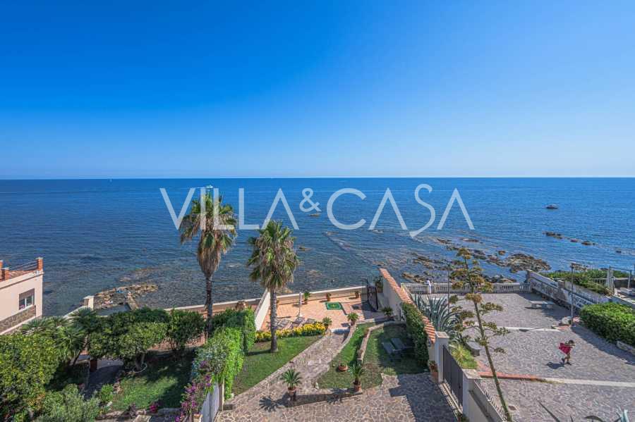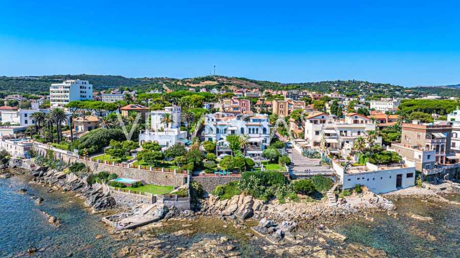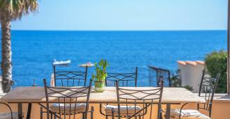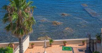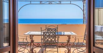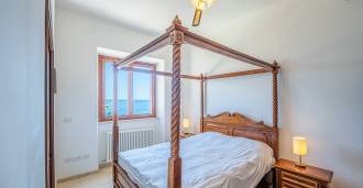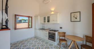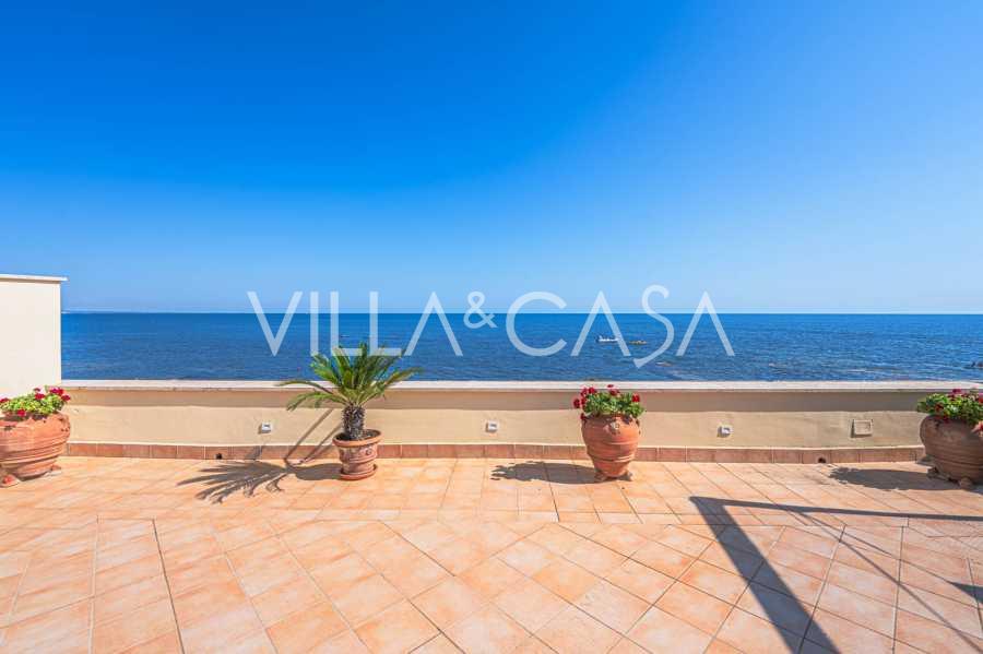 Les fenêtres offrent une vue panoramique à 180 degrés sur la mer, l'horizon bleu remplit chaque espace intérieur et s'étend jusqu'aux larges terrasses panoramiques. Les espaces intérieurs, avec des plafonds de plus de trois mètres de hauteur, des sols en terre cuite de l'époque, un escalier en marbre et une cheminée, créent une atmosphère d'élégance raffinée et intemporelle.