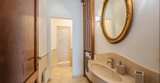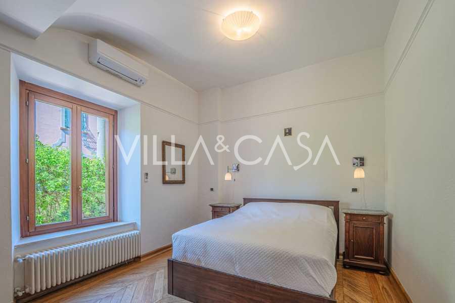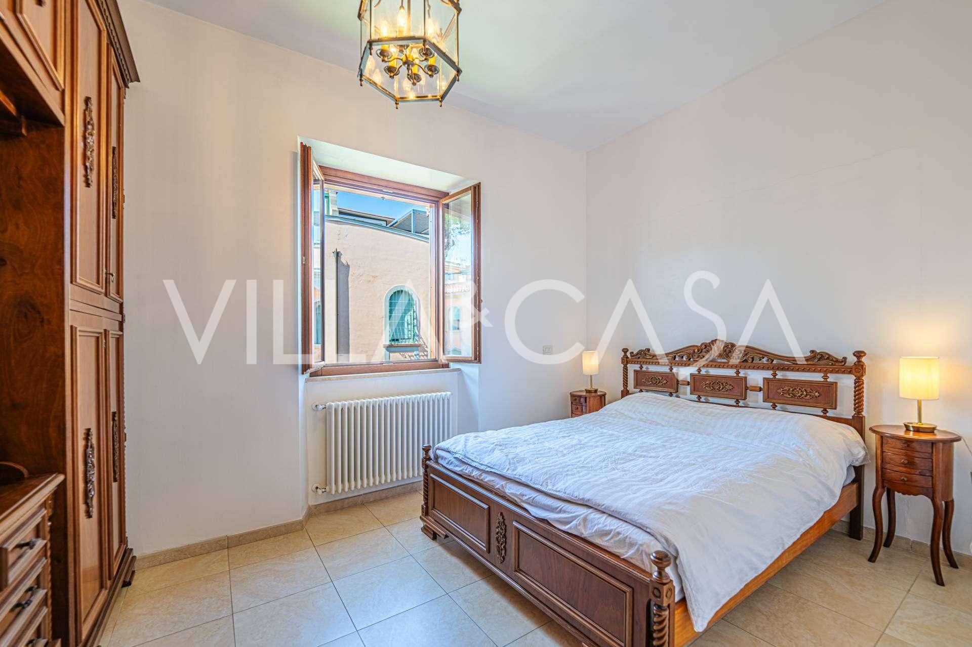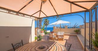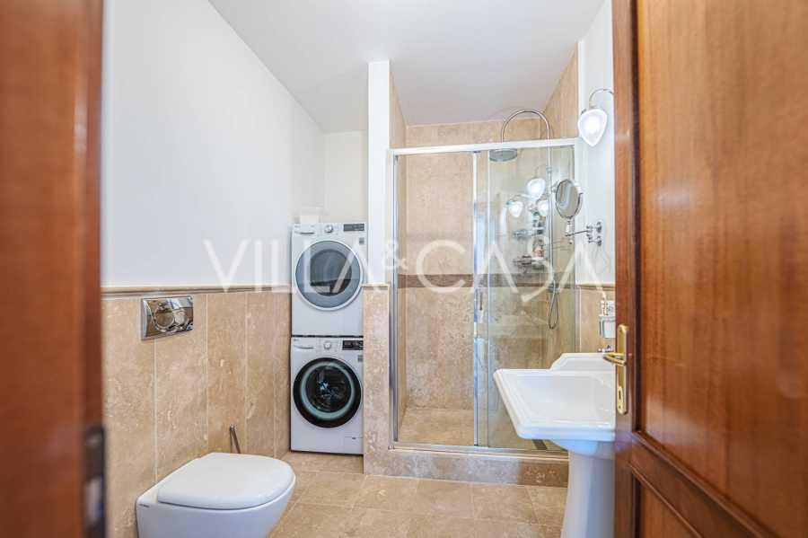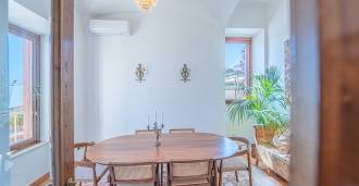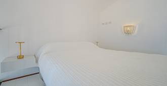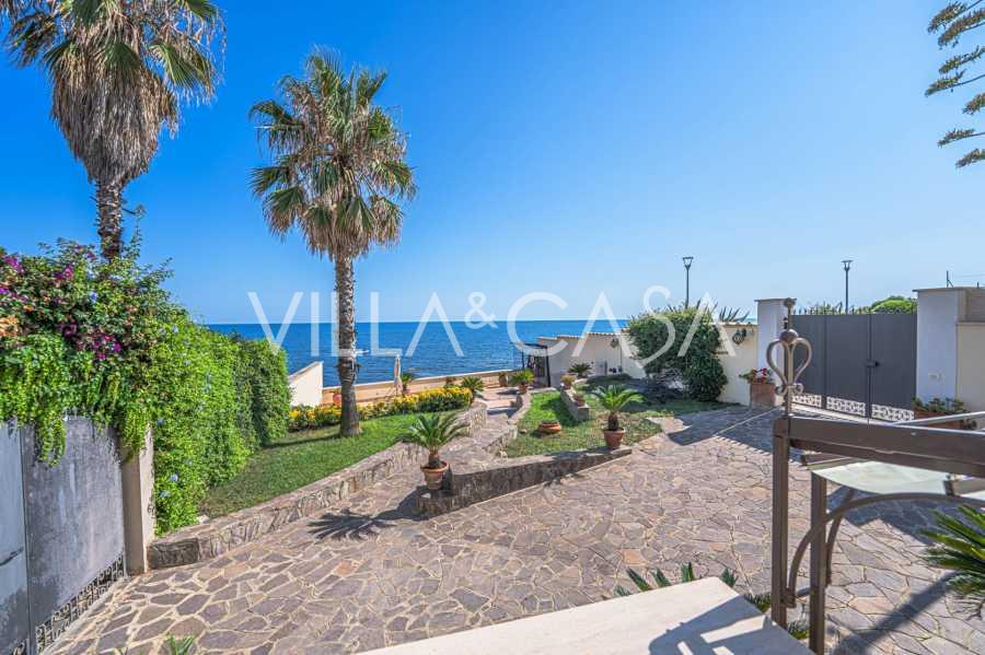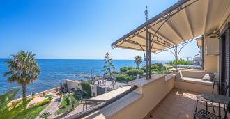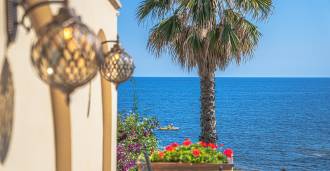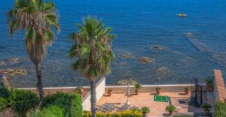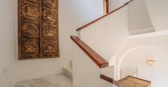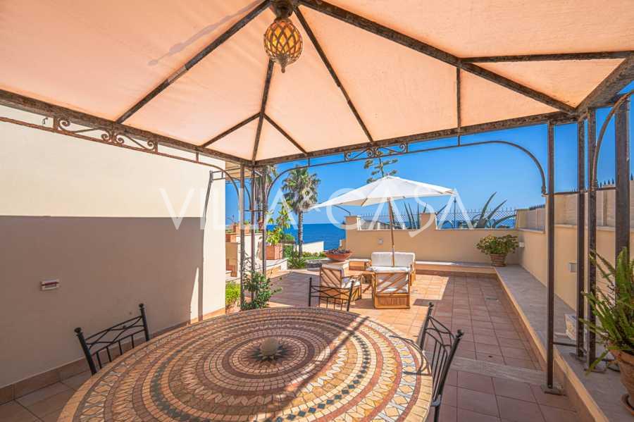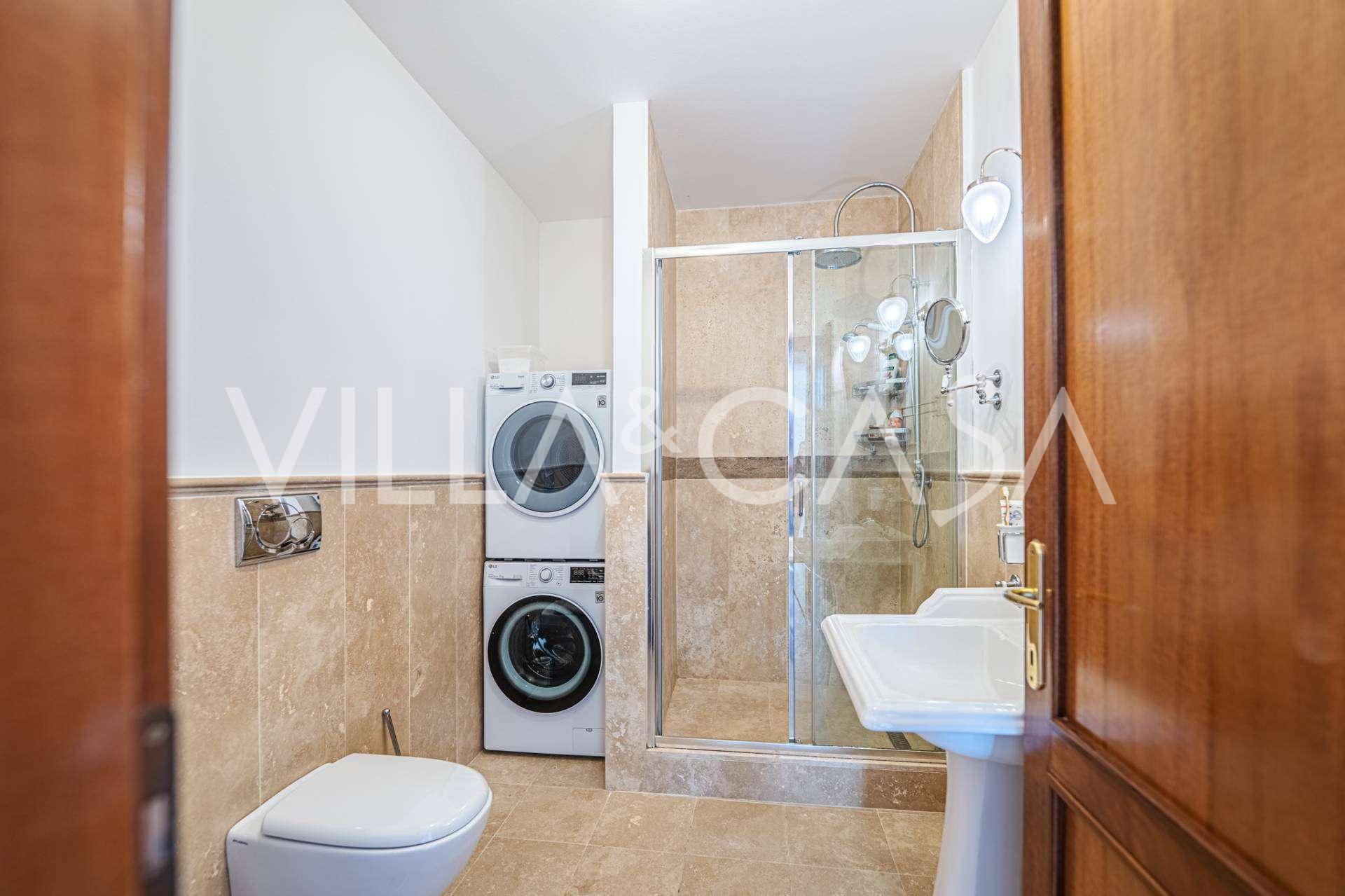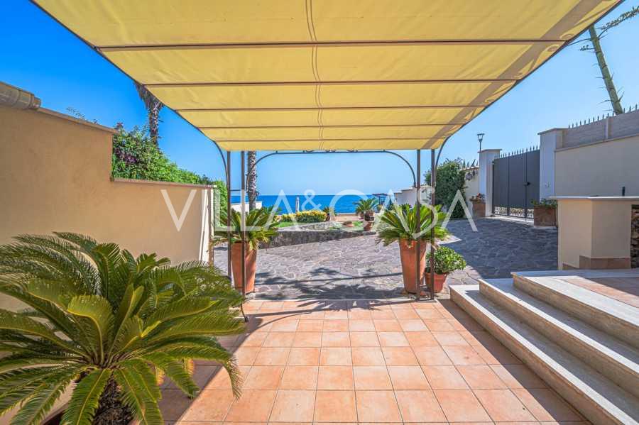 Les fenêtres offrent une vue panoramique à 180 degrés sur la mer, l'horizon bleu remplit chaque espace intérieur et s'étend jusqu'aux larges terrasses panoramiques. Les espaces intérieurs, avec des plafonds de plus de trois mètres de hauteur, des sols en terre cuite de l'époque, un escalier en marbre et une cheminée, créent une atmosphère d'élégance raffinée et intemporelle.