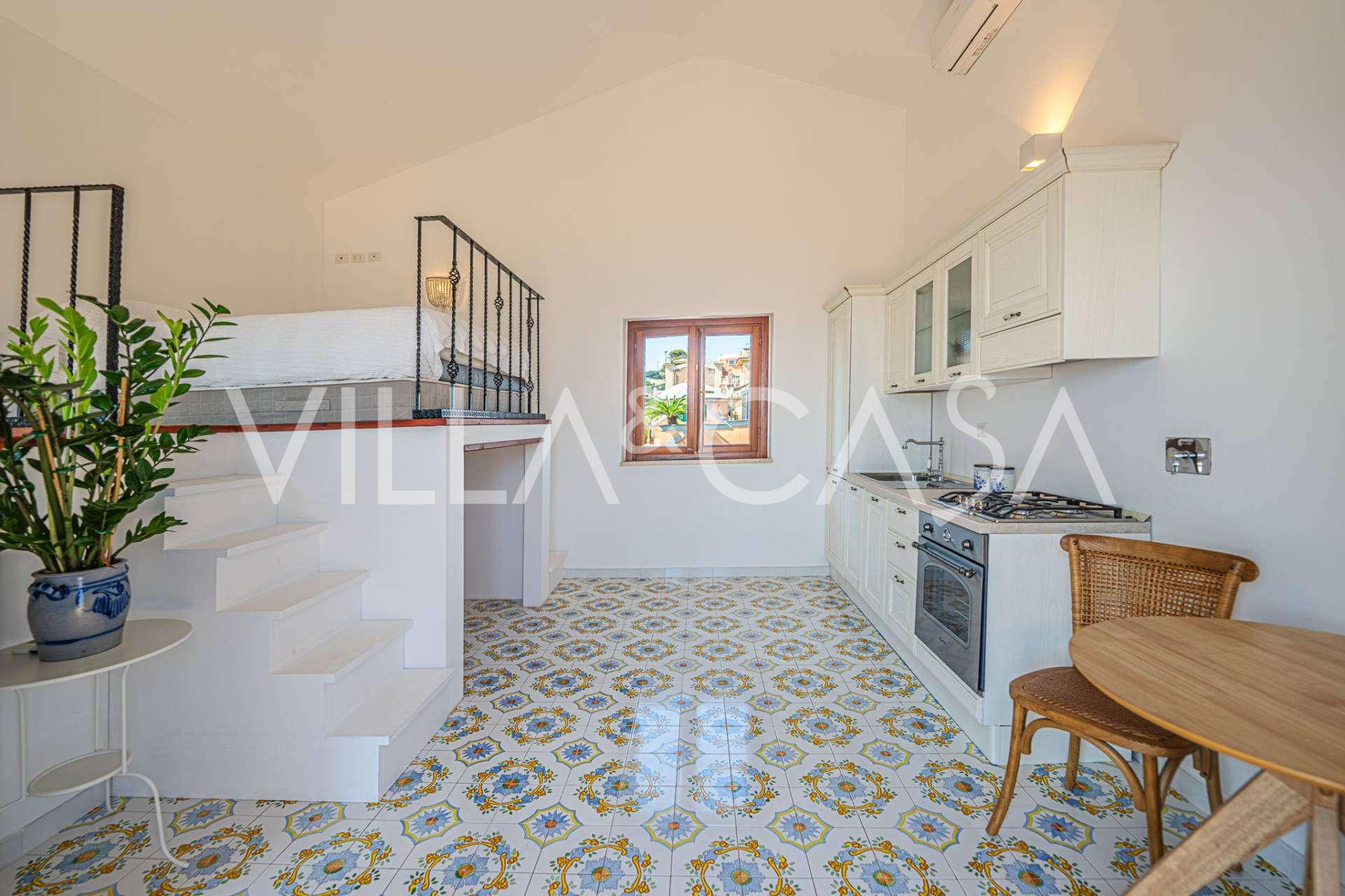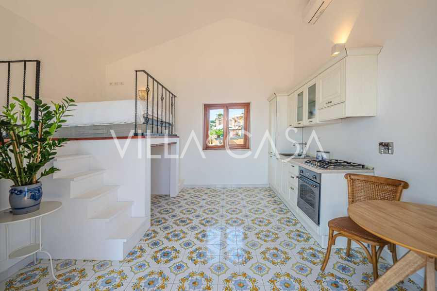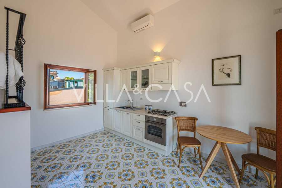 Le salon principal, orné de grandes fenêtres, s'ouvre sur une terrasse idéale pour se détendre et profiter des couchers de soleil rares. La cuisine, fabriquée à la main sur mesure, combine esthétique et fonctionnalité, avec un îlot décoré de carreaux peints de Positano et des éviers en cuivre originaux.