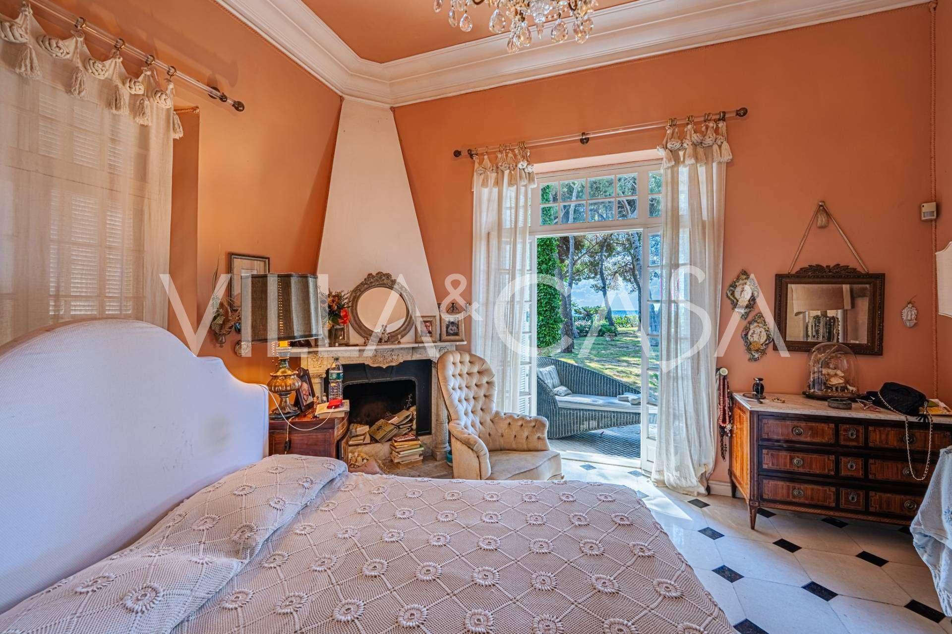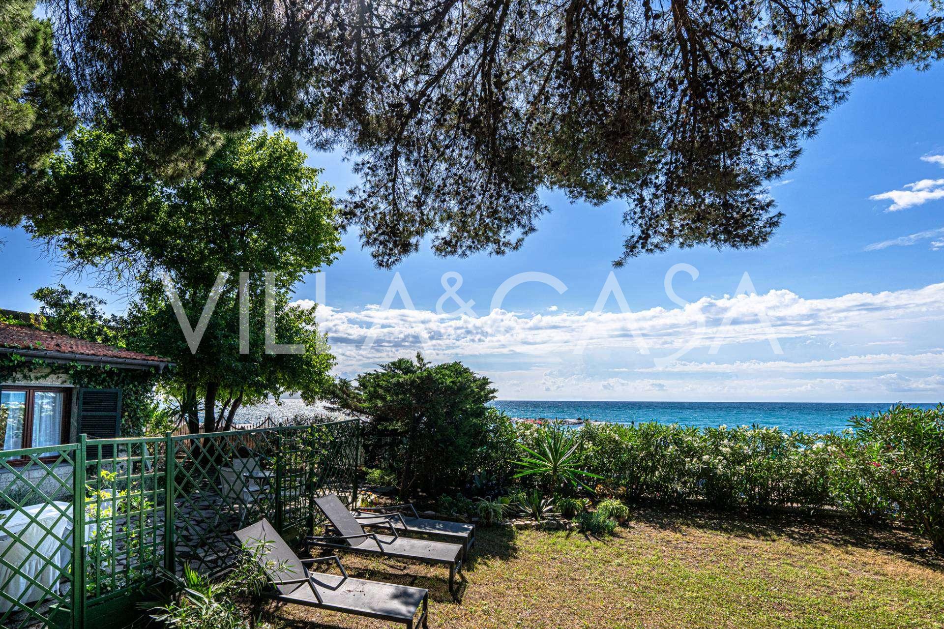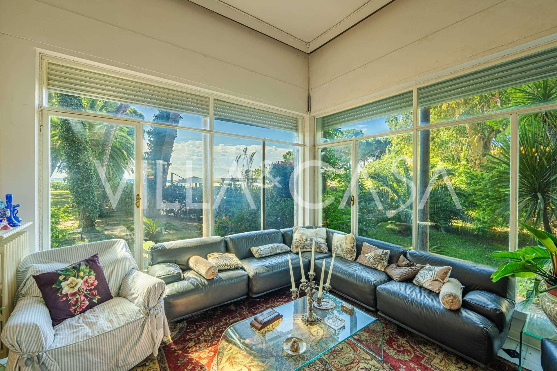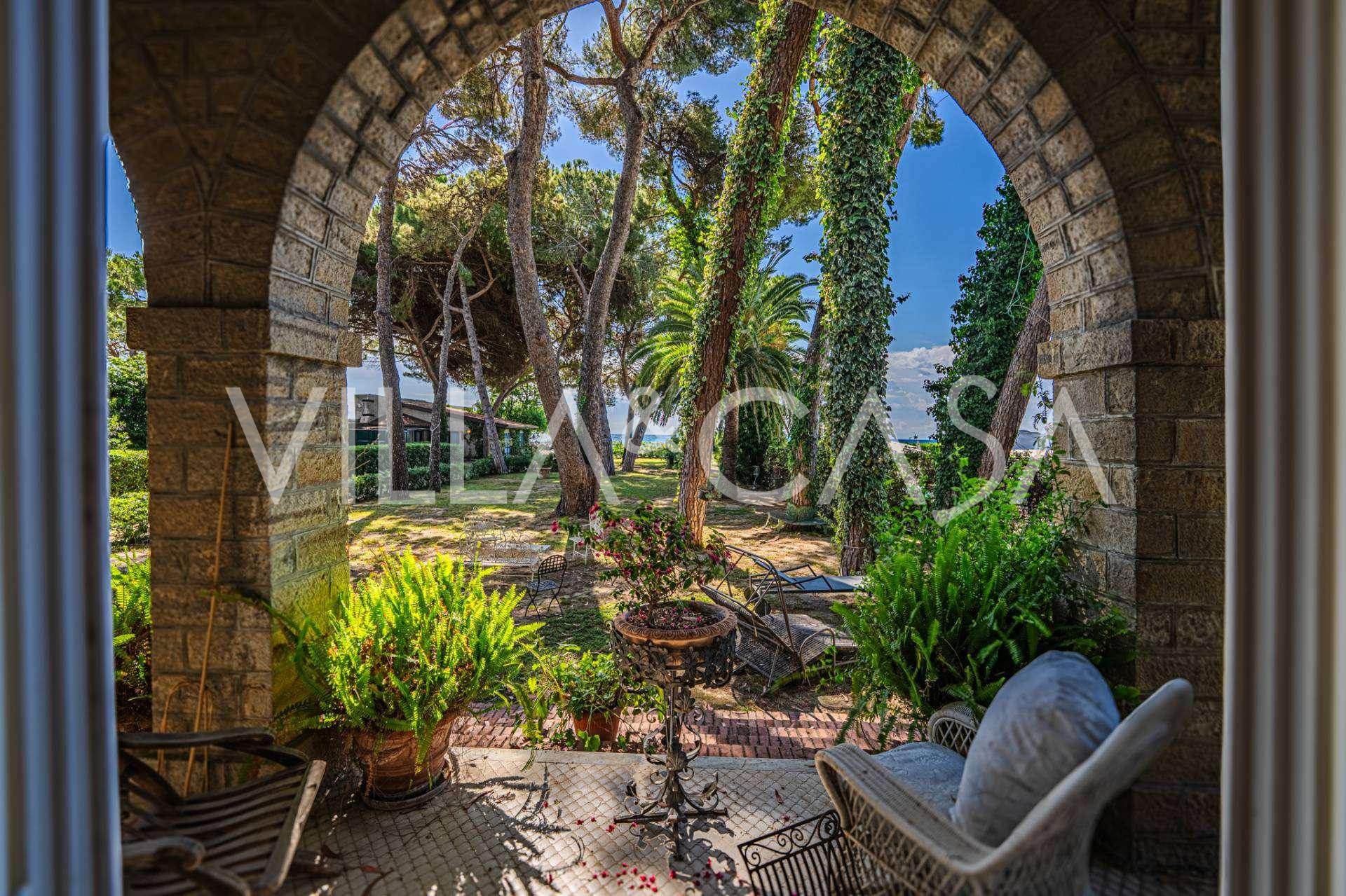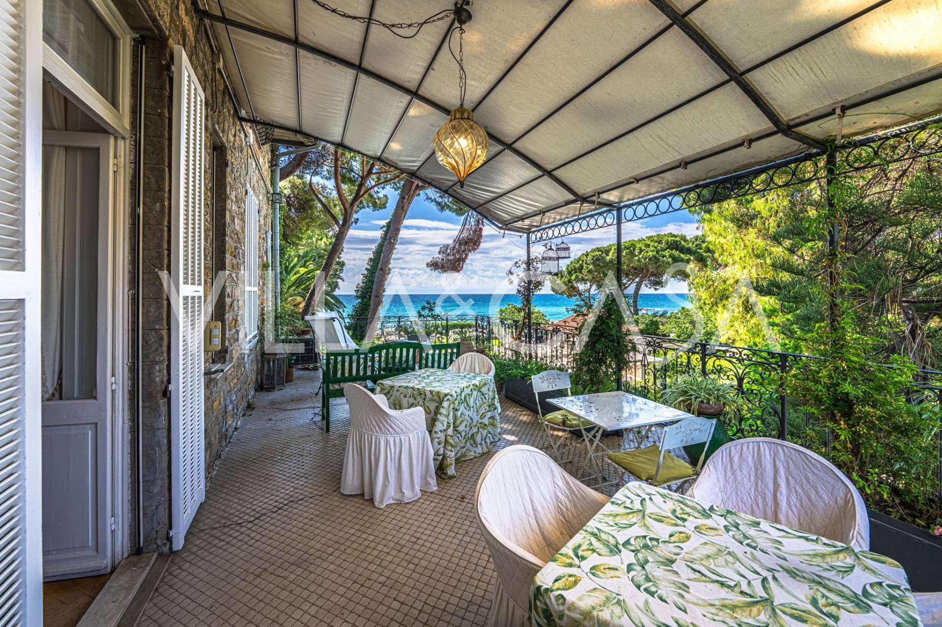 À vendre, une élégante villa en première ligne de mer à Diano Marina, conçue dans un style anglais, d'une superficie d'environ 628 m², répartie sur quatre niveaux. Elle dispose d'un accès direct à la mer et à une plage de sable. La villa est entourée d'un vaste parc d'environ 5000 m² avec des pins méditerranéens centenaires.