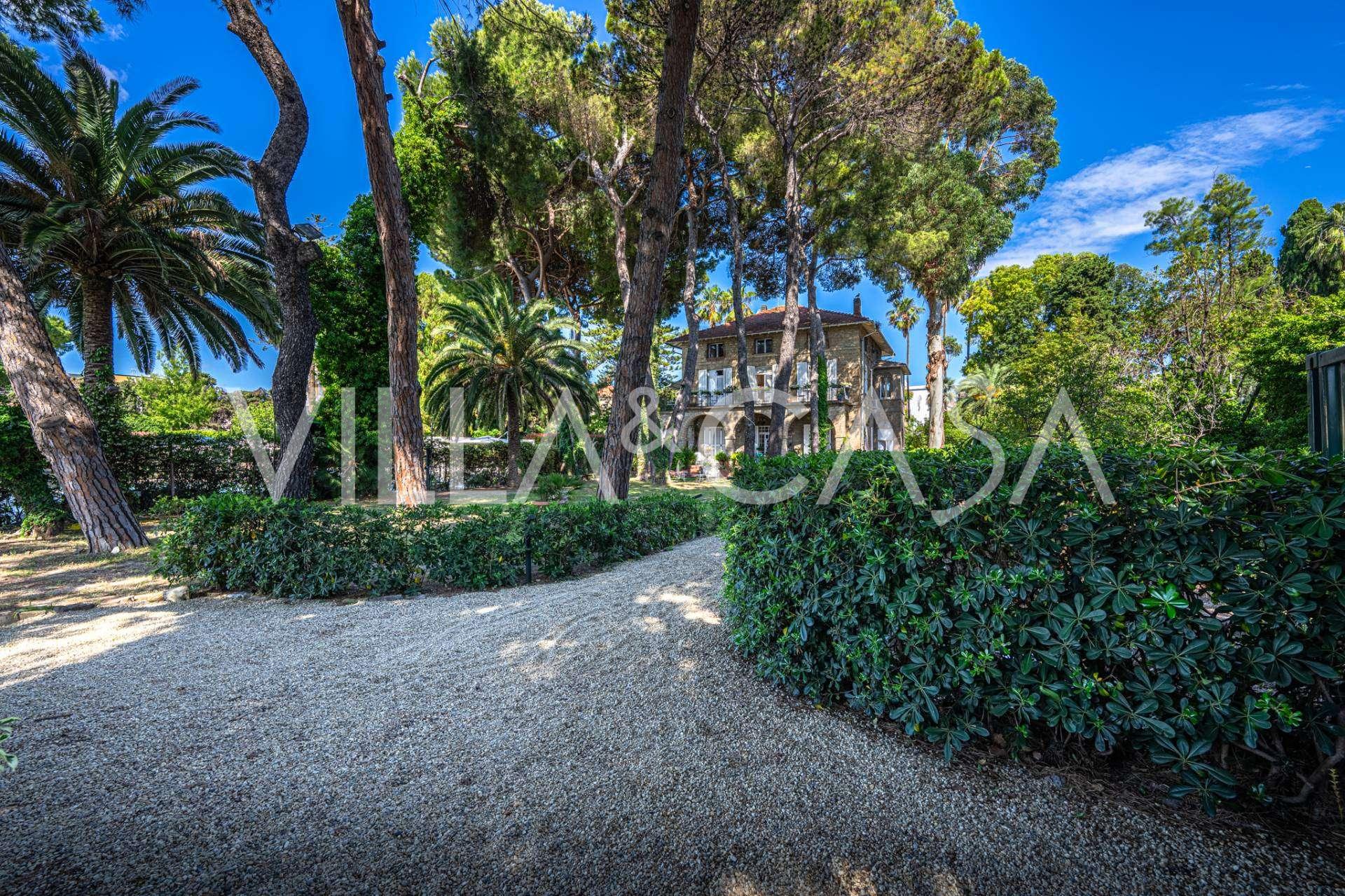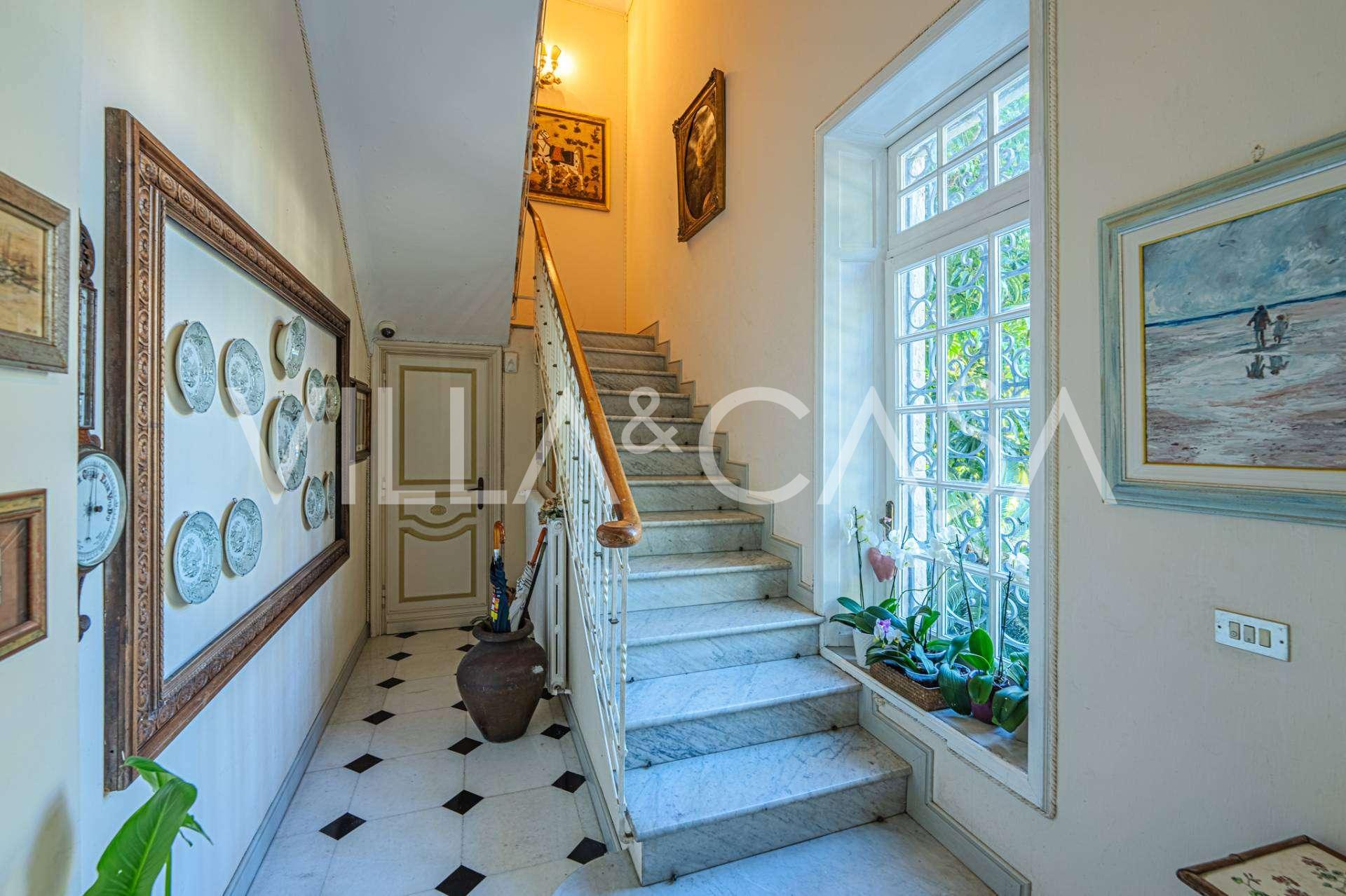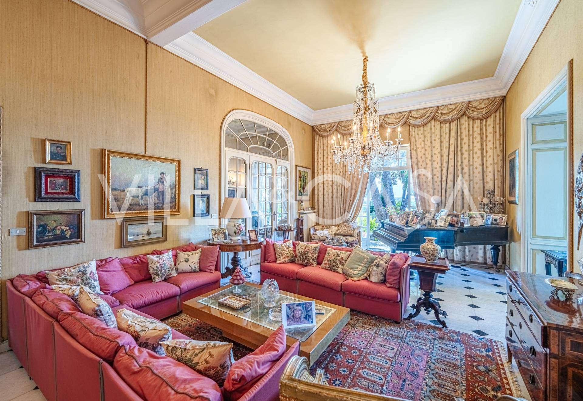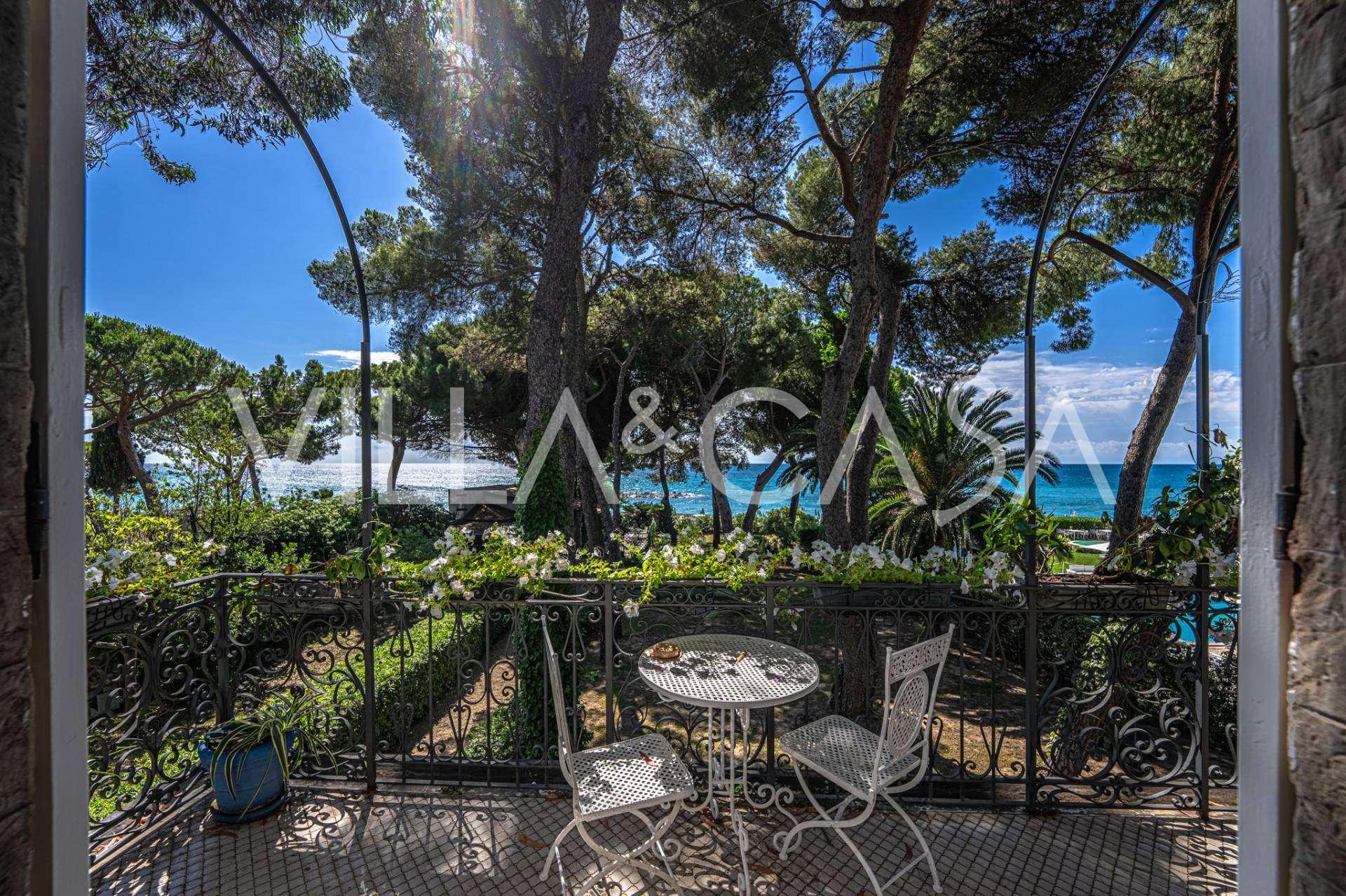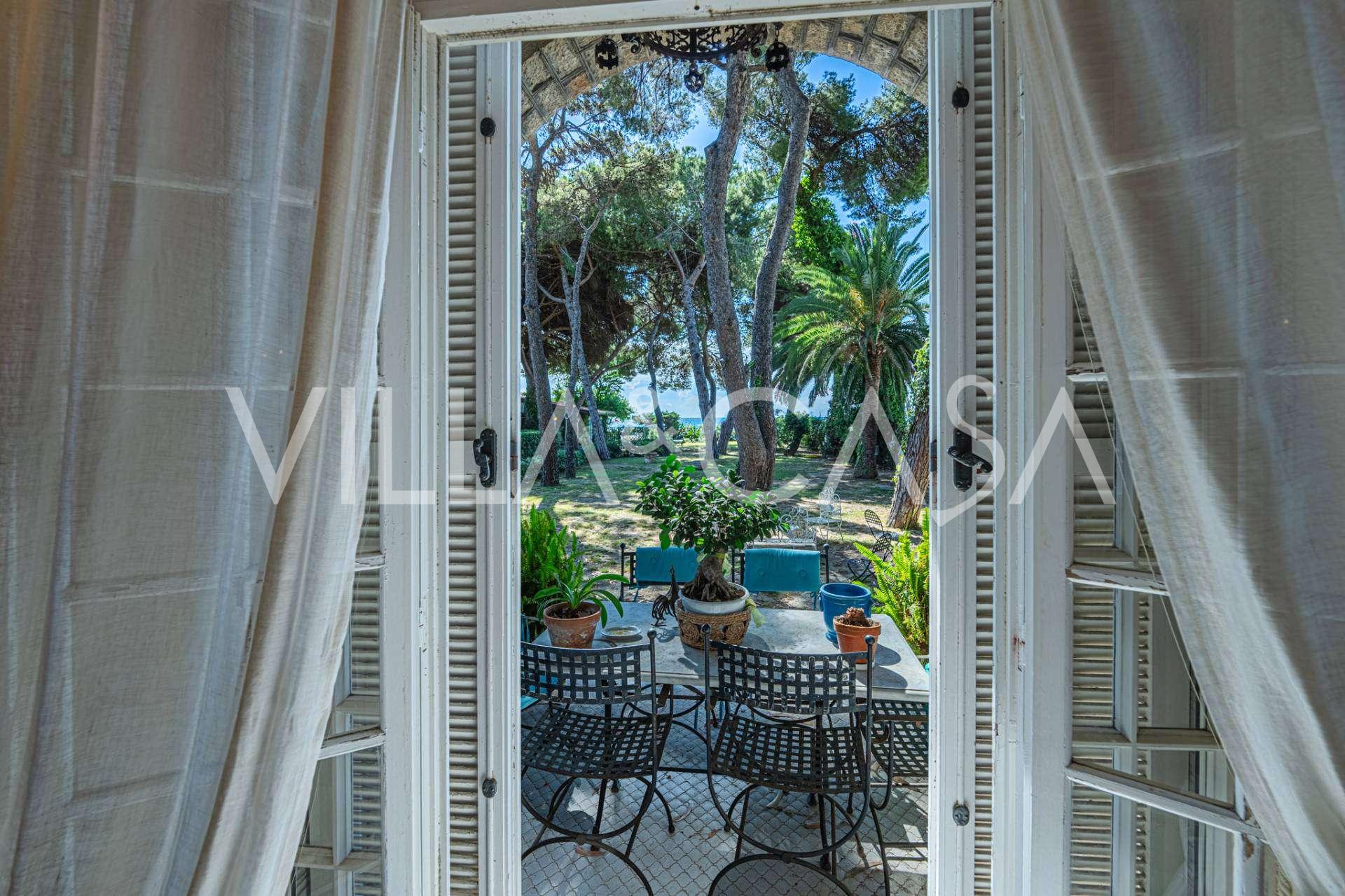 À vendre, une élégante villa en première ligne de mer à Diano Marina, conçue dans un style anglais, d'une superficie d'environ 628 m², répartie sur quatre niveaux. Elle dispose d'un accès direct à la mer et à une plage de sable. La villa est entourée d'un vaste parc d'environ 5000 m² avec des pins méditerranéens centenaires.