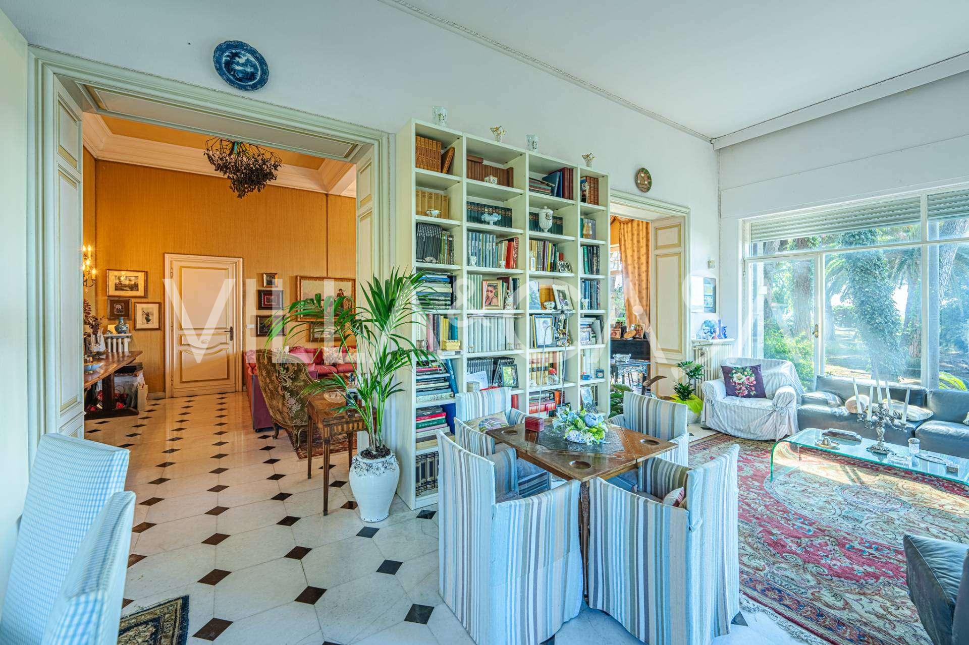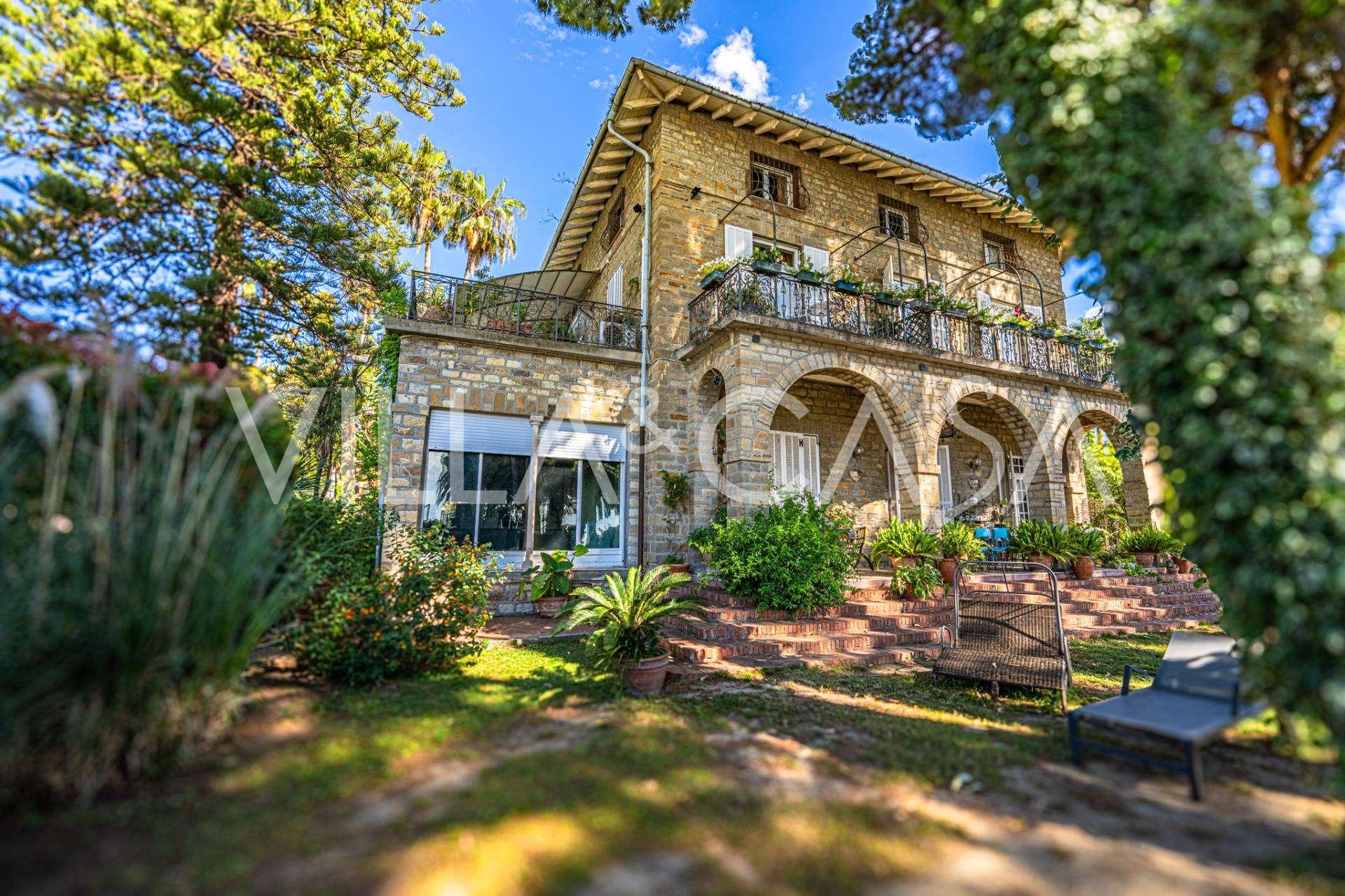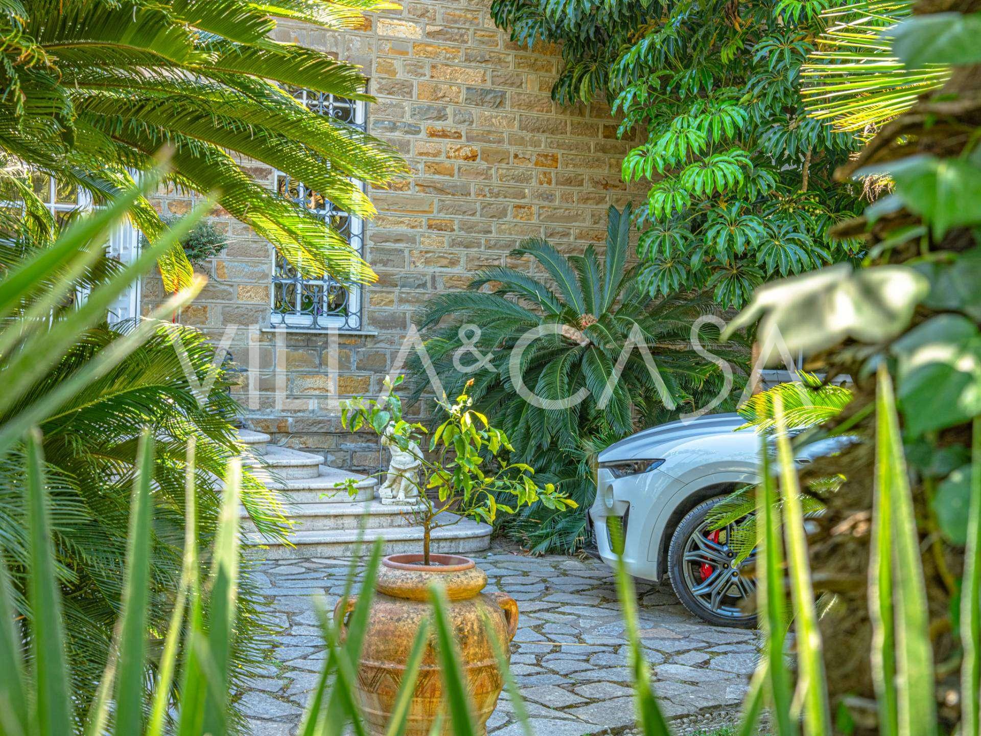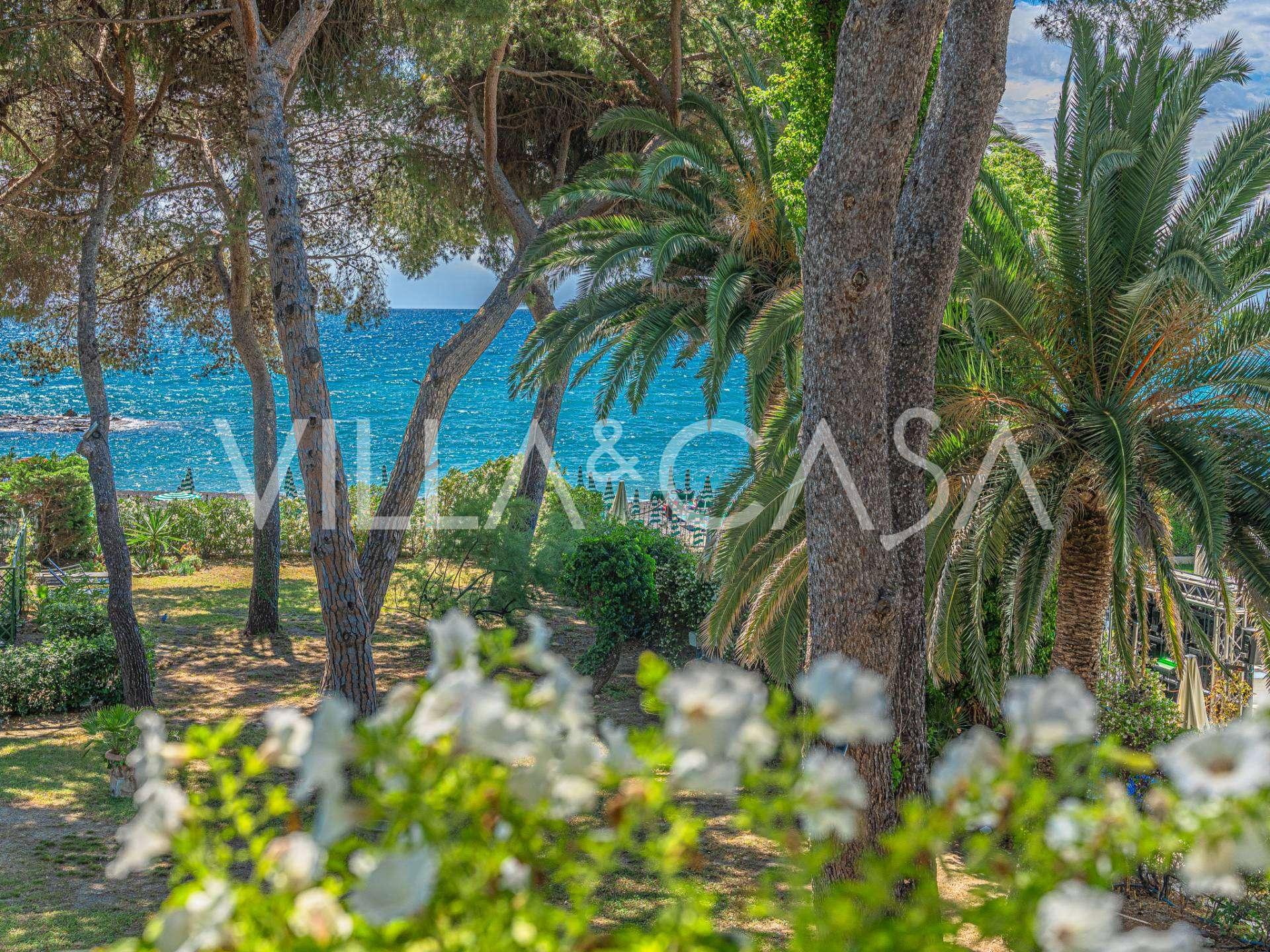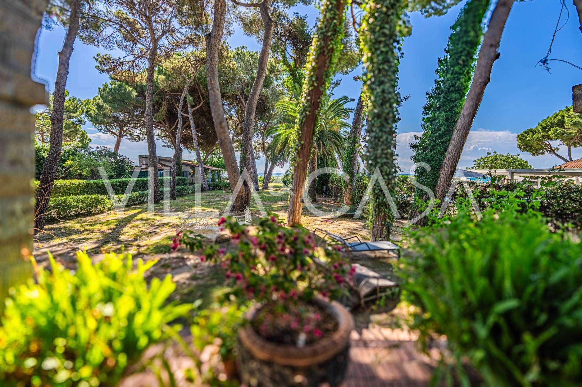 À vendre, une élégante villa en première ligne de mer à Diano Marina, conçue dans un style anglais, d'une superficie d'environ 628 m², répartie sur quatre niveaux. Elle dispose d'un accès direct à la mer et à une plage de sable. La villa est entourée d'un vaste parc d'environ 5000 m² avec des pins méditerranéens centenaires.