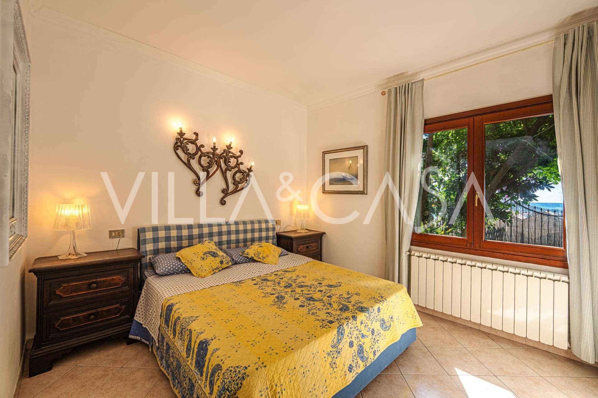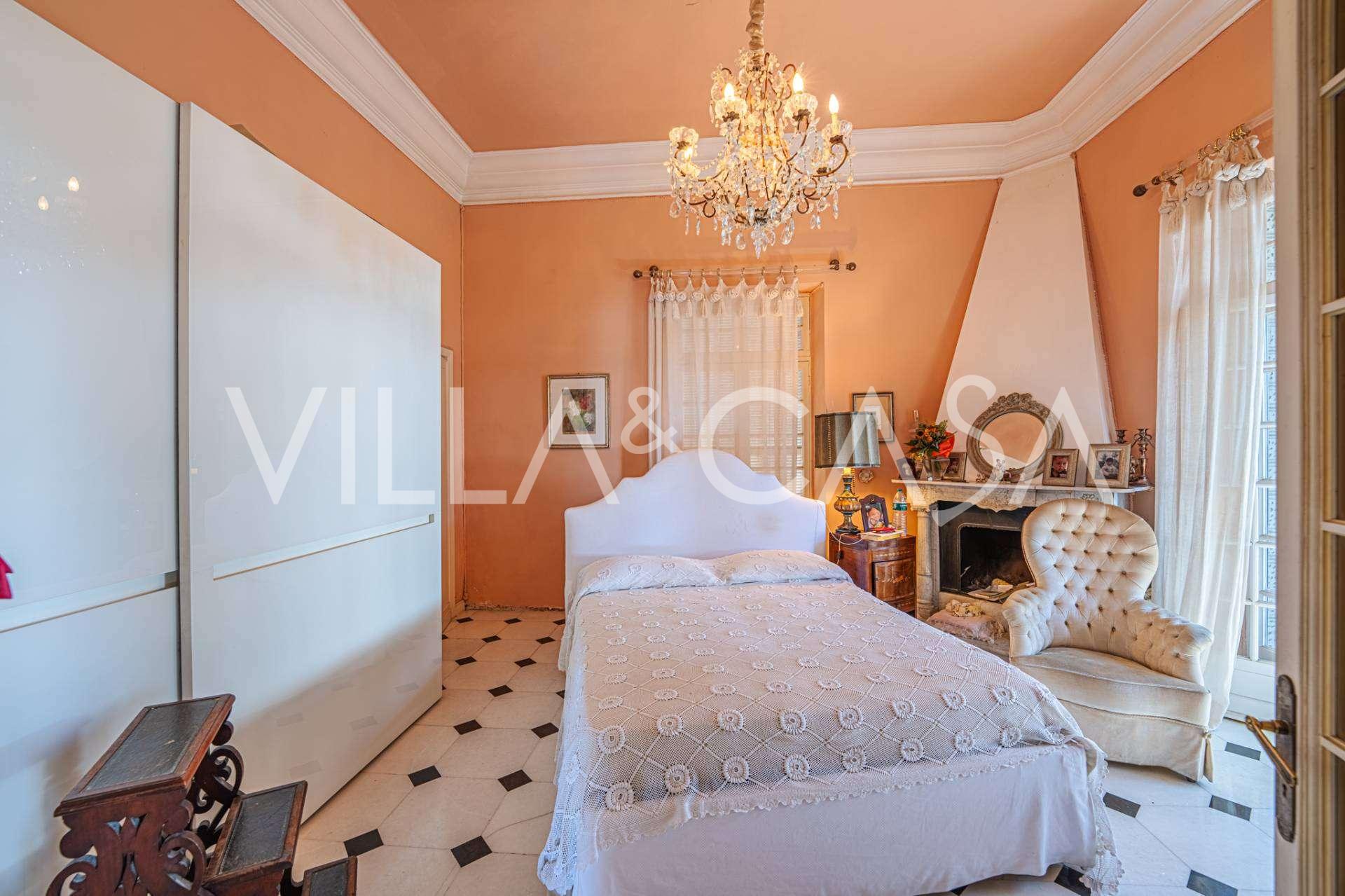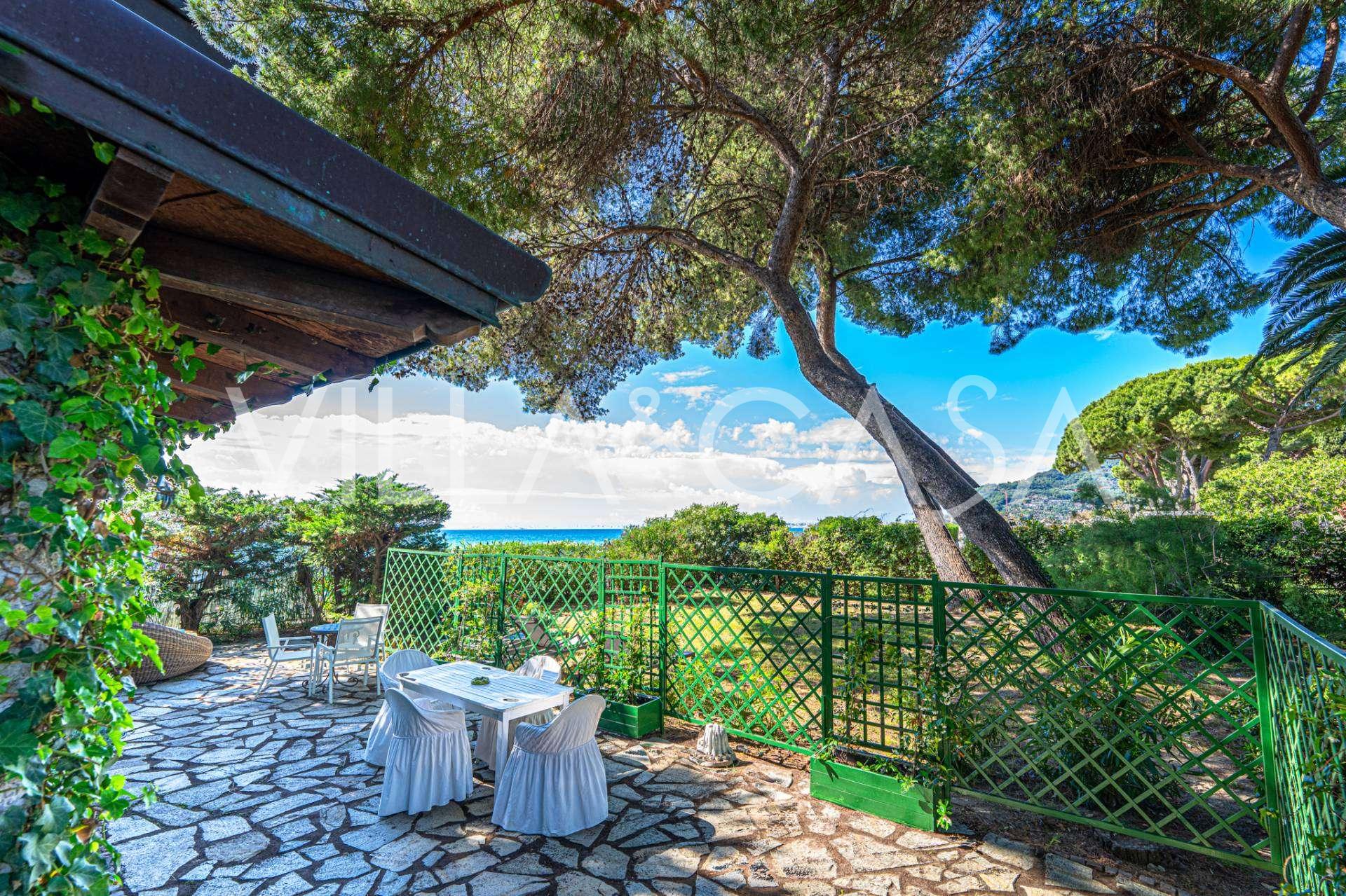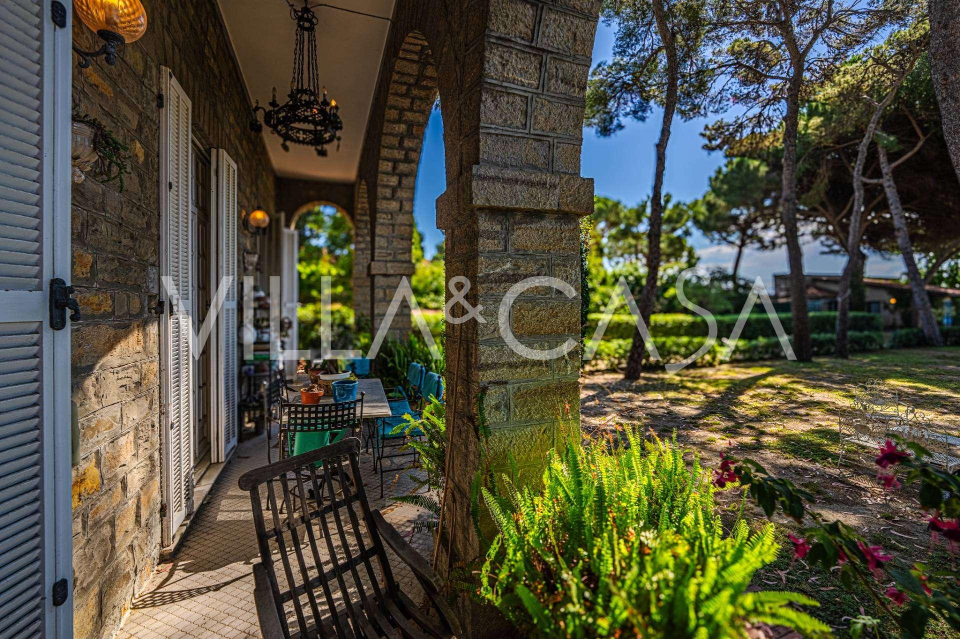 À vendre, une élégante villa en première ligne de mer à Diano Marina, conçue dans un style anglais, d'une superficie d'environ 628 m², répartie sur quatre niveaux. Elle dispose d'un accès direct à la mer et à une plage de sable. La villa est entourée d'un vaste parc d'environ 5000 m² avec des pins méditerranéens centenaires.