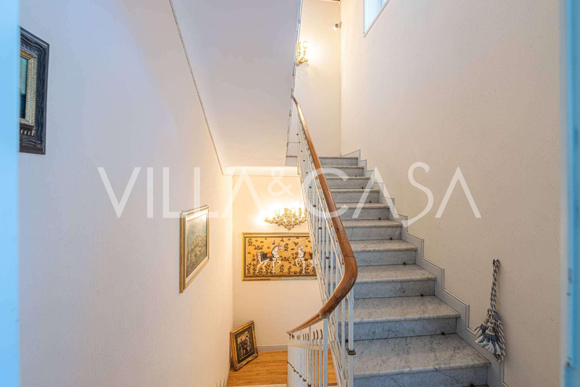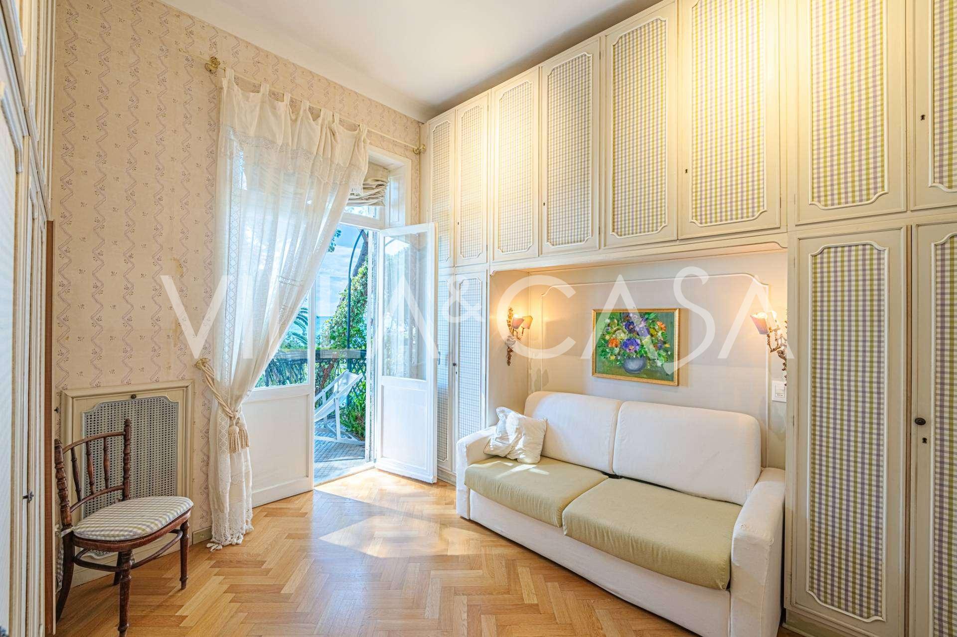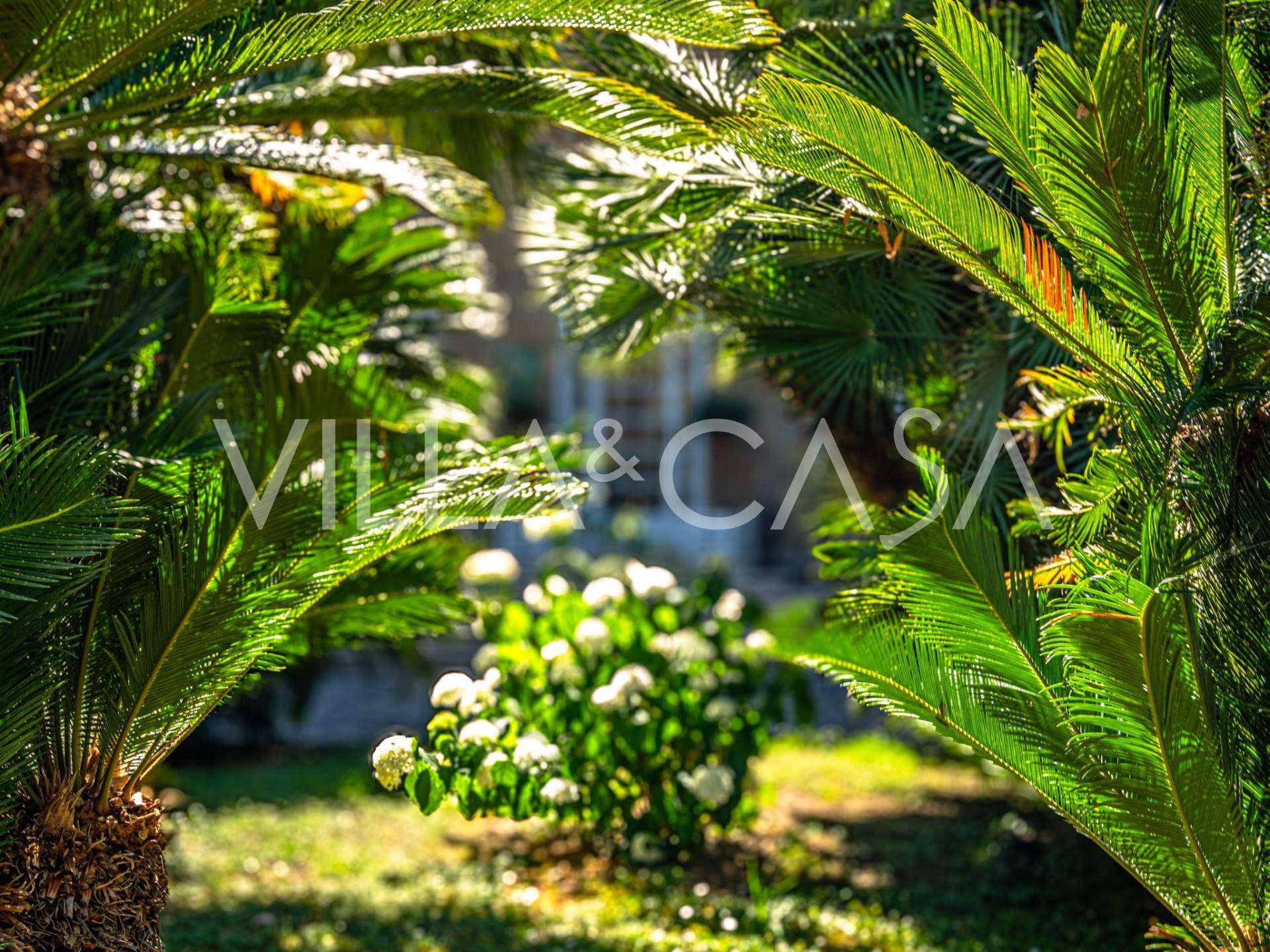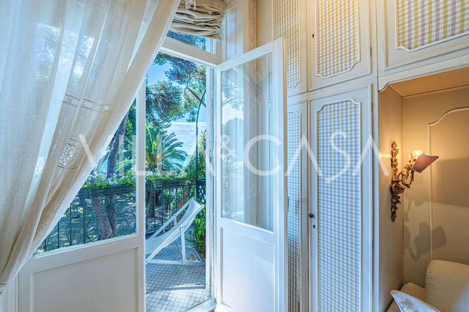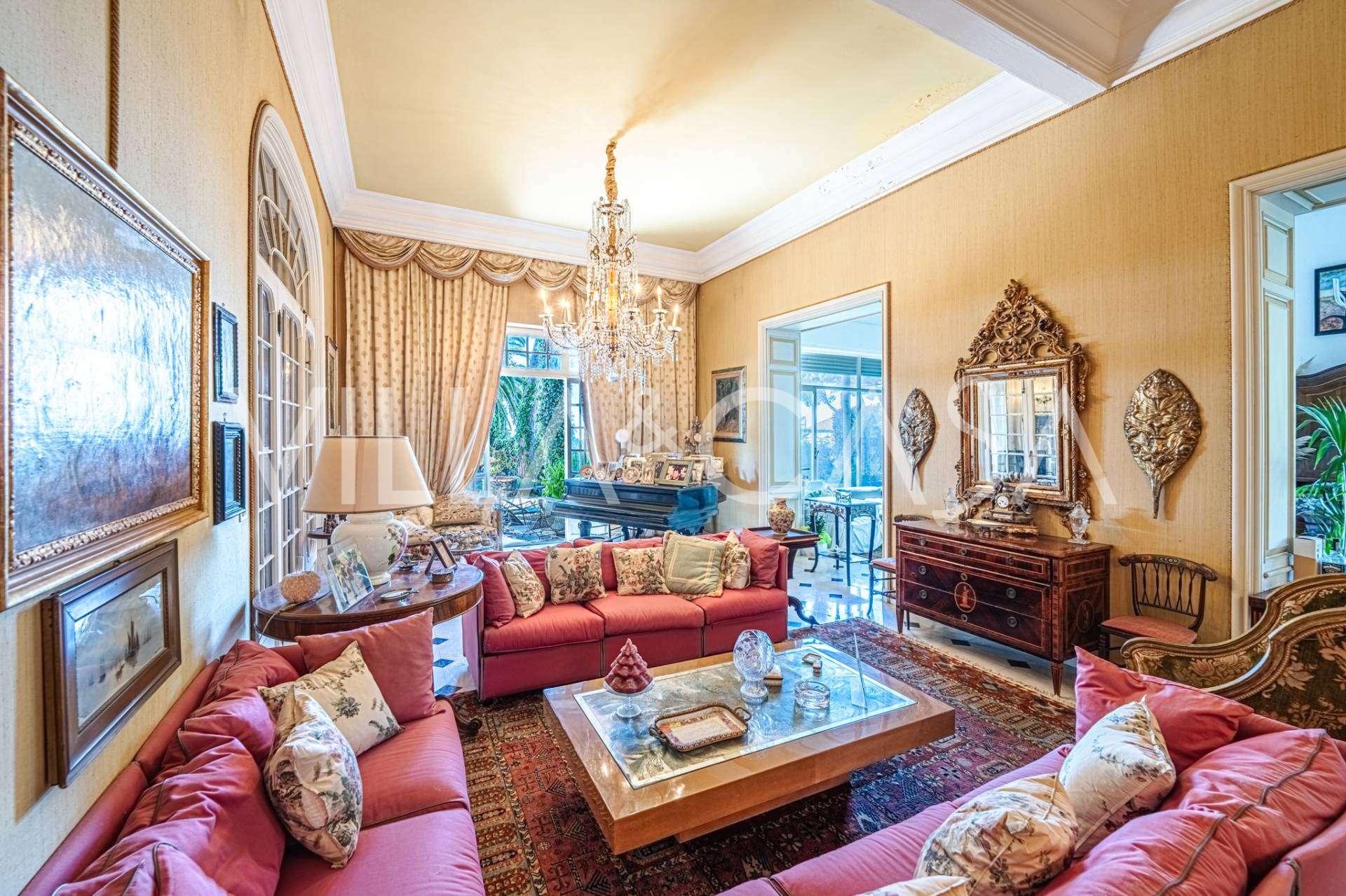 À vendre, une élégante villa en première ligne de mer à Diano Marina, conçue dans un style anglais, d'une superficie d'environ 628 m², répartie sur quatre niveaux. Elle dispose d'un accès direct à la mer et à une plage de sable. La villa est entourée d'un vaste parc d'environ 5000 m² avec des pins méditerranéens centenaires.