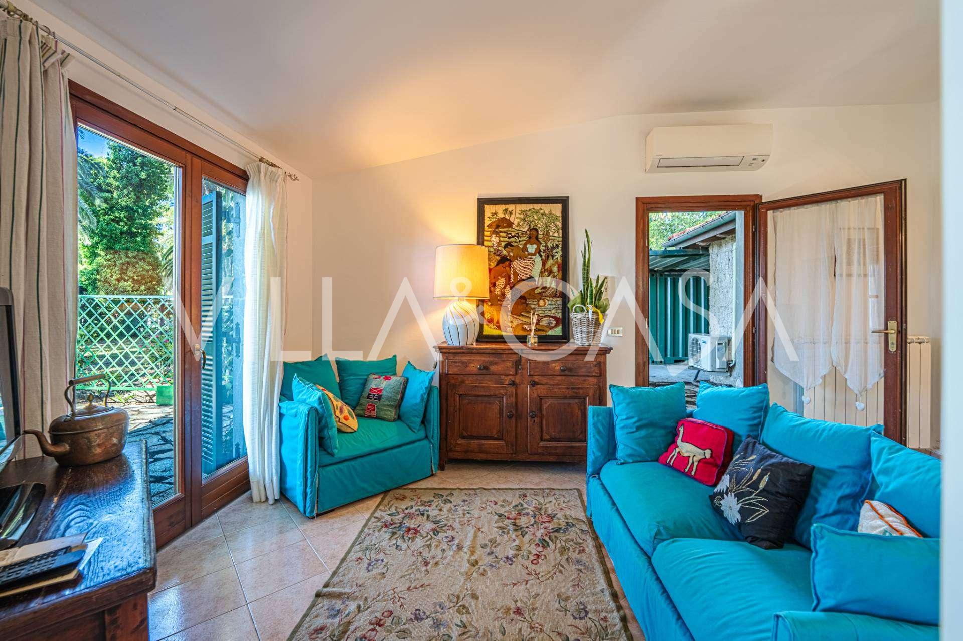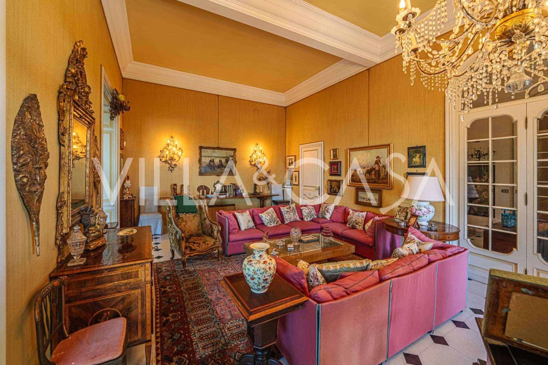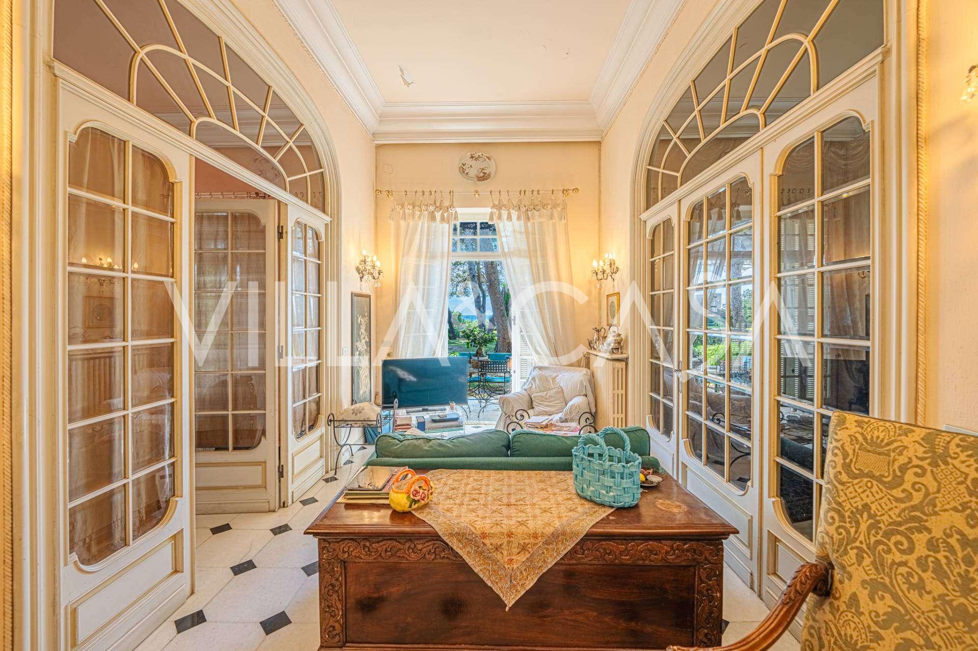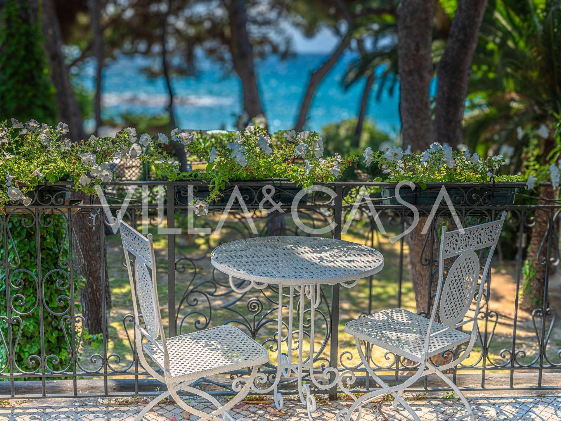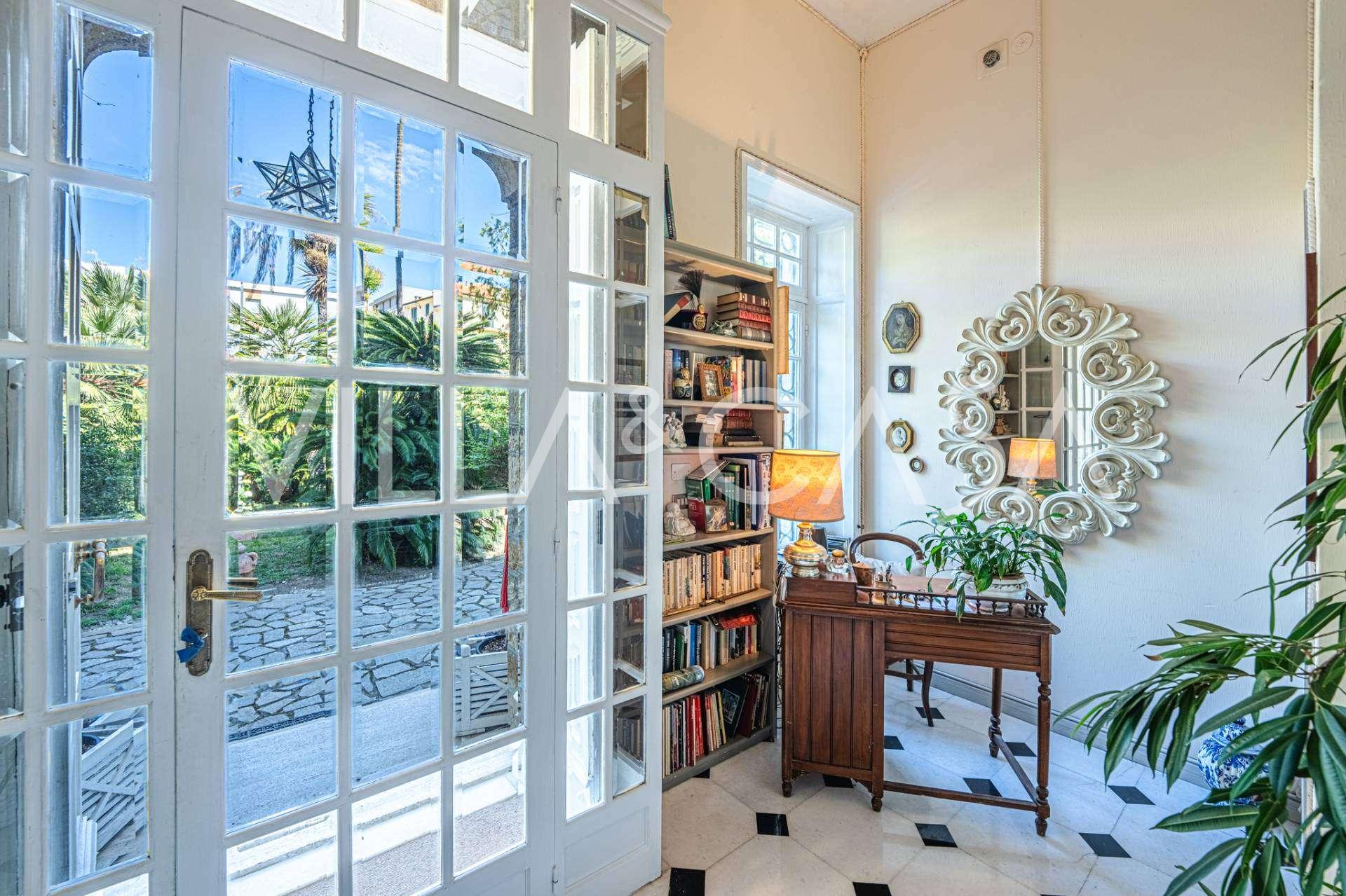 À vendre, une élégante villa en première ligne de mer à Diano Marina, conçue dans un style anglais, d'une superficie d'environ 628 m², répartie sur quatre niveaux. Elle dispose d'un accès direct à la mer et à une plage de sable. La villa est entourée d'un vaste parc d'environ 5000 m² avec des pins méditerranéens centenaires.