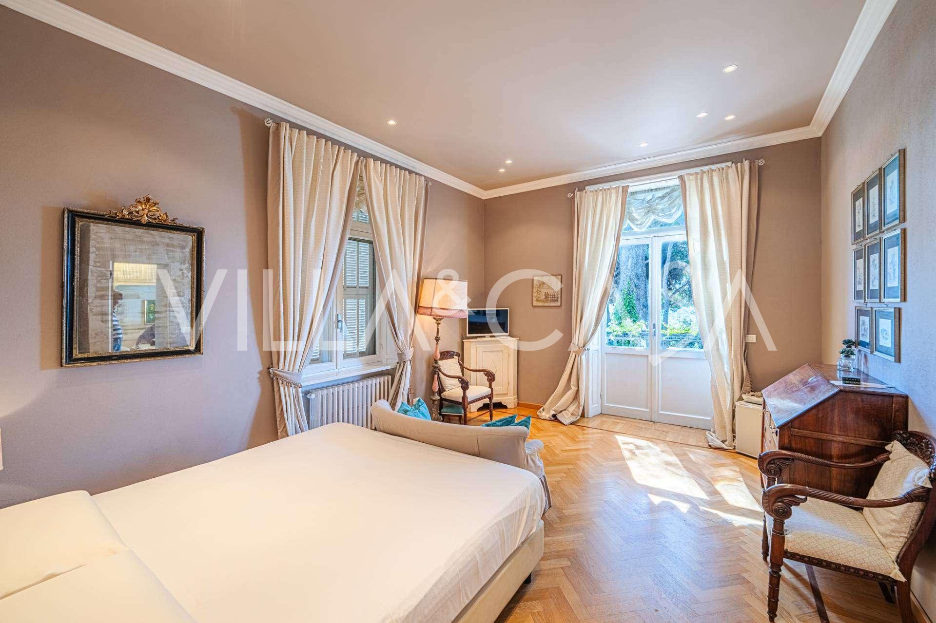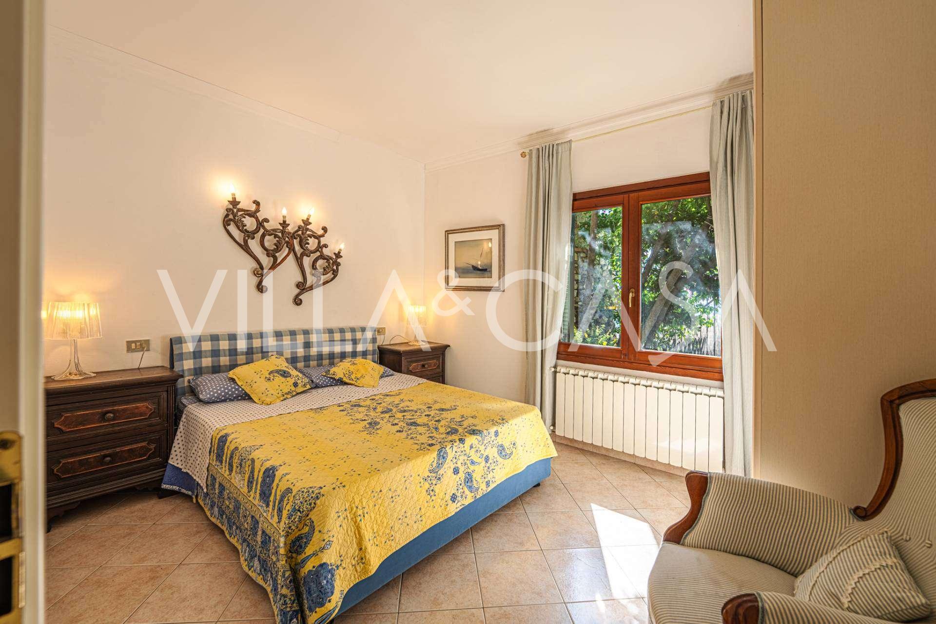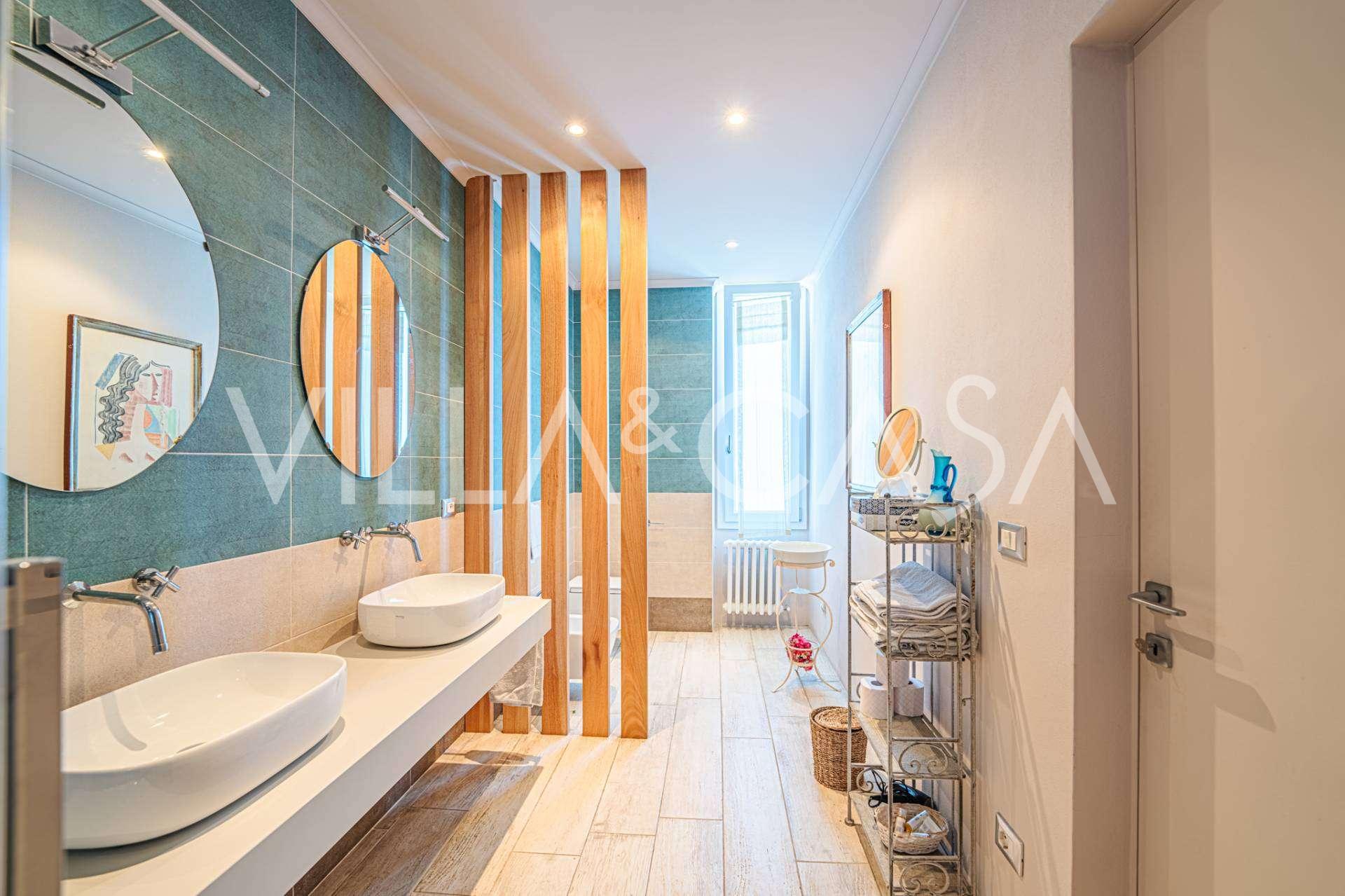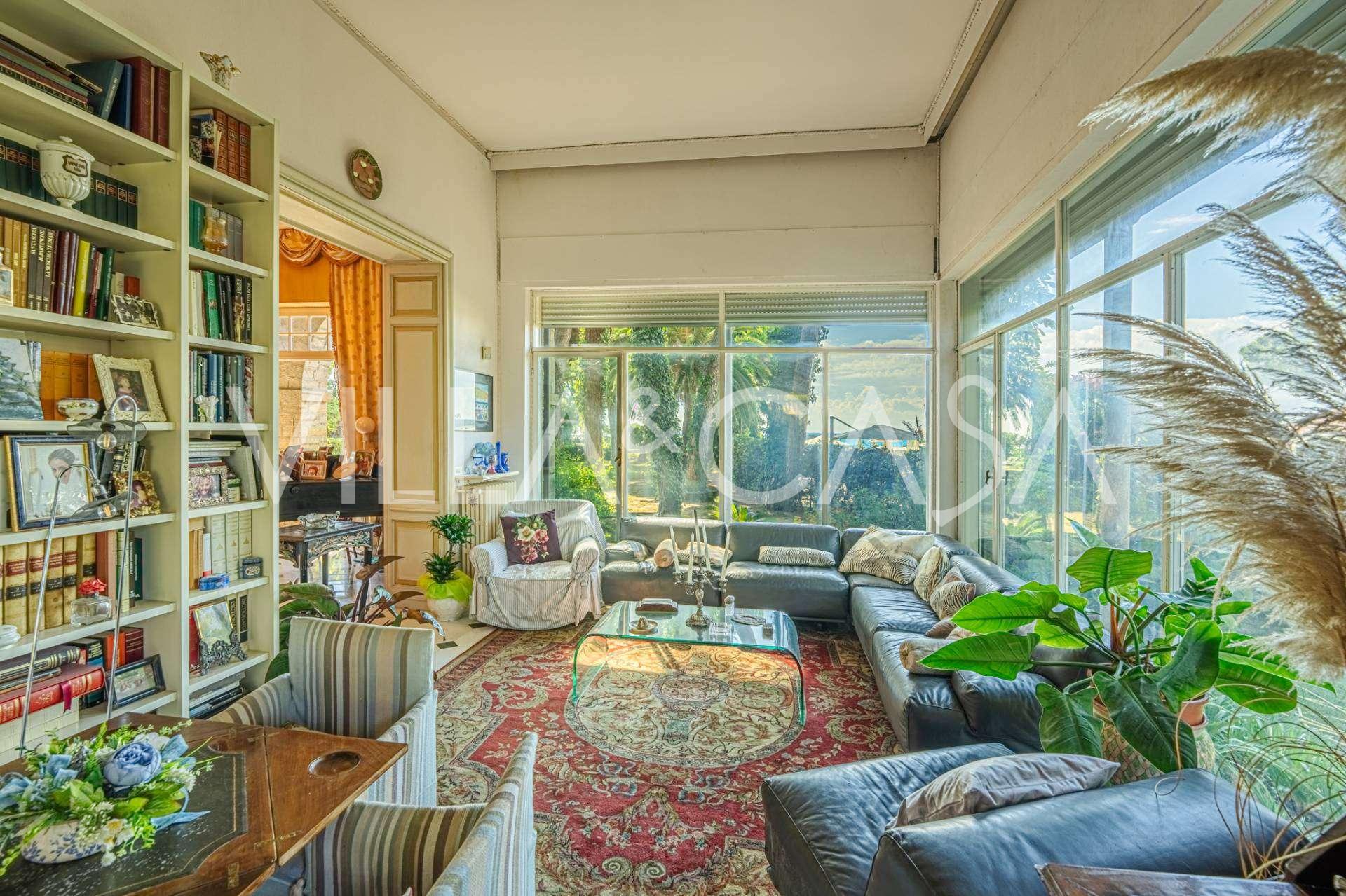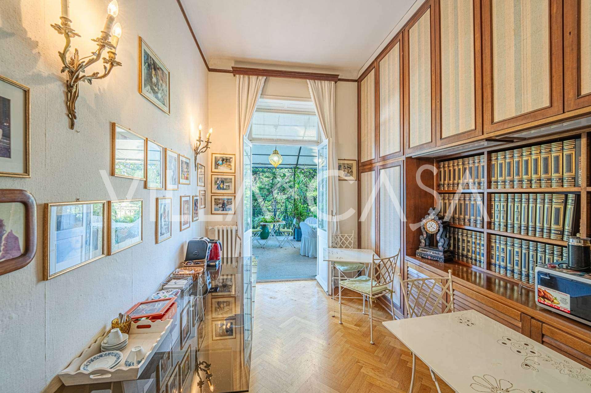 À vendre, une élégante villa en première ligne de mer à Diano Marina, conçue dans un style anglais, d'une superficie d'environ 628 m², répartie sur quatre niveaux. Elle dispose d'un accès direct à la mer et à une plage de sable. La villa est entourée d'un vaste parc d'environ 5000 m² avec des pins méditerranéens centenaires.