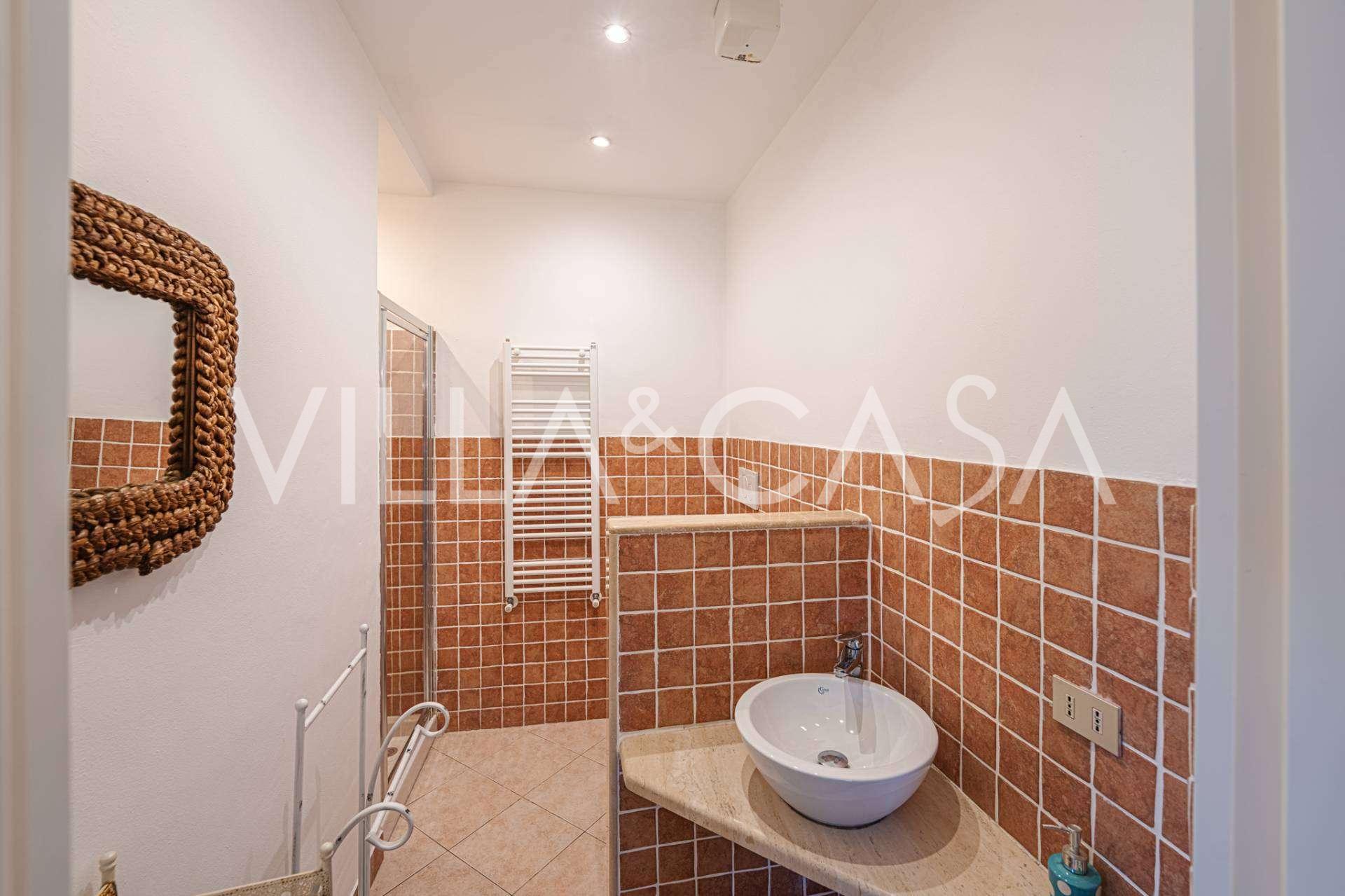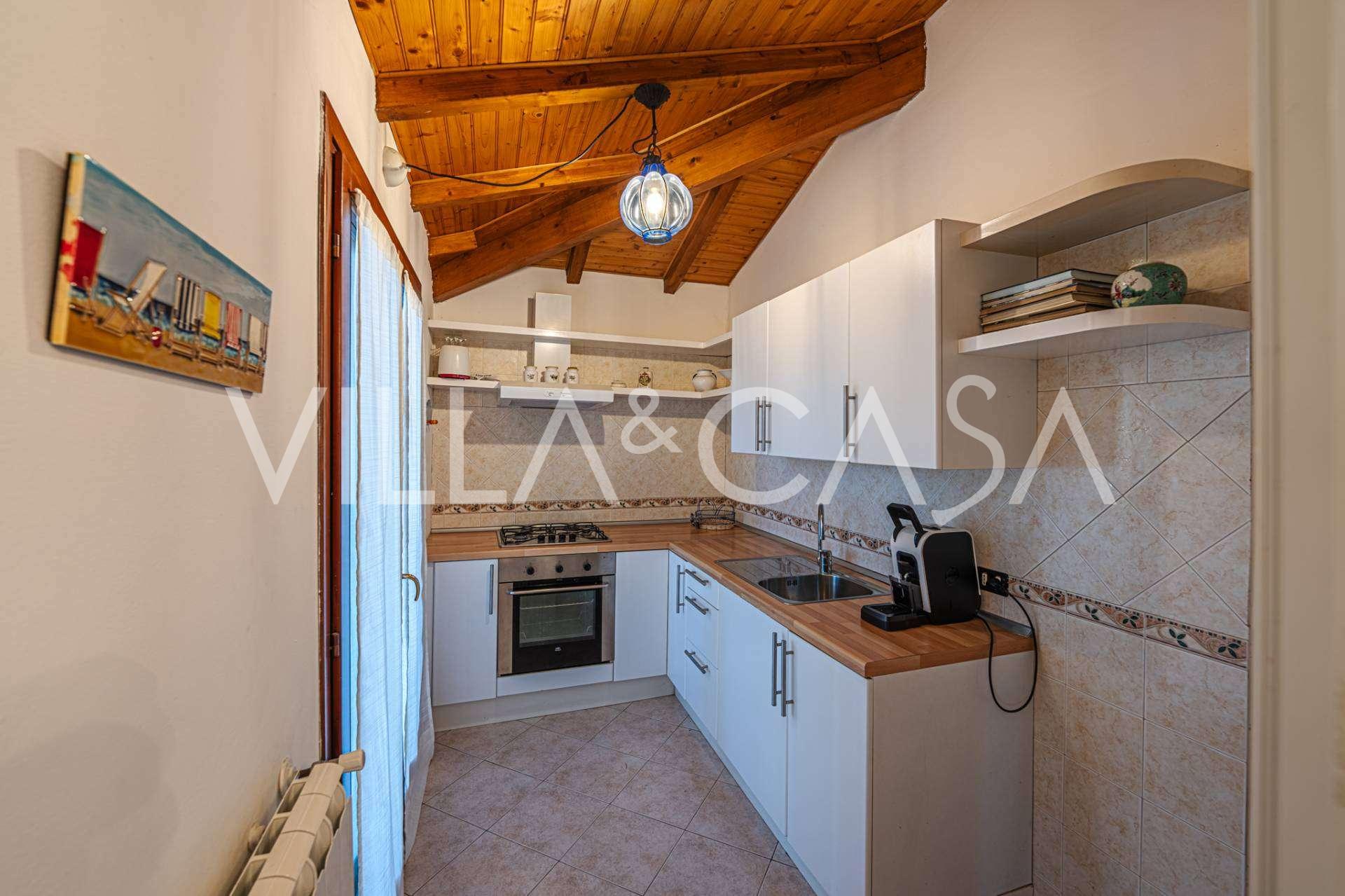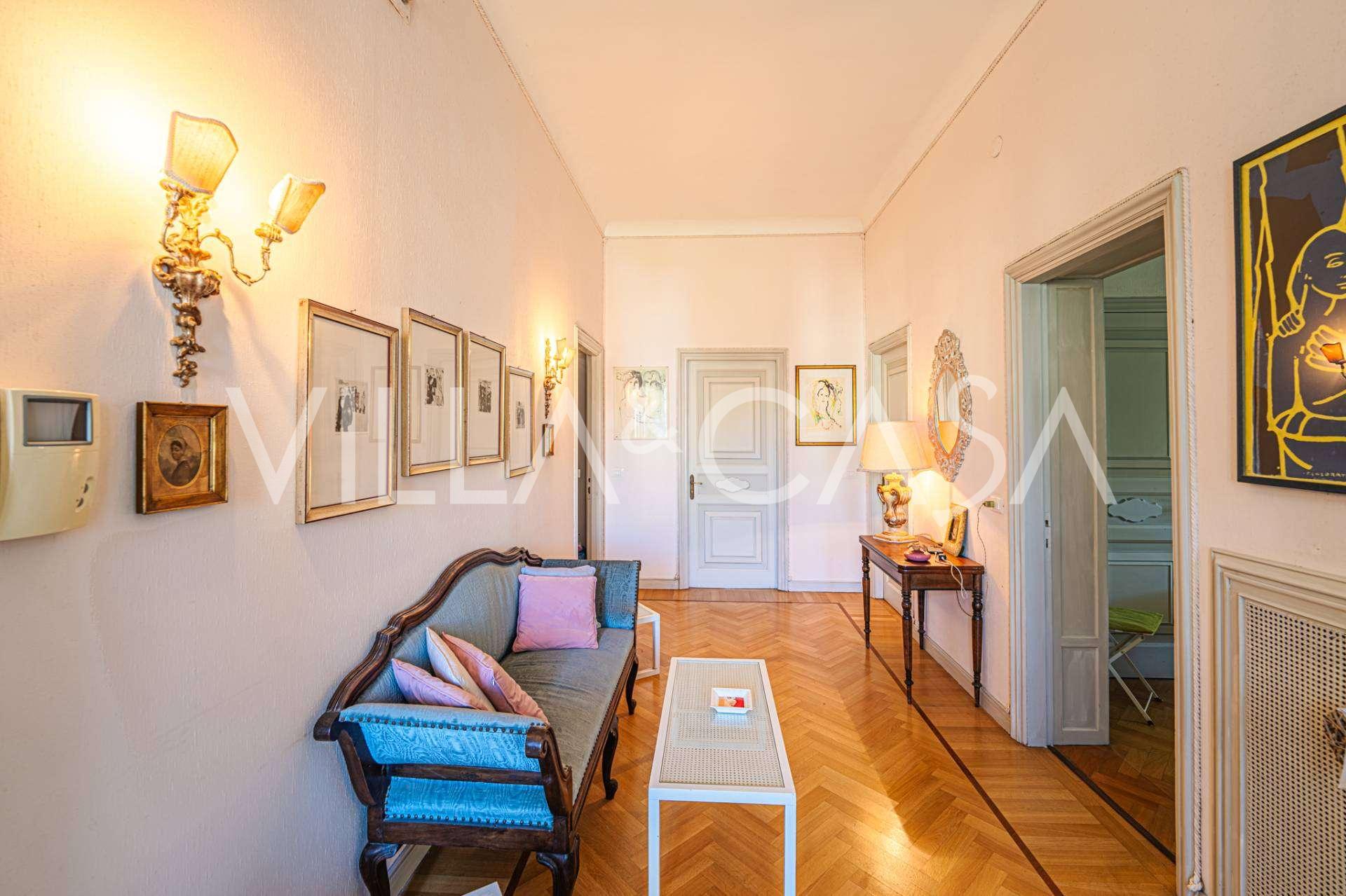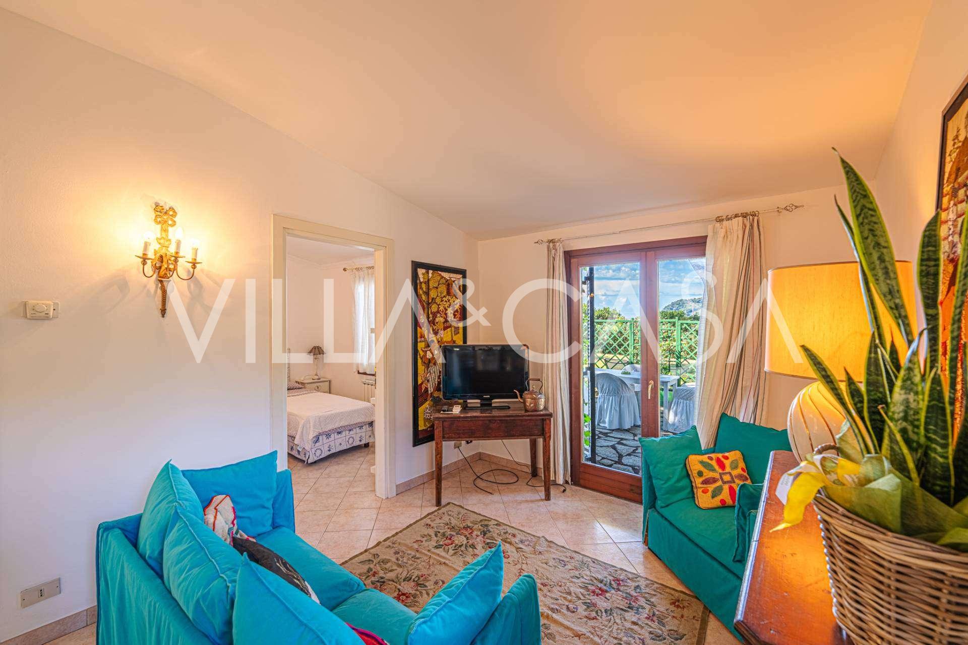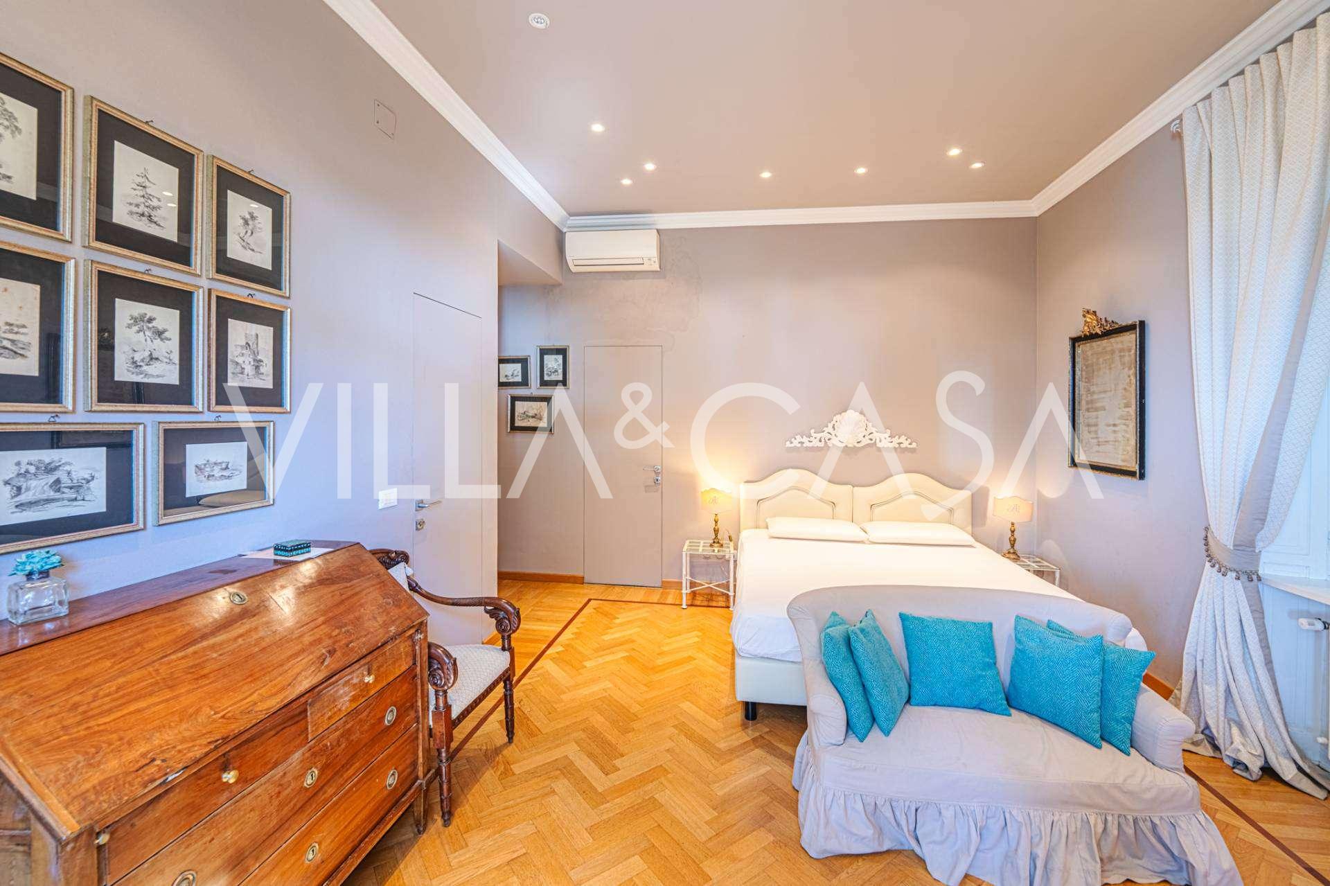 À vendre, une élégante villa en première ligne de mer à Diano Marina, conçue dans un style anglais, d'une superficie d'environ 628 m², répartie sur quatre niveaux. Elle dispose d'un accès direct à la mer et à une plage de sable. La villa est entourée d'un vaste parc d'environ 5000 m² avec des pins méditerranéens centenaires.