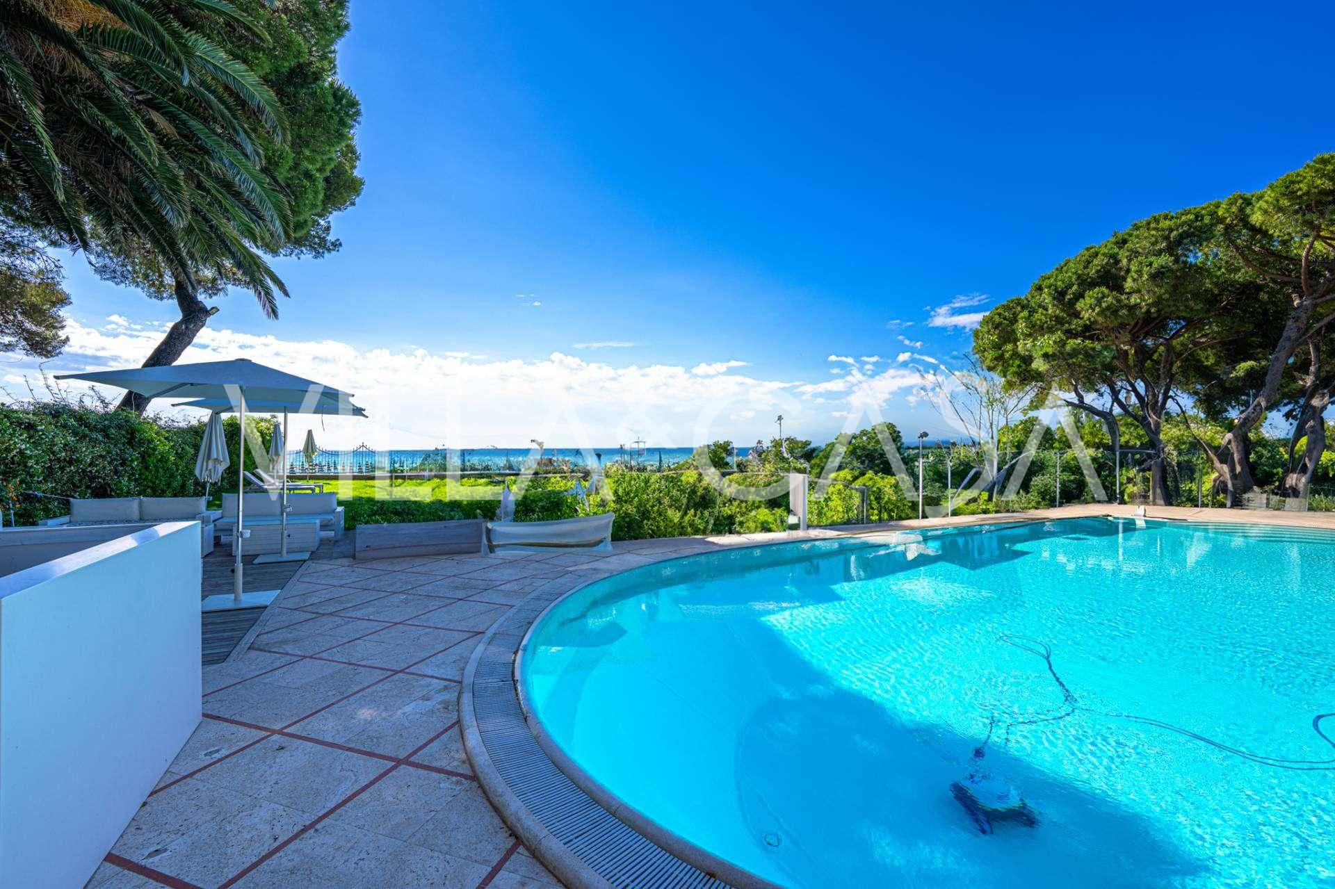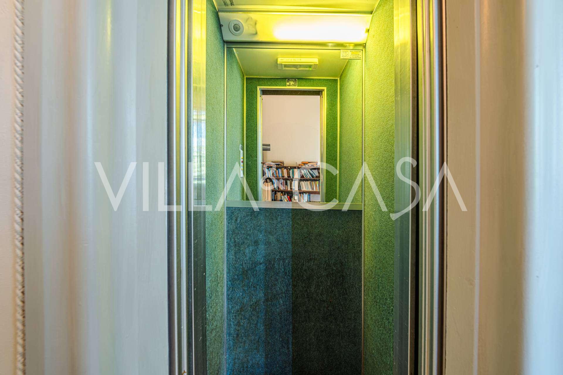 Premier niveau : entrée, couloir spacieux, ascenseur, grand salon avec cheminée donnant sur le parc et la plage, salon avec fenêtres panoramiques, hauteur sous plafond de 3,5 mètres, chambre avec accès au parc et à la terrasse couverte, salle de bains avec baignoire, cuisine séparée.