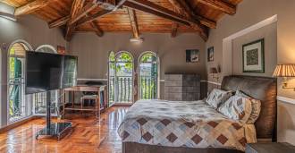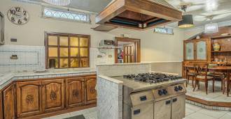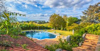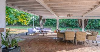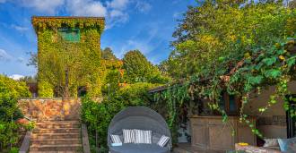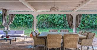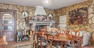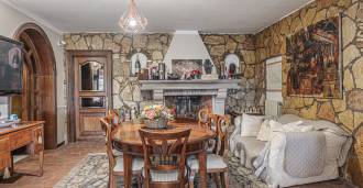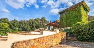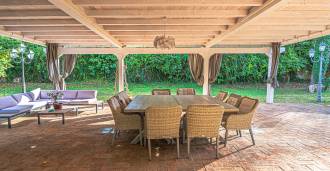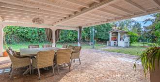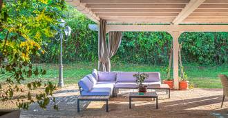 L'espace extérieur de la villa est une œuvre d'art à ciel ouvert. Deux terrasses panoramiques offrent des vues magnifiques sur les paysages d'Agro-Romano. Au centre du jardin se trouve une piscine design avec mosaïque bleue, entourée de fleurs parfumées et de verdure, un lieu où le luxe rencontre la nature. Une romantique escalier en pierre descend de l'ancienne tour recouverte de lierre vert. Un élégant pavillon avec un espace pour dîner en plein air, un bar près de la piscine et une zone barbecue transforment la villa en un lieu idéal pour les réceptions, les fêtes et le repos en toute intimité.