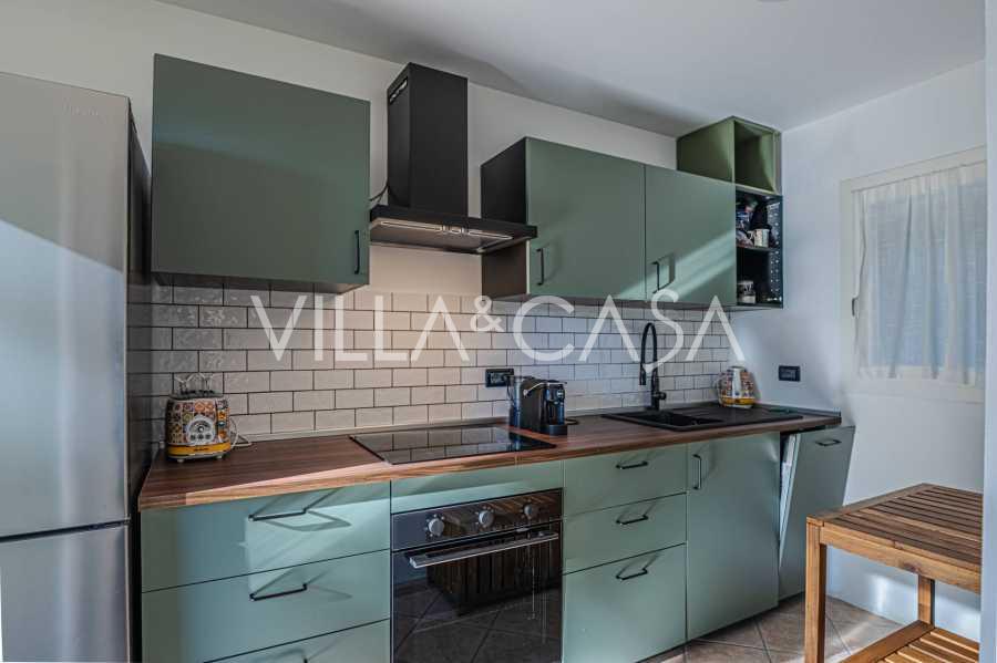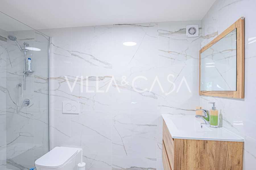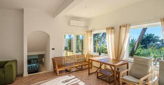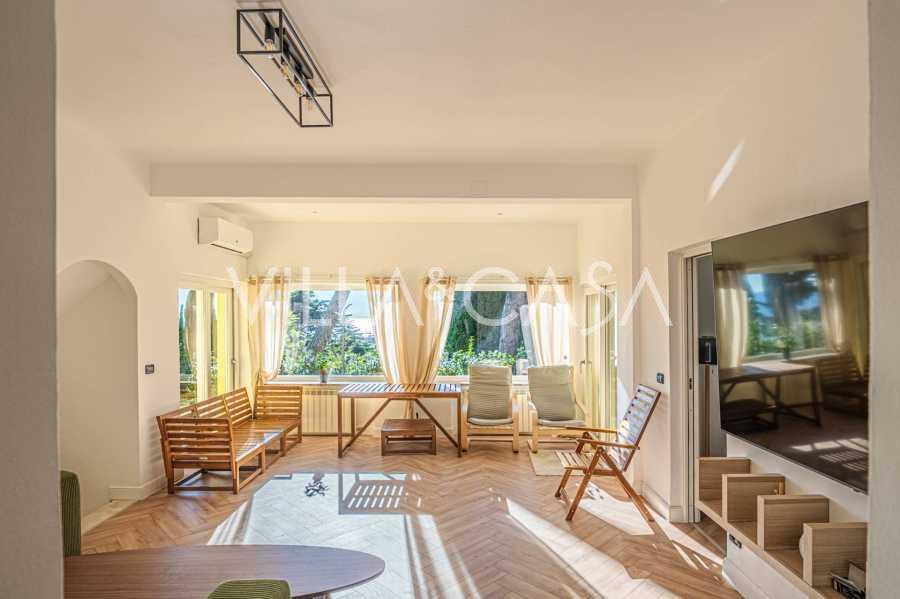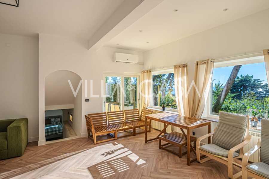 Au niveau principal, les invités sont accueillis par un hall lumineux et spacieux avec vue sur la mer. Le salon élégant, baigné de lumière naturelle, s'ouvre sur le jardin et la terrasse, idéal pour se détendre et recevoir des invités. La cuisine séparée est moderne et entièrement équipée. À ce niveau se trouvent également une salle de bain élégante et un charmant portique, parfait pour les repas en plein air avec vue sur la mer.