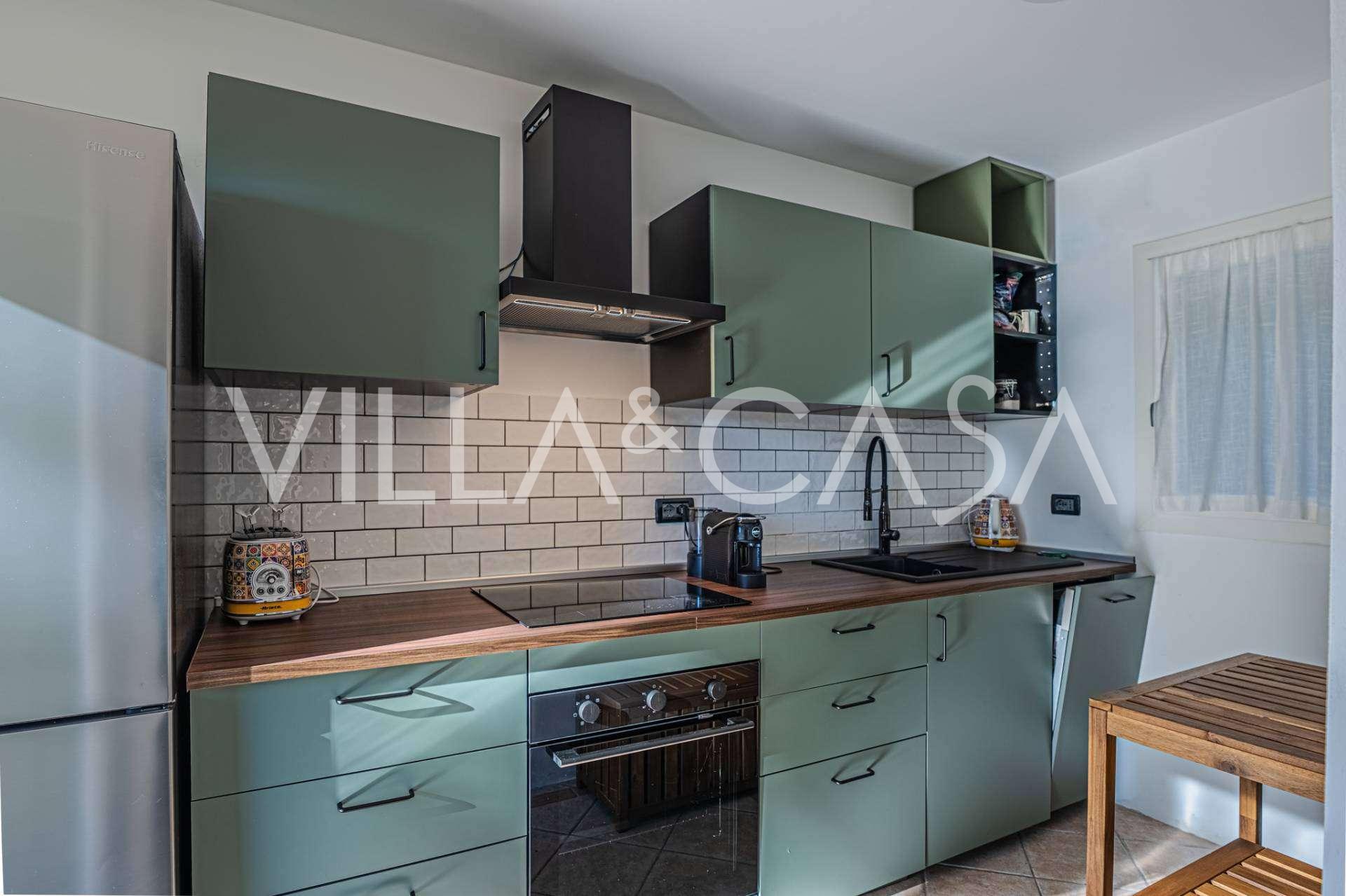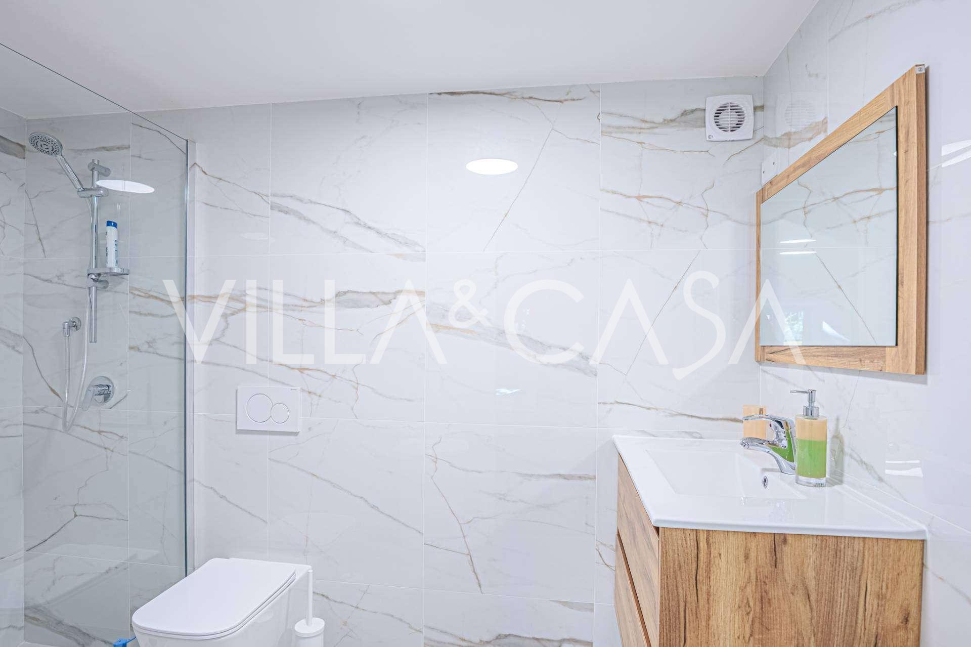 Au rez-de-chaussée, un vaste hall d'entrée accueille les invités avec vue sur la mer. Le salon élégant, avec accès au jardin et à la terrasse, est baigné de lumière naturelle et conçu pour la détente et les rencontres agréables. La cuisine moderne est entièrement équipée. On y trouve également une salle de bain élégante et un charmant portique, idéal pour les repas en plein air avec vue sur la mer.