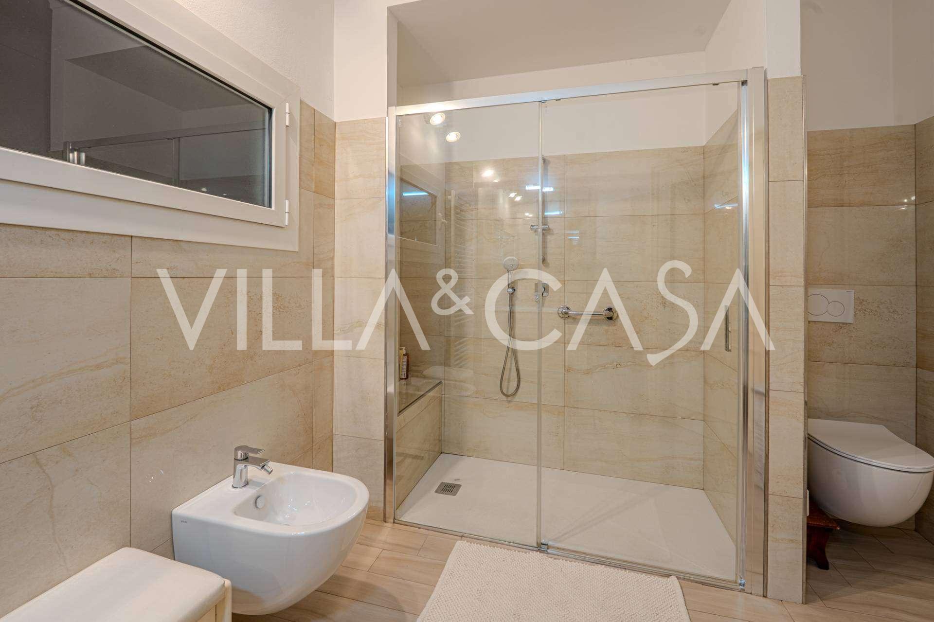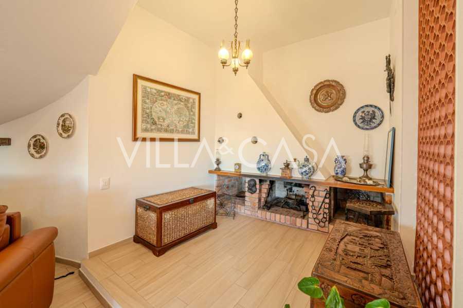 Au deuxième niveau : un grand salon avec cheminée et vue sur la mer, avec accès au jardin et au balcon. La cuisine offre également une vue sur la mer. Salle de bains.