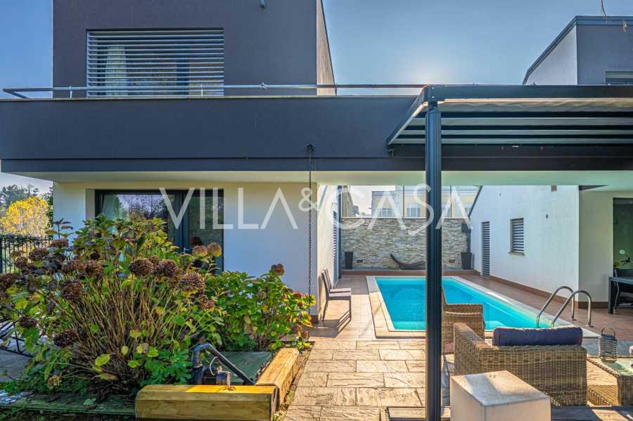 Au cœur de la ville de Ferrare, entourée de verdure bien entretenue, est proposée à la vente une maison moderne, construite en 2014, d'une superficie totale d'environ 360 m². Elle est divisée en deux parties indépendantes : la maison principale et une maison d'hôtes séparée. Elles sont reliées par une spacieuse terrasse commune au deuxième étage, créant une sensation d'espace unifié et offrant une vue magnifique sur le jardin et la zone de détente.